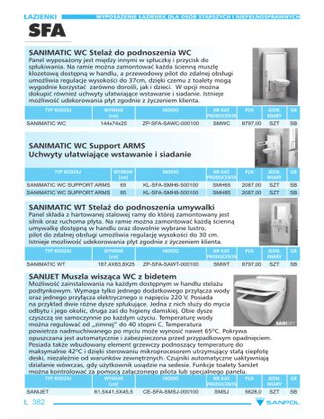 ŁAZIENKI WYPOSAŻENIE ŁAZIENEK DLA OSÓB STARSZYCH I NIEPEŁNOSPRAWNYCH SANIMATIC WC Stelaż do podnoszenia WC Panel wyposażony jest między innymi w spłuczkę i przycisk do spłukiwania. Na ramie można zamontować każda ścienną muszlę klozetową dostępną w handlu, a przewodowy pilot do zdalnej obsługi umożliwia regulacje wysokości do 37cm, dzięki czemu z toalety mogą wygodnie korzystać zarówno dorośli, jak i dzieci. W opcji można dokupić również uchwyty ułatwiające wstawanie i siadanie. Istnieje możliwość udekorowania płyt zgodnie z życzeniem klienta. TYP RODZAJ 6$1,0$7,&:& WYMIAR [cm] INDEKS NR KAT. PRODUCENTA [[ =36)$6$:& 60:& PLN JEDN. MIARY GR SZT SB JEDN. MIARY GR SANIMATIC WC Support ARMS Uchwyty ułatwiające wstawanie i siadanie TYP RODZAJ WYMIAR [cm] INDEKS NR KAT. PRODUCENTA PLN 6$1,0$7,&:&6833257$506 ./6)$60+ 60+ SZT SB 6$1,0$7,&:&6833257$506 ./6)$60+ 60+ SZT SB JEDN. MIARY GR SZT SB SANIMATIC WT Stelaż do podnoszenia umywalki Panel składa z hartowanej stalowej ramy do której zamontowany jest silnik oraz ruchoma płyta. Na ramie można zamontować każdą ścienną umywalkę dostępną w handlu oraz dowolnie wybrane lustro, pilot do zdalnej obsługi umożliwia regulację wysokości do 30 cm. Istnieje mozliwość udekorowania płyt zgodnie z życzeniem klienta. TYP RODZAJ 6$1,0$7,&:7 WYMIAR [cm] ;; INDEKS NR KAT. PRODUCENTA =36)$6$:7 SMWT PLN SANIJET Muszla wisząca WC z bidetem Możliwość zainstalowania na każdym dostępnym w handlu stelażu podtynkowym. Wymaga tylko jednego dodatkowego przyłącza wody oraz jednego przyłącza elektrycznego o napięciu 220 V. Posiada na przykład dwie różne dysze spłukujące. Jedna z nich służy do mycia odbytu i jego okolic, druga zaś do higieny damskiej. Obie dysze czyszczą sie samoczynnie po każdym użyciu. Temperaturę wody można regulować od „zimnej” do 40 stopni C. Temperatura powietrza nadmuchiwanego po myciu może wynosić nawet 65OC. Pokrywa opuszczana jest automatycznie i zabezpieczona przed przypadkowym opadnięciem. Posiada także wbudowany element grzewczy podnoszący temperaturę do maksymalnie 42OC i dzięki sterowaniu mikroprocesorem utrzymujący stałą ciepłotę deski, niezależnie od warunków zewnętrznych. Czujniki automatyczne uaktywniają działanie wówczas, gdy użytkownik usiądzie na sedesie. Funkcje toalety SaniJet można kontrolować za pomocą załączonego pilota lub specjalnego panelu. TYP RODZAJ SANIJET à WYMIAR [cm] INDEKS NR KAT. PRODUCENTA ;; &(6)$606- SMSJ PLN JEDN. MIARY GR SZT SB ŁAZIENKI WYPOSAŻENIE ŁAZIENEK DLA OSÓB STARSZYCH I NIEPEŁNOSPRAWNYCH SANISEAT Deska do WC z funkcją bidetu Można go zamontować na każdej muszli ceramicznej. Dodatkowo wymaga tylko jednego przyłącza wody i jednego przyłącza elektrycznego o napięciu 220/230 V. Dzięki najnowocześniejszej technologii urządzenie spełnia wszystkie najwyższe wymogi higieniczne. Wyposażona jest w dysze do higieny odbytu i dysze do higieny dla Pań. Obie dysze oczyszczają sie samoczynnie. Temperatury wody (do 40 oC) i powietrza (do 65 OC) mogą być regulowane zależnie od preferencji użytkownika. Deska pokryta jest powłoką antybakteryjną, wyposażoną w funkcje automatycznego opuszczania oraz element grzewczy. Stała temperatura (maksymalnie 42 oC). Tryb oszczędzania energii pozwala zaprogramować wyłączenie ogrzewania wody i powietrza na 3, 6 lub 9 godzin. TYP RODZAJ SANISEAT WYMIAR [cm] INDEKS NR KAT. PRODUCENTA PLN JEDN. MIARY GR ;; &(6)$6066 SMSS SZT SB SANIJET BIDET Nakładka bidetowa pod deskę TYP RODZAJ 6$1,-(7%,'(7 WYMIAR [cm] ŁAZIENKI Zestaw można łatwo zamontować na każdej muszli klozetowej, również najnowszej generacji. Wystarczy go przyśrubować i za pomocą dwóch przezroczystych wężyków połączyć z zaworami doprowadzającymi ciepłą i zimną wodę do łazienkowej umywalki. Funkcjami bidetu SaniJet można precyzyjnie sterować za pomocą umieszczonego z boku panelu. Można na nim zależnie od preferencji ustawić wybrane ciśnienie i temperaturę wody. Po uruchomieniu z urządzenia wysuwa się samoczynnie oczyszczająca się głowica natryskowa, rozpoczynając przyjemną higienę. INDEKS NR KAT. PRODUCENTA PLN JEDN. MIARY GR &(6)$60%, SMBIDET SZT SB à