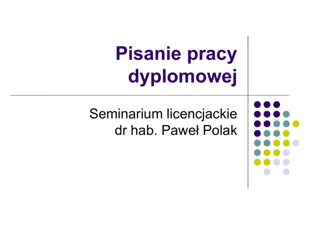 Pisanie pracy dyplomowej Seminarium licencjackie dr hab. Paweł Polak Plan zajęć Etapy pisania pracy Formułowanie problemu badawczego Logiczna konstrukcja pracy Strategie poszukiwania – wprowadzenie System archiwizacji ASAP Przypomnienie innych ważnych informacji o pracach dyplomowych na WF UPJPII Formułowanie problemu badawczego sformułuj CEL PRACY → teza pracy określ metodę analizy określ zakres źródeł (zawężenie tematu) Na tym etapie formułujemy (hipo)tezy badawcze, które będziemy starali się uzasadnić/obalić w pracy (np. czy falsyfikacjonizm K.R. Poppera jest kryptoindukcjonizmem) Praca koncentruje się wokół tez! Logiczna struktura pracy: WSTĘP Zadanie: krótkie i interesujące wprowadzenie do tematyki, powinno pokazać najważniejsze problemy (3-5 stron) Elementy: – – – wprowadzenie do tematyki krótka prezentacja dotychczasowego stanu badań (pokazuje znajomość zagadnienia) + ew. akapit o brakach prezentacja własnego zagadnienia badawczego: • • • • • • – motywy (przesłanki naukowe) sformułowanie problemu badawczego (pytania problemowe) cel pracy (opis / analiza / synteza / wyjaśnianie itp.) hipoteza/y badawcza/e określenie zakresu pracy z krótkim uzasadnieniem (metody badawcze) krótka charakterystyka logicznej struktury pracy Logiczna struktura pracy: ROZDZIAŁ Każdy rozdział musi być powiązany ze strukturą pracy Każdy rozdział analizuje jeden wybrany aspekt problemu ujętego we wstępie Struktura rozdziału: – – – – nawiązanie do struktury pracy prezentacja logicznej budowy rozdziału prezentacja podrozdziałów (i paragrafów) i ich związku z całością rozdziału krótkie podsumowanie (+ nawiązanie do kolejnych) Logiczna struktura pracy: ZAKOŃCZENIE Celem zakończenia jest zebranie wyników i odpowiedź na pytania zawarte we wstępie Struktura zakończenia: – – – szczegółowe (choć zwięzłe) odniesienie się do hipotez próba oceny stopnia realizacji celów badawczych (nie zawsze da się w pełni osiągnąć wszystkie cele → pokora!) prezentacja dalszych perspektyw badań (jakie zagadnienia warto podjąć w kolejnych pracach – to istotny element każdej pracy naukowej) Strategie wyszukiwania na początek: encyklopedie / słowniki dziedzinowe wyszukiwanie w wyszukiwarkach prac naukowych (bazy artykułów/cytowań): – – – Google Scholar (wszystkie dziedziny), ISI Web of Science (dominacja nauk ścisłych, ale jest nieco filozofii), CEJSH (The Central European Journal of Social Sciences and Humanities, http://cejsh.icm.edu.pl/ – nauki humanistyczne) bibliografie dziedzinowe i tematyczne zob. np Bibliografia Bibliografii Polskich: z lat 1971-1985, oraz od roku 1995. (Zob. także inne bazy biliograficzne BN). bibliografia zawartości czasopism http://www.bn.org.pl/katalogi-i-bibliografie/bibliografia-narodowa/bibliografia -zawartosci-czasopism popularne – – metody wyszukiwania analiza cytowań metoda „rosnącej perły” System ASAP (Akademicki System Archiwizacji Prac), czyli przygotowanie do obrony pracy portal: http://asap.upjp2.edu.pl/ Schemat organizacyjny źródło: opracowanie wewnętrzne UPJPII Przypomnienie podstawowych informacji o pracach dyplomowych Cel pracy = generalny sprawdzian umiejętności techniczne korzystanie z zasobów wiedzy umiejętność porządkowania myśli i znalezionych informacji (U. Eco „metodyka myślenia) U. Eco: „istotny jest nie temat, ale doświadczenie pisania” Budowa pracy • • • • • • • • • • • strona tytułowa (wzór w podręczniku) strona opisu pracy plan pracy (spis treści) wykaz skrótów [opcjonalnie] Wstęp Rozdziały (min. 3) Zakończenie Aneksy [opcjonalnie] Bibliografia spis rysunków, tabel [opcjonalnie] oświadczenia (udostępnianie pracy i oświadczenie samodzielności) Bibliografia • • • Styl opisu ustalamy z promotorem! Bibliografia musi być uporządkowana Większe bibliografie dzielimy np. następującoBIBLIOGRAFIA Źródła źródła podstawowe Opracowania źródła pomocnicze opracowania podstawowe opracowania pomocnicze Cztery oczywiste reguły (Eco) 1) Temat powinien odpowiadać zainteresowaniom studenta 2) Źródła powinny być osiągalne 3) Źródła powinny być dostępne 4) Ujęcie metodologiczne nie powinno wykraczać poza horyzonty studenta Konstruowanie tytułu • Krótki i precyzyjny (balans) – powinien dokładnie określać tematykę i zakres pracy – – – – • • • rzeczowy podmiotowy przestrzenny czasowy Temat musi być zgodny z zawartością pracy! Temat musi być poprawny językowo Temat musi być czytelny (źle: banalny, wydumane porównania, itp.) Wybór rodzaju pracy • • • monograficzna vs przeglądowa historyczna vs teoretyczna zagadnienia dawne vs współczesne („autor współczesny jest zawsze trudniejszy”, U. Eco) Układ strony • • • • • • • marginesy 2-2,5 cm margines na oprawę 1 cm (lub ew. margines lewy 4,5 cm, prawy 2 cm) druk jednostronny justowanie interlinia (1,5) numerowanie stron (strona tytułowa bez numeru, ale wliczana) przypisy dolne (w numeracji ciągłej lub numerowane w obrębie rozdziałów [przy dużej liczbie]) Podstawowe wymogi typograficzne • • akapity (wcięcia zamiast odstępów między akapitami) czcionka – tytuły – bezszeryfowa, – tekst – szeryfowa (np. Times New Roman, Garamond), 12 pt • wyróżnienia: – – • pogrubienie (bold) kursywa osobno numerujemy tabele, rysunki, zdjęcia – każdy rodzaj posiada własną numerację! Oprawa, załączniki i podania (uwaga może ulec zmianie!) • • oprawa egzemplarza archiwalnego (wielkość okładki nie może przekraczać formatu A4, praca spięta w sposób trwały) płyta CD z zapisaną pracą dyplomową (format pliku DOC) w kopercie. Płytę należy umieścić wewnątrz pracy, na okładce, w doklejonej do niej kopercie formatu K-10 (127*127 mm). Płyta CD musi być opisana. W opisie należy zawrzeć: – – – – – – – • • imię