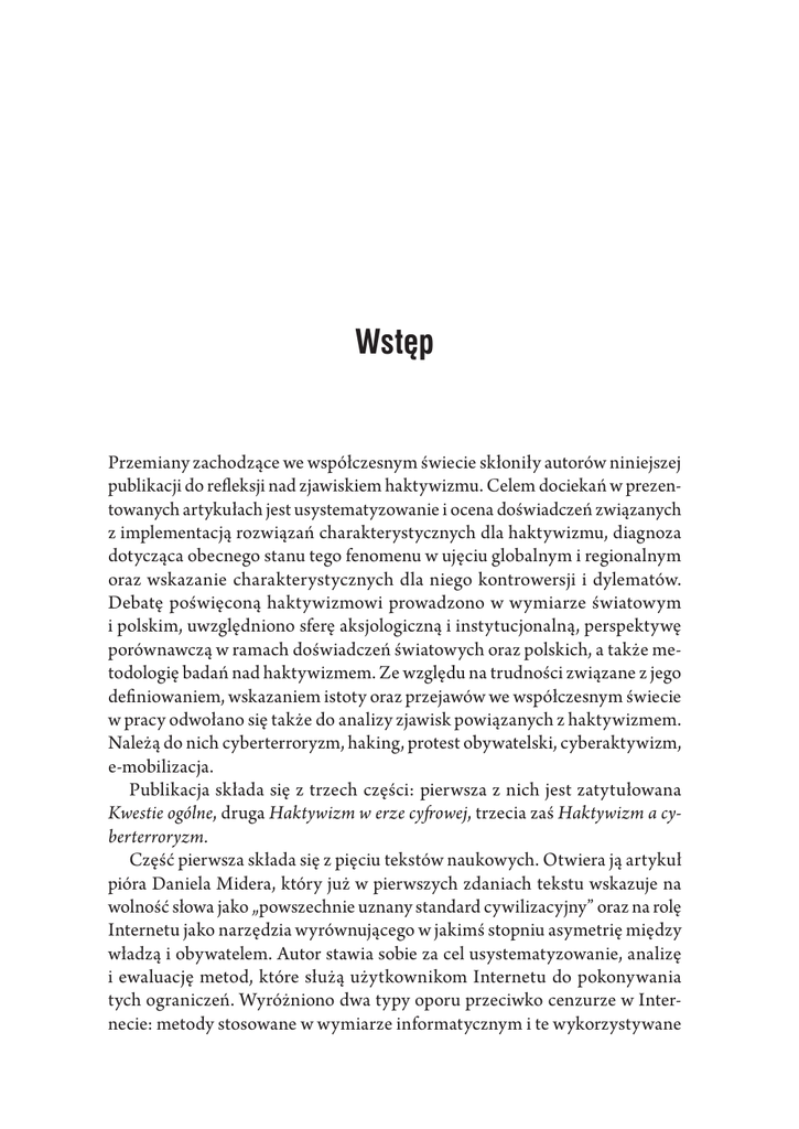 Wstęp Przemiany zachodzące we współczesnym świecie skłoniły autorów niniejszej publikacji do refleksji nad zjawiskiem haktywizmu. Celem dociekań w prezentowanych artykułach jest usystematyzowanie i ocena doświadczeń związanych z implementacją rozwiązań charakterystycznych dla haktywizmu, diagnoza dotycząca obecnego stanu tego fenomenu w ujęciu globalnym i regionalnym oraz wskazanie charakterystycznych dla niego kontrowersji i dylematów. Debatę poświęconą haktywizmowi prowadzono w wymiarze światowym i polskim, uwzględniono sferę aksjologiczną i instytucjonalną, perspektywę porównawczą w ramach doświadczeń światowych oraz polskich, a także metodologię badań nad haktywizmem. Ze względu na trudności związane z jego definiowaniem, wskazaniem istoty oraz przejawów we współczesnym świecie w pracy odwołano się także do analizy zjawisk powiązanych z haktywizmem. Należą do nich cyberterroryzm, haking, protest obywatelski, cyberaktywizm, e-mobilizacja. Publikacja składa się z trzech części: pierwsza z nich jest zatytułowana Kwestie ogólne, druga Haktywizm w erze cyfrowej, trzecia zaś Haktywizm a cyberterroryzm. Część pierwsza składa się z pięciu tekstów naukowych. Otwiera ją artykuł pióra Daniela Midera, który już w pierwszych zdaniach tekstu wskazuje na wolność słowa jako „powszechnie uznany standard cywilizacyjny” oraz na rolę Internetu jako narzędzia wyrównującego w jakimś stopniu asymetrię między władzą i obywatelem. Autor stawia sobie za cel usystematyzowanie, analizę i ewaluację metod, które służą użytkownikom Internetu do pokonywania tych ograniczeń. Wyróżniono dwa typy oporu przeciwko cenzurze w Internecie: metody stosowane w wymiarze informatycznym i te wykorzystywane 8 Wstęp instytucjonalnie. W konkluzji autor zauważa, że walka przeciwko cenzurze w Internecie się nasila. W odniesieniu do przyszłości Internetu wskazano na trzy możliwe scenariusze wydarzeń. Piotr Tosiek przybliża wybrane kwestie obejmujące bezpieczeństwo systemów informatycznych w Europie w wymiarze prawnym. Analizowane są najważniejsze międzynarodowe i ponadnarodowe regulacje prawne przyjęte w ramach Rady Europy oraz Unii Europejskiej. Autor odnosi się także do próby stworzenia globalnego systemu współpracy w dziedzinie praw autorskich i pokrewnych. W konkluzji zwraca uwagę na to, że generalnie prawna regulacja bezpieczeństwa systemów informatycznych w Europie ma charakter rozproszony, zakres przedmiotowy istniejących norm prawnych nie jest jasny, współpraca państw europejskich w zakresie walki z cyberprzestępczością pozostaje w stadium początkowym, występuje powiązanie problemu bezpieczeństwa systemów informatycznych ze współpracą o charakterze międzyrządowym, a w zakresie zwalczania cyberprzestępczości państwa często nie wykazują woli pogłębiania współpracy. Punktem wyjścia dla rozważań prezentowanych przez Marię Marczewską-Rytko jest uznanie, że tradycyjny sposób głosowania w lokalach wyborczych ma alternatywę w postaci głosowania elektronicznego. Autorka podejmuje próbę analizy dyskursu publicznego w Polsce w zakresie bezpieczeństwa głosowania elektronicznego. Przedmiotem zainteresowania są argumenty dostarczane zarówno przez zwolenników, jak i przeciwników tej formy głosowania. Analizie poddano wypowiedzi, opinie, oceny, interpretacje czy też zalecenia prezentowane przez naukowców, dziennikarzy, publicystów, polityków, ekspertów oraz osoby zainteresowane wykorzystaniem nowoczesnej infrastruktury informatycznej w procesie wyborczym. W konkluzji autorka stwierdza, że w dyskursie publicznym dominują dwa główne stanowiska odnośnie do głosowania elektronicznego: pozytywne i negatywne, a ich zwolennikami są uczestnicy dyskursu publicznego niezależnie od posiadanej wiedzy, kwalifikacji, pozycji w systemie stratyfikacji społecznej. Przedmiotem namysłu Marty du Vall jest zjawisko infoaktywizmu, stanowiące odmianę cyberaktywizmu. Pod tym pojęciem autorka rozumie formę kształcenia nieformalnego, „która wykorzystuje demokratyczny potencjał Internetu i innych technologii informacyjno-komunikacyjnych oraz społeczności nowego typu (wirtualnych) i tym samym przekształca dotychczasowe scentralizowane struktury społeczne”. Cel artykułu stanowi analiza głównych internetowych narzędzi tworzenia i wymiany informacji w obiegu ruchów obywatelskich i aktywizmu on-line. W konkluzji autorka stwierdza, że Wstęp 9 zanika podział na dostawców i odbiorców informacji, oraz wskazuje na takie cechy strategii komunikacyjnych jak wiarygodność informacji, monitorowanie i raportowanie. Tę część rozważań zamyka artykuł Doroty Maj poświęcony nowym ruchom społecznym jako podmiotom e-mobilizacji w warunkach procesów globalizacji. Autorka weryfikuje hipotezę, zgodnie z którą „nowe ruchy społeczne można uznać za formę komunikacji czy też przekazu kierowanego do społeczeństwa”. Przywołuje kilka przykładów nowych ruchów społecznych. W konkluzji autorka zwraca uwagę na fakt, że nowe ruchy społeczne wykorzystują w swojej działalności zarówno tradycyjne sposoby prowadzenia akcji protestacyjnych, jak i alternatywne formy ekspresji kulturalnej. Podkreśla także odwoływanie się do nowych narzędzi technologicznych, w tym Internetu. W części drugiej – Haktywizm w erze cyfrowej – zamieszczonych jest dziewięć artykułów naukowych. Obejmują one problematykę haktywizmu w wymiarze teoretycznym i praktycznym. Punktem wyjścia dla rozważań prezentowanych przez Andrzeja Chodubskiego jest zdefiniowanie haktywizmu jako ruchu kulturowo-cywilizacyjnego, który polega na łączeniu aktywności politycznej z osiągnięciami technologicznymi „w celu manifestowania sprzeciwu wobec działań w przestrzeni szeroko rozumianej polityki”. Autor postrzega haktywizm jako zjawisko polityczne w warunkach cywilizacji informacyjnej, a w