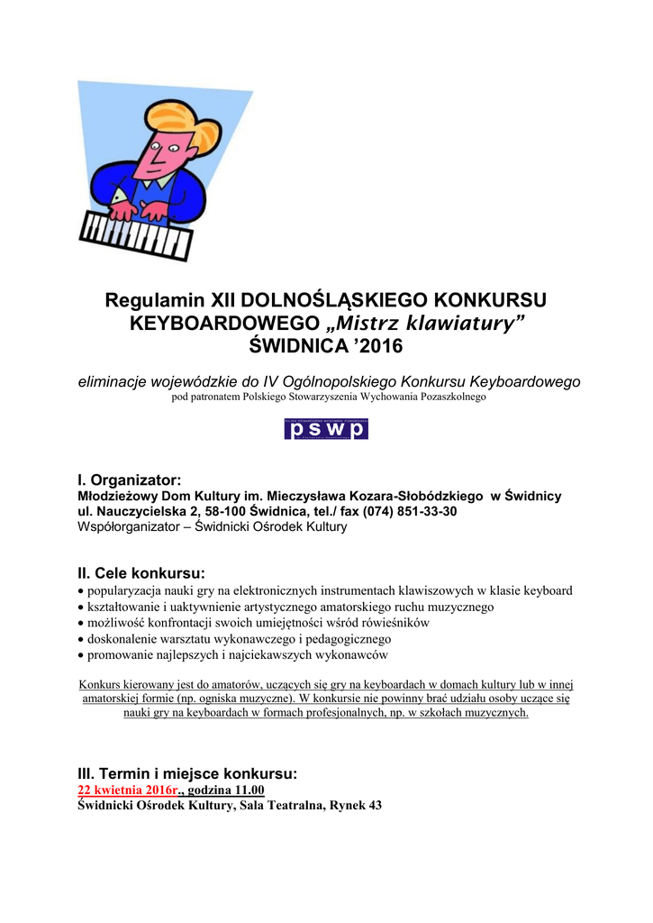 Regulamin XII DOLNOŚLĄSKIEGO KONKURSU KEYBOARDOWEGO „Mistrz klawiatury” ŚWIDNICA ’2016 eliminacje wojewódzkie do IV Ogólnopolskiego Konkursu Keyboardowego pod patronatem Polskiego Stowarzyszenia Wychowania Pozaszkolnego I. Organizator: Młodzieżowy Dom Kultury im. Mieczysława Kozara-Słobódzkiego w Świdnicy ul. Nauczycielska 2, 58-100 Świdnica, tel./ fax (074) 851-33-30 Współorganizator – Świdnicki Ośrodek Kultury II. Cele konkursu: popularyzacja nauki gry na elektronicznych instrumentach klawiszowych w klasie keyboard kształtowanie i uaktywnienie artystycznego amatorskiego ruchu muzycznego możliwość konfrontacji swoich umiejętności wśród rówieśników doskonalenie warsztatu wykonawczego i pedagogicznego promowanie najlepszych i najciekawszych wykonawców Konkurs kierowany jest do amatorów, uczących się gry na keyboardach w domach kultury lub w innej amatorskiej formie (np. ogniska muzyczne). W konkursie nie powinny brać udziału osoby uczące się nauki gry na keyboardach w formach profesjonalnych, np. w szkołach muzycznych. III. Termin i miejsce konkursu: 22 kwietnia 2016r., godzina 11.00 Świdnicki Ośrodek Kultury, Sala Teatralna, Rynek 43 IV. Warunki udziału: 1. Konkurs adresowany jest do solistów. Zdobywca Grand Prix z roku 2015 nie może w tym roku brać udziału w konkursie, ale jest automatycznie nominowany pozakonkursowo do etapu ogólnopolskiego (warunek: nie zdobył Grand Prix na III Ogólnopolskim Konkursie Keyboardowym Bytom'2015) Uwaga!Wskazane jest, aby każda placówka przeprowadziła eliminacje wstępne w swoim rejonie, typując 4 najlepszych wykonawców (najlepiej po jednym z każdej kategorii). Do przesłuchań dopuszczani są uczestnicy spoza województwa dolnośląskiego. 2. Warunkiem udziału jest przygotowanie dwóch utworów dowolnych, trwających łącznie do 8 minut, wykonywanych samodzielnie podczas konkursu (wskazane zróżnicowanie utworów pod względem charakteru, przeznaczenia, stylu itp.) 3. Utwory powinny być wykonywane z pamięci. 4. Zgłoszony repertuar nie może ulec zmianie. 5. Uczestnicy grają na własnych instrumentach, organizator zapewnia statyw i nagłośnienie. W przypadku dużej ilości zgłoszeń organizatorzy zastrzegają sobie prawo wysłuchania tylko jednego wskazanego utworu. 6. Uczestnicy konkursu nadsyłają karty zgłoszenia do 14 kwietnia 2016r. na adres: Młodzieżowy Dom Kultury w Świdnicy, ul. Nauczycielska 2, 58-100 Świdnica, bądź faksem: (74) 851-33-30 lub e-mail: [email protected] z dopiskiem Konkurs Keyboardowy oraz wnoszą w dniu konkursu opłatę organizatorom – cegiełkę na rzecz Komitetu Rodzicielskiego przy MDK w Świdnicy w kwocie 20 zł / uczestnikom organizator zapewnia poczęstunek / V. Kategorie wykonawcze: I uczniowie kl. 0-III SP (6 – 9 lat) II uczniowie kl. IV-VI SP (10 – 13 lat) III uczniowieszkół gimnazjalnychi ponadgimnazjalnych (14 – 19 lat) (W zależności od rodzaju zgłoszeń podział kategorii może ulec zmianie) VI. Ocena i nagrody: 1. Uczestnicy walczyć będą o nagrodę Grand Prix oraz tytuł „Mistrza Klawiatury” w poszczególnych kategoriach wiekowych. 2. Jury, powołane przez organizatorów, oceniać będzie: dobór repertuaru, umiejętności techniczne wykonawcy (gra techniką keyboardową!), stopień wykorzystania możliwości keyboardu (ale bez użycia sekwencera, dyskietek, USB itp.), własną interpretację, ogólny wyraz artystyczny. Gra z nut niewskazana. 3. Organizatorzy przewidują nagrody dla laureatów konkursu, ufundowane przez sponsorów. 4. Wszyscy uczestnicy konkursu otrzymają pamiątkowe dyplomy. Finaliści konkursu otrzymują nominacje do konkursu ogólnopolskiego, który odbędzie się najpóźniej do 20 czerwca 2016r. w wybranej przez zarząd PSWP placówce wychowania pozaszkolnego. VII. Sprawy organizacyjne: 1. Dojazd i wyżywienie we własnym zakresie. 2. Zgłoszenie udziału w konkursie jest równoznaczne z wyrażeniem zgody na nieodpłatne prawo do rejestracji dowolną techniką zapisu i wykorzystanie zarejestrowanego materiału do celów edukacyjnych i popularyzatorskich. 3. Nadesłanie karty zgłoszenia jest równoważne z przyjęciem niniejszego regulaminu. 4. Dokładne informacje o konkursie wraz z kartą zgłoszenia dostępne są na stronie internetowej organizatorów: www.mdk.swidnica.pl 5. Wszelkich dodatkowych informacji udziela koordynator konkursu Agnieszka Banach- tel. (0-74) 851-27-56 lub [email protected] VIII. Uwagi końcowe: 1. Sprawy nie ujęte w regulaminie rozstrzyga organizator. 2. Organizatorzy i jury zastrzegają sobie prawo ostatecznej interpretacji niniejszego regulaminu oraz możliwość nie przyznania jakiejś z nagród. IX. Wzór karty zgłoszenia (w załączniku) Karta zgłoszenia powinna zawierać: Imię i nazwisko, klasę-typ szkoły-wiek, kategorię, adres (ulica, kod, miejscowość, tel.), tytuł pierwszego utworu, kompozytor, tytuł drugiego utworu, kompozytor, czas trwania poszczególnych prezentacji, potrzeby techniczne, podpis. Alternatywnie: imię i nazwisko instruktora, instytucję delegującą oraz wyrażenie zgody na przetwarzanie danych osobowych przez organizatorów konkursu i wykorzystanie do celów promocyjnych placówki materiałów filmowych i fotograficznych wykonanych podczas konkursu. Serdecznie zapraszamy !!!!!!! XII DOLNOŚLĄSKI KONKURS KEYBOARDOWY „Mistrz klawiatury’2016” Młodzieżowy Dom Kultury im. Mieczysława Kozara-Słobódzkiego w Świdnicy 22 kwietnia 2016 KARTA ZGŁOSZENIA(prosimy wypełnić czytelnie drukowanymi literami) XII DOLNOŚLĄSKI KONKURS KEYBOARDOWY „Mistrz klawiatury” ŚWIDNICA’2016 1. IMIĘ I NAZWISKO SOLISTY ……………………………............................................................................................ 2. KATEGORIA – I.kl.0-III SP(do 9 lat),II kl.IV-VI SP (10-13 lat),III uczniowie szkół gimnazjalnych i ponadgimnazjalnych(14-19 lat) Klasa, typ szkoły, wiek:……………………………………..