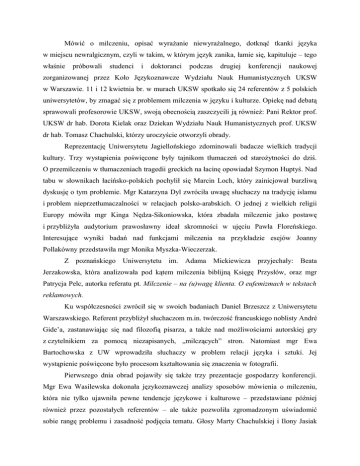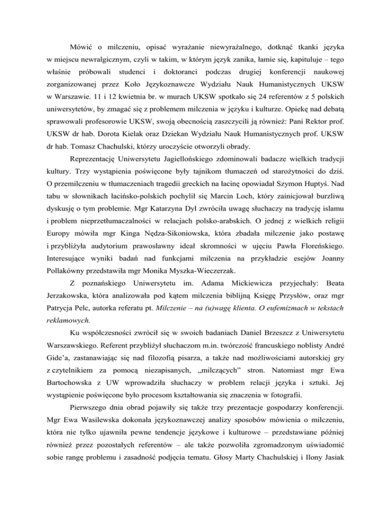 Mówić o milczeniu, opisać wyrażanie niewyrażalnego, dotknąć tkanki języka w miejscu newralgicznym, czyli w takim, w którym język zanika, łamie się, kapituluje – tego właśnie próbowali studenci i doktoranci podczas drugiej konferencji naukowej zorganizowanej przez Koło Językoznawcze Wydziału Nauk Humanistycznych UKSW w Warszawie. 11 i 12 kwietnia br. w murach UKSW spotkało się 24 referentów z 5 polskich uniwersytetów, by zmagać się z problemem milczenia w języku i kulturze. Opiekę nad debatą sprawowali profesorowie UKSW, swoją obecnością zaszczycili ją również: Pani Rektor prof. UKSW dr hab. Dorota Kielak oraz Dziekan Wydziału Nauk Humanistycznych prof. UKSW dr hab. Tomasz Chachulski, którzy uroczyście otworzyli obrady. Reprezentację Uniwersytetu Jagiellońskiego zdominowali badacze wielkich tradycji kultury. Trzy wystąpienia poświęcone były tajnikom tłumaczeń od starożytności do dziś. O przemilczeniu w tłumaczeniach tragedii greckich na łacinę opowiadał Szymon Huptyś. Nad tabu w słownikach łacińsko-polskich pochylił się Marcin Loch, który zainicjował burzliwą dyskusję o tym problemie. Mgr Katarzyna Dyl zwróciła uwagę słuchaczy na tradycję islamu i problem nieprzetłumaczalności w relacjach polsko-arabskich. O jednej z wielkich religii Europy mówiła mgr Kinga Nędza-Sikoniowska, która zbadała milczenie jako postawę i przybliżyła audytorium prawosławny ideał skromności w ujęciu Pawła Floreńskiego. Interesujące wyniki badań nad funkcjami milczenia na przykładzie esejów Joanny Pollakówny przedstawiła mgr Monika Myszka-Wieczerzak. Z poznańskiego Uniwersytetu im. Adama Mickiewicza przyjechały: Beata Jerzakowska, która analizowała pod kątem milczenia biblijną Księgę Przysłów, oraz mgr Patrycja Pelc, autorka referatu pt. Milczenie – na (u)wagę klienta. O eufemizmach w tekstach reklamowych. Ku współczesności zwrócił się w swoich badaniach Daniel Brzeszcz z Uniwersytetu Warszawskiego. Referent przybliżył słuchaczom m.in. twórczość francuskiego noblisty André Gide’a, zastanawiając się nad filozofią pisarza, a także nad możliwościami autorskiej gry z czytelnikiem za pomocą niezapisanych, „milczących” stron. Natomiast mgr Ewa Bartochowska z UW wprowadziła słuchaczy w problem relacji języka i sztuki. Jej wystąpienie poświęcone było procesom kształtowania się znaczenia w fotografii. Pierwszego dnia obrad pojawiły się także trzy prezentacje gospodarzy konferencji. Mgr Ewa Wasilewska dokonała językoznawczej analizy sposobów mówienia o milczeniu, która nie tylko ujawniła pewne tendencje językowe i kulturowe – przedstawiane później również przez pozostałych referentów – ale także pozwoliła zgromadzonym uświadomić sobie rangę problemu i zasadność podjęcia tematu. Głosy Marty Chachulskiej i Ilony Jasiak korespondowały natomiast z wypowiedziami badaczy z Krakowa. Obie studentki zajęły się milczeniem w tragedii greckiej na przykładach tekstów Ajschylosa i Eurypidesa. W drugim dniu sesji konferencyjnej uwagę poświęcono m.in. plastycznym wyrazom milczenia. Elwira Rzepka z Uniwersytetu Marii Skłodowskiej-Curie dowiodła, że w tekstach kreatywnych milczenie wiąże się z błękitem i bielą, a mgr Kinga Kowza z UKSW skupiła się na malarstwie i utworach muzycznych, w których doszukiwała się przejawów ciszy i milczenia. W utworach słowno-muzycznych materiału do analiz szukała Iwona Bielska (UKSW). Referentkę zainteresowały teksty wykonywane przez zespół Kult i wyjątkowy w nich obraz kobiety, rysowany m.in. za pomocą przemilczeń i niedopowiedzeń. Największą część wtorkowych wystąpień stanowiły jednak analizy utworów lirycznych i prozy, które podjęli studenci i doktoranci UKSW. Twórczość Cypriana Norwida, w najwyższym stopniu realizująca „poetykę milczenia”, zainteresowała Beatę Paszkowską i Milenę Płoszaj. Milczenie stanowiące wyraz dojrzałości filozoficznej i narzędzie kunsztu poetyckiego przedstawiła też Aleksandra Piszko, opisując świat Sonetów krymskich Adama Mickiewicza. Dwóch prelegentów omawiało milczenie w poezji współczesnej: mgr Daniel Ciesielski wystąpił z referatem o tekstach Marcina Świetlickiego, a Piotr Szcześniak zajął się twórczością Tadeusza Dąbrowskiego, ukazując ją w kontekście filozofii XX wieku, m.in. Heideggera. Wstrząsająca relacja mgr Aleksandry Karkowskiej z badań nad listami z getta była świadectwem wyjątkowego ciężaru znaczeniowego milczenia w czasach okupacji. Badaczka korespondencji warszawskiej rodziny Halperson z lat 1939-1942 rozważała, jakie mechanizmy językowe, kulturowe i psychologiczne działały w czasach wojny, skoro milczenie było niejednokrotnie warunkiem z przeżycia. O tym, że milczenie może zawierać więcej treści niż słowo, mówiła Ewelina Stachura. Milczący bohater XIX-wiecznej noweli Melville’a, Bartleby, posłużył referentce do postawienia pytania o obecność sensu w ludzkim życiu i o rolę literatury w jego poszukiwaniu. Inny rodzaj milczenia odnalazła w prozie Laurence’a Sterne’a Katarzyna Bałdyga, stawiając zagadnienie gry pisarza z czytelnikiem. Ciekawym wystąpieniem był referat Anny Czerwińskiej, która poruszyła problem tabu. Tym razem słuchacze zapoznali się z kodem językowym pieśni ludowych, służącym do mówienia o akcie seksualnym. Czym zatem jest milczenie? Czy można opisać je w sposób jednoznaczny? Czemu i komu służy przekazanie „pustego” komunikatu? II Ogólnopolska Studencko-Doktorancka Konferencja Naukowa „Milczenie w języku i kulturze” pozostaje otwarta, ponieważ postawione podczas sesji problemy dopiero teraz, po zderzeniu z innymi zagadnieniami, nabierają kształtów, a młodzi badacze decydują o dalszych kierunkach swoich dróg ku zrozumienia milczenia – tak bardzo obecnego i TAK ważnego w naszej kulturze. Koło Językoznawcze WNH UKSW dziękuje 