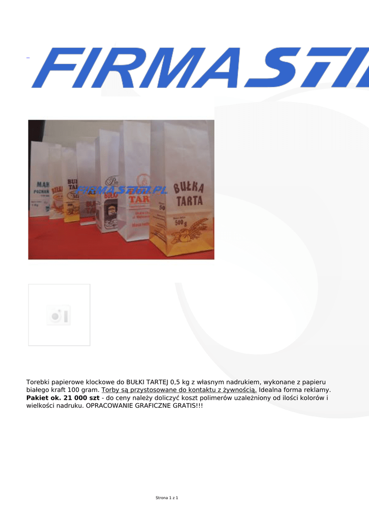 Torebki papierowe klockowe do BUŁKI TARTEJ 0,5 kg z własnym nadrukiem, wykonane z papieru białego kraft 100 gram. Torby są przystosowane do kontaktu z żywnością. Idealna forma reklamy. Pakiet ok. 21 000 szt - do ceny należy doliczyć koszt polimerów uzależniony od ilości kolorów i wielkości nadruku. OPRACOWANIE GRAFICZNE GRATIS!!! Strona 1 z 1