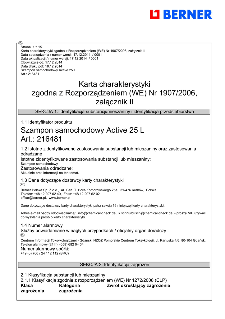 Strona 1 z 15 Karta charakterystyki zgodna z Rozporządzeniem (WE) Nr 1907/2006, załącznik II Data sporządzenia / numer wersji: 17.12.2014 / 0001 Data aktualizacji / numer wersji: 17.12.2014 / 0001 Obowiązuje od: 17.12.2014 Data druku pdf: 18.12.2014 Szampon samochodowy Active 25 L Art.: 216481 Karta charakterystyki zgodna z Rozporządzeniem (WE) Nr 1907/2006, załącznik II SEKCJA 1: Identyfikacja substancji/mieszaniny i identyfikacja przedsiębiorstwa 1.1 Identyfikator produktu Szampon samochodowy Active 25 L Art.: 216481 1.2 Istotne zidentyfikowane zastosowania substancji lub mieszaniny oraz zastosowania odradzane Istotne zidentyfikowane zastosowania substancji lub mieszaniny: Szampon samochodowy Zastosowania odradzane: Aktualnie brak informacji na ten temat. 1.3 Dane dotyczące dostawcy karty charakterystyki Berner Polska Sp. Z o.o., Al. Gen. T. Bora-Komorowskiego 25a, 31-476 Kraków, Polska Telefon: +48 12 297 62 40, Faks: +48 12 297 62 02 [email protected], www.berner.pl Dane dotyczące dostawcy karty charakterystyki patrz sekcja 16 niniejszej karty charakterystyki. Adres e-mail osoby odpowiedzialnej: [email protected], [email protected] - proszę NIE używać do wysyłania próśb o karty charakterystyki. 1.4 Numer alarmowy Służby powiadamiane w nagłych przypadkach / oficjalny organ doradczy : Centrum Informacji Toksykologicznej - Gdańsk. NZOZ Pomorskie Centrum Toksykologii, ul. Kartuska 4/6, 80-104 Gdańsk. Telefon alarmowy (24 h): (058) 682 04 04 Numer alarmowy spółki: +49 (0) 700 / 24 112 112 (BRC) SEKCJA 2: Identyfikacja zagrożeń 2.1 Klasyfikacja substancji lub mieszaniny 2.1.1 Klasyfikacja zgodnie z rozporządzeniem (WE) Nr 1272/2008 (CLP) Klasa Kategoria Zwrot określający zagrożenie zagrożenia zagrożenia Strona 2 z 15 Karta charakterystyki zgodna z Rozporządzeniem (WE) Nr 1907/2006, załącznik II Data sporządzenia / numer wersji: 17.12.2014 / 0001 Data aktualizacji / numer wersji: 17.12.2014 / 0001 Obowiązuje od: 17.12.2014 Data druku pdf: 18.12.2014 Szampon samochodowy Active 25 L Art.: 216481 Skin Irrit. Eye Dam. 2 1 H315-Działa drażniąco na skórę. H318-Powoduje poważne uszkodzenie oczu. 2.1.2 Klasyfikacja zgodnie z dyrektywami 67/548/EWG oraz 1999/45/WE (łącznie ze zmianami) Xi, Produkt drażniący, R36 2.2 Elementy oznakowania 2.2.1 Oznakowanie zgodnie z rozporządzeniem (WE) Nr 1272/2008 (CLP) Niebezpieczeństwo H315-Działa drażniąco na skórę. H318-Powoduje poważne uszkodzenie oczu. P280-Stosować rękawice ochronne i ochronę oczu/twarzy. P305+P351+P338-W PRZYPADKU DOSTANIA SIĘ DO OCZU: Ostrożnie płukać wodą przez kilka minut. Wyjąć soczewki kontaktowe, jeżeli są i można je łatwo usunąć. Nadal płukać. P310-Natychmiast skontaktować się z OŚRODKIEM ZATRUĆ/lekarzem. alkohol tłuszczowy, etoksylowany C16-18 nienasycony Czwartorzędowe związki amoniowe, chlorki C12-18 alkilo (hydroksyetylo) dimetylo amoniowe 2.3 Inne zagrożenia Mieszanina nie zawiera substancji vPvB (vPvB = very persistent, very bioaccumulative) bądź nie jest wykazana w załączniku XIII rozporządzenia (WE) 1907/2006. Mieszanina nie zawiera substancji PBT (PBT = persistent, bioaccumulative, toxic) bądź nie jest wykazana w załączniku XIII rozporządzenia (WE) 1907/2006. Rozporządzenie (WE) Nr 648/2004 mniej niż 5% kationowych środków powierzchniowo czynnych niejonowych środków powierzchniowo czynnych fosfonianów kompozycje zapachowe SEKCJA 3: Skład/informacja o składnikach 3.1 Substancja n.s. Strona 3 z 15 Karta charakterystyki zgodna z Rozporządzeniem (WE) Nr 1907/2006, załącznik II Data sporządzenia / numer wersji: 17.12.2014 / 0001 Data aktualizacji / numer wersji: 17.12.2014 / 0001 Obowiązuje od: 17.12.2014 Data druku pdf: 18.12.2014 Szampon samochodowy Active 25 L Art.: 216481 3.2 Mieszanina alkohol tłuszczowy, etoksylowany C16-18 nienasycony Numer rejestracji (REACH) Index EINECS, ELINCS, NLP CAS Stęż.% Klasyfikacja zgodnie z dyrektywą 67/548/EWG Klasyfikacja zgodnie z rozporządzeniem (WE) Nr 1272/2008 (CLP) Czwartorzędowe związki amoniowe, chlorki C12-18 alkilo (hydroksyetylo) dimetylo amoniowe Numer rejestracji (REACH) Index EINECS, ELINCS, NLP CAS Stęż.% Klasyfikacja zgodnie z dyrektywą 67/548/EWG Klasyfikacja zgodnie z rozporządzeniem (WE) Nr 1272/2008 (CLP) octan 2-tert-butylocykloheksylu Numer rejestracji (REACH) Index EINECS, ELINCS, NLP CAS Stęż.% Klasyfikacja zgodnie z dyrektywą 67/548/EWG Klasyfikacja zgodnie z rozporządzeniem (WE) Nr 1272/2008 (CLP) ---CAS 68920-66-1 1-5 Produkt drażniący, Xi, R41 Eye Dam. 1, H318 ---288-474-7 CAS 85736-63-6 1-<5 Produkt szkodliwy, Xn, R22 Produkt żrący, C, R34 Produkt szkodliwy, Xn, R48/22 Produkt niebezpieczny dla środowiska, N, R50 Acute Tox. 4, H302 Skin Corr. 1B, H314 STOT RE 2, H373 Aquatic Acute 1, H400 ---201-828-7 CAS 88-41-5 0,1-<1 Produkt niebezpieczny dla środowiska, N, R51 Produkt niebezpieczny dla środowiska, R53 Aquatic Chronic 2, H411 Tekst formuł R i H, a także ich kod klasyfikacji (GHS/CLP) patrz sekcja 16. Substancje wymienione w tym punkcie mają określoną faktycznie obowiązującą klasyfikację! W przypadku substancji wymienionych w załączniku VI, tabela 3.1/3.2 rozporządzenia (WE) nr 1272/2008 (rozporządzenie CLP) oznacza to, że zostały uwzględnione wszystkie ewentualne wymienione tam uwagi dla podanej tutaj klasyfikacji. SEKCJA 4: Środki pierwszej pomocy 4.1 Opis środków pierwszej pomocy Drogi oddechowe Osobie zapewnić dopływ świeżego powietrza, w zależności od objawów skonsultować się z lekarzem. Kontakt ze skórą Umyć dużą ilością wody, zanieczyszczone, nasączone ubranie niezwłocznie usunąć, natychmiast wezwać lekarza, mieć przy sobie informacje o produkcie. Kontakt z oczami Strona 4 z 15 Karta charakterystyki zgodna z Rozporządzeniem (WE) Nr 1907/2006, załącznik II Data sporządzenia / numer wersji: 17.12.2014 / 0001 Data aktualizacji / numer wersji: 17.12.2014 / 0001 Obowiązuje od: 17.12.2014 Da