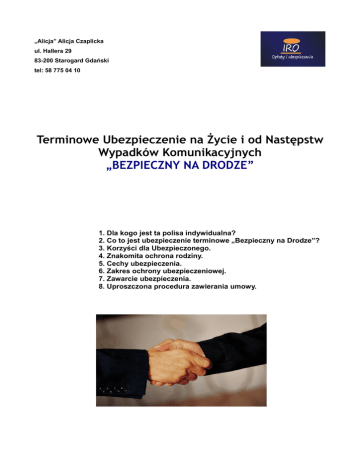„Alicja” Alicja Czaplicka ul. Hallera 29 83-200 Starogard Gdański tel: 58 775 04 10 Terminowe Ubezpieczenie na Życie i od Następstw Wypadków Komunikacyjnych „BEZPIECZNY NA DRODZE” 1. Dla kogo jest ta polisa indywidualna? 2. Co to jest ubezpieczenie terminowe „Bezpieczny na Drodze”? 3. Korzyści dla Ubezpieczonego. 4. Znakomita ochrona rodziny. 5. Cechy ubezpieczenia. 6. Zakres ochrony ubezpieczeniowej. 7. Zawarcie ubezpieczenia. 8. Uproszczona procedura zawierania umowy. „Alicja” Alicja Czaplicka ul. Hallera 29 83-200 Starogard Gdański tel: 58 775 04 10 1. Dla kogo jest ta polisa indywidualna? Terminowe Ubezpieczenie na Życie i od Następstw Wypadków Komunikacyjnych jest uniwersalną polisą ochronną, która zapewnia ochronę życia i zdrowia osoby ubezpieczonej. Do ubezpieczenia może przystąpić osoba pełnoletnia, posiadająca pełną zdolność do czynności prawnych i która nie ukończyła 64 lat. 2. Co to jest ubezpieczenie terminowe „Bezpieczny na Drodze”? Ubezpieczenie na Życie „Bezpieczny na Drodze” ma charakter terminowy, tzn. zawierane jest na czas określony, nie krótszy niż 1 rok, i nie dłuższy niż do końca roku polisowego, w którym Ubezpieczony ukończy 65 lat. Polisa „Bezpieczny na Drodze” jest przede wszystkim znakomitym, indywidualnym pakietem o charakterze ochronnym, w ramach którego, „POLISA-ŻYCIE” S.A. gwarantuje wypłatę określonej sumy ubezpieczenia w razie zgonu Ubezpieczonego, zgonu Ubezpieczonego w wyniku nieszczęśliwego wypadku komunikacyjnego, orzeczenia u Ubezpieczonego trwałego uszczerbku na zdrowiu, trwałej całkowitej niezdolności do pracy w wyniku wypadku komunikacyjnego oraz pobytu w szpitalu . 3. Korzyści dla Ubezpieczonego. Wysokie świadczenia przy atrakcyjnej cenie Innowacyjne i jedno z najbardziej konkurencyjnych ubezpieczeń indywidualnych o charakterze ochronnym. Na niezwykle korzystnych warunkach Ubezpieczony otrzymuje kompleksowy zakres ochrony ubezpieczeniowej i bardzo wysokie kwoty świadczeń. „Alicja” Alicja Czaplicka ul. Hallera 29 83-200 Starogard Gdański tel: 58 775 04 10 4. Znakomita ochrona rodziny. Ubezpieczenie „Bezpieczny na Drodze” zabezpiecza interesy Ubezpieczonego i jego bliskich. Poszkodowany w wypadku komunikacyjnym uzyska świadczenia: z tytułu pobytu w szpitalu, pobytu na oddziale OIOM, z tytułu trwałego uszczerbku na zdrowiu. Środki niezbędne do rehabilitacji Ubezpieczonego zapewni gwarantowana renta w przypadku orzeczenia trwałej całkowitej niezdolności do pracy w wyniku nieszczęśliwego wypadku komunikacyjnego. Renta płatna jest przez okres 120 miesięcy (10 lat). W razie zgonu Ubezpieczonego w wypadku komunikacyjnym jego najbliżsi otrzymają świadczenie w wysokości 100 000 zł. 5. Cechy ubezpieczenia. Suma ubezpieczenia i składka Suma ubezpieczenia jest stała i wynosi 10 000 zł. Minimalna roczna składka • Kobieta 70 zł • Mężczyzna 140 zł. Częstotliwość opłacania składki: Ubezpieczony określa częstotliwość opłacania składek: • rocznie • jednorazowo za cały okres ubezpieczenia „Alicja” Alicja Czaplicka ul. Hallera 29 83-200 Starogard Gdański tel: 58 775 04 10 6. Zakres ochrony ubezpieczeniowej. Zakres ochrony „Bezpieczny na Drodze” obejmuje następujące świadczenia ubezpieczeniowe: • zgon Ubezpieczonego, • zgon Ubezpieczonego w wyniku nieszczęśliwego wypadku komunikacyjnego, • orzeczenie u Ubezpieczonego stopnia trwałego uszczerbku na zdrowiu w wyniku nieszczęśliwego wypadku komunikacyjnego, • orzeczenie u Ubezpieczonego trwałej całkowitej niezdolności do pracy w wyniku nieszczęśliwego wypadku komunikacyjnego, • pobyt Ubezpieczonego w szpitalu, • pobyt Ubezpieczonego na Oddziale Intensywnej Opieki Medycznej. 7. Zawarcie ubezpieczenia. W celu zawarcia umowy wystarczy skontaktować się z Przedstawicielem Towarzystwa ; wypełnić wniosek ubezpieczeniowy i dokonać wpłaty pierwszej składki. Ochrona ubezpieczeniowa rozpoczyna się od dnia wskazanego w polisie, jednak nie wcześniej niż od dnia następnego po opłaceniu składki. 8. Uproszczona procedura zawierania umowy. Prosta konstrukcja wniosku maksymalnie skraca czas zawarcia umowy ubezpieczenia.