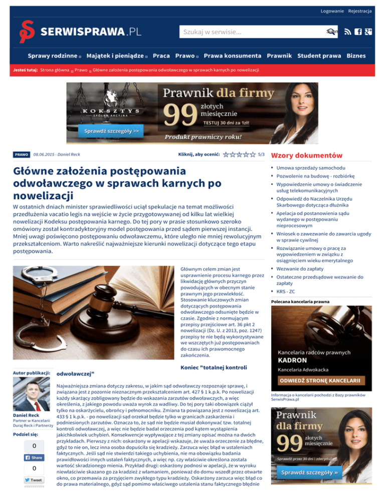 Logowanie Rejestracja Szukaj w serwisie... Sprawy rodzinne Jesteś tutaj: Strona główna PRAWO Majątek i pieniądze Prawo Praca Prawo Submit Prawa konsumenta Prawnik Student prawa Biznes Główne założenia postępowania odwoławczego w sprawach karnych po nowelizacji 08.06.2015 - Daniel Reck Kliknij, aby ocenić: 5/3 Główne założenia postępowania odwoławczego w sprawach karnych po nowelizacji W ostatnich dniach minister sprawiedliwości uciął spekulacje na temat możliwości przedłużenia vacatio legis na wejście w życie przygotowywanej od kilku lat wielkiej nowelizacji Kodeksu postępowania karnego. Do tej pory w prasie stosunkowo szeroko omówiony został kontradyktoryjny model postępowania przed sądem pierwszej instancji. Mniej uwagi poświęcono postępowaniu odwoławczemu, które uległo nie mniej rewolucyjnym przekształceniom. Warto nakreślić najważniejsze kierunki nowelizacji dotyczące tego etapu postępowania. Głównym celem zmian jest usprawnienie procesu karnego przez likwidację głównych przyczyn powodujących w obecnym stanie prawnym jego przewlekłość. Stosowanie kluczowych zmian dotyczących postępowania odwoławczego odsunięte będzie w czasie. Zgodnie z normującym przepisy przejściowe art. 36 pkt 2 nowelizacji (Dz. U. z 2013, poz. 1247) przepisy te nie będą wykorzystywane we wszczętych już postępowaniach do czasu ich prawomocnego zakończenia. Koniec "totalnej kontroli Autor publikacji: odwoławczej" Najważniejsza zmiana dotyczy zakresu, w jakim sąd odwoławczy rozpoznaje sprawę, i związana jest z pozornie nieznacznym przekształceniem art. 427 § 1 k.p.k. Po nowelizacji każdy skarżący zobligowany będzie do wskazania zarzutów odwoławczych, a więc określenia, z jakiego powodu uważa wyrok za wadliwy. Do tej pory taki obowiązek ciążył tylko na oskarżycielu, obrońcy i pełnomocniku. Zmiana ta powiązana jest z nowelizacją art. Daniel Reck 433 § 1 k.p.k. - po nowelizacji sąd orzekał będzie tylko w granicach zaskarżenia i Partner w Kancelarii podniesionych zarzutów. Oznacza to, że sąd nie będzie musiał dokonywać tzw. totalnej Duraj Reck i Partnerzy kontroli odwoławczej, a więc nie będzie badał orzeczenia pod kątem wystąpienia Podziel się: jakichkolwiek uchybień. Konsekwencje wypływające z tej zmiany opisać można na dwóch przykładach. Pierwszy z nich: oskarżony w apelacji wskazuje, że uważa orzeczenie za błędne, 0 gdyż to nie on, lecz inna osoba dopuściła się kradzieży. Zarzuca więc błąd w ustaleniach faktycznych. Jeśli sąd nie stwierdzi takiego uchybienia, nie ma obowiązku badania prawidłowości innych ustaleń faktycznych, a więc np. czy właściwie określona została wartość skradzionego mienia. Przykład drugi: oskarżony podnosi w apelacji, że w wyroku 0 niewłaściwie skazano go za kradzież z włamaniem, ponieważ do domu wszedł przez otwarte okno, co przemawia za przyjęciem zwykłego typu kradzieży. Oskarżony zarzuca więc błąd co do prawa materialnego, gdyż sąd pomimo właściwego ustalenia stanu faktycznego błędnie Wzory dokumentów Umowa sprzedaży samochodu Pozwolenie na budowę - rozbiórkę Wypowiedzenie umowy o świadczenie usług telekomunikacyjnych Odpowiedź do Naczelnika Urzędu Skarbowego dotycząca dłużnika Apelacja od postanowienia sądu wydanego w postępowaniu nieprocesowym Wniosek o zawezwanie do zawarcia ugody w sprawie cywilnej Rozwiązanie umowy o pracę za wypowiedzeniem w związku z osiągnięciem wieku emerytalnego Wezwanie do zapłaty Ostateczne przedsądowe wezwanie do zapłaty KRS - ZC Polecana kancelaria prawna Kancelaria radców prawnych KADRON Kancelaria Adwokacka ODWIEDŹ STRONĘ KANCELARII Informacja o kancelarii pochodzi z Bazy prawników SerwisPrawa.pl 0 Google + 0 zinterpretował jedno ze znamion czynu zabronionego. Sąd odwoławczy, stwierdzając brak uchybienia, nie musi badać prawidłowości ustaleń faktycznych, sposobu procedowania sądu pierwszej instancji ani współmierności wymierzonej kary. Reasumując, wprowadzona zmiana znacznie ograniczy zakres rozpoznania sprawy w postępowaniu odwoławczym, co skrócić ma czas trwania sprawy przed sądem drugiej instancji. Reformatoryjne orzekanie w drugiej instancji Druga kluczowa zmiana dotycząca postępowania odwoławczego związana jest z ograniczeniem orzekania kasatoryjnego na rzecz reformatoryjnego. Oznacza to, że po nowelizacji sąd odwoławczy z zasady zobowiązany będzie do wydawania wyroku co do istoty kończącego postępowanie. W obecnym stanie prawnym nagminne są sytuacje, w których sprawa w wyniku przeprowadzenia kontroli odwoławczej kierowana jest do ponownego rozpoznania przez sąd pierwszej instancji. Częstokroć działanie takie ma miejsce kilka razy, w efekcie czego sprawa przez kilka lub nawet kilkanaście lat wędruje między sądami pierwszej i drugiej instancji. Wyeliminowaniu tej praktyki służyć ma zmiana art. 437 § 2 zdanie 2 k.p.k., która ogranicza możliwość przekazania sprawy do ponownego rozpoznania do przypadków obarczonych najpoważniejszymi uchybieniami procesowymi oraz gdy konieczne jest przeprowadzenie postępowania dowodowego w całości. Z omawianą zmianą koresponduje wykreślenie zakazu prowadzenia przez sąd odwoławczy postępowania dowodowego co do istoty sprawy. Do tej pory to ten przepis blokował możliwość przeprowadzania dowodów przez sąd drugiej instancji. Gdy sąd ten dostrzegł zatem jakieś uchybienia w postępowaniu dowodowym, musiał kierować sprawę z powrotem do pierwszej instancji. Po nowelizacji sąd odwoławczy będzie nie tylko uprawniony, ale i zobowiązany do przeprowadzenia koniecznych dowodów i zasadniczo do wydania orzeczenia prawomocnie kończącego postępowanie w sprawie. Ograniczenie zaskarżalności wyroków wydanych w trybach konsensualnych Obok omawianych powyżej dwóch kierunkowych zmian, dotyczących całego postępowania odwoławczego, nowelizacja wprowadza oryginalny model post