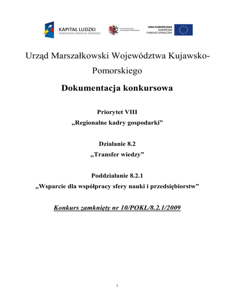 Urząd Marszałkowski Województwa KujawskoPomorskiego Dokumentacja konkursowa Priorytet VIII „Regionalne kadry gospodarki” Działanie 8.2 „Transfer wiedzy” Poddziałanie 8.2.1 „Wsparcie dla współpracy sfery nauki i przedsiębiorstw” Konkurs zamknięty nr 10/POKL/8.2.1/2009 1 ____________________________________Człowiek – najlepsza inwestycja Urząd Marszałkowski Województwa Kujawsko-Pomorskiego przedłuŜa termin składania wniosków w konkursie nr 10 /POKL/8.2.1/2009 o dofinansowanie ze środków Europejskiego Funduszu Społecznego projektów w ramach Priorytetu VIII, Działania 8.1, Poddziałania 8.2.1 Programu Operacyjnego Kapitał Ludzki, obejmujących: 1. StaŜe i szkolenia praktyczne dla: - pracowników przedsiębiorstw w jednostkach naukowych - pracowników naukowych jednostek naukowych oraz pracowników naukowych i naukowo-dydaktycznych uczelni – w przedsiębiorstwach, 2. promocja idei przedsiębiorczości akademickiej, w celu komercjalizacji wiedzy i umiejętności zespołu działającego na uczelni lub w jednostce naukowej (firmy typu spin off lub spin out), 3. szkolenia i doradztwo dla pracowników naukowych jednostek naukowych oraz pracowników naukowych i naukowo-dydaktycznych uczelni, doktorantów, studentów i absolwentów uczelni zamierzających rozpocząć własną działalność gospodarczą typu spin off lub spin out Wnioski o dofinansowanie projektu moŜna składać osobiście, kurierem lub pocztą w terminach Od 23 września 2009 godz. 7.30 do 30 listopad 2009 godz. 15:00 w Kancelarii Ogólnej Departamentu Polityki Regionalnej Urzędu Marszałkowskiego Województwa KujawskoPomorskiego, 87-100 Toruń, ul. M. Skłodowskiej-Curie 73, I piętro, pokój 112 a. Decyduje data wpływu wniosku do Instytucji Organizującej Konkurs. O dofinansowanie mogą występować wszystkie podmioty, które spełnią kryteria określone w dokumentacji konkursowej, z wyłączeniem podmiotów określonych w art. 211 ustawy z dnia 30 czerwca 2005 r. o finansach publicznych (Dz. U. Nr 249, poz. 2104 z późn. zm.) oraz osób fizycznych (nie dotyczy osób prowadzących działalność gospodarczą lub oświatową na podstawie odrębnych przepisów). Dokumentacja konkursowa jest dostępna w siedzibie Departamentu Polityki Regionalnej Urzędu Marszałkowskiego Województwa Kujawsko-Pomorskiego 87-100 Toruń, ul. M. Skłodowskiej-Curie 73 oraz na stronie internetowej www.fundusze.kujawsko-pomorskie.pl . Na realizację projektów wyłonionych do realizacji w ramach konkursu dostępna jest kwota 6 000 000,00 zł Dodatkowe informacje moŜna uzyskać w Punkcie Konsultacyjnym w Departamencie Polityki Regionalnej Urzędu Marszałkowskiego Województwa Kujawsko-Pomorskiego w Toruniu, ul. M. Skłodowskiej-Curie 73, pokój nr 1, tel. 056 656 10 55, e-mail: [email protected]. Publikacja współfinansowana ze środków Unii Europejskiej w ramach Europejskiego Funduszu Społecznego 2 SPIS TREŚCI Słowniczek ………………………………………………………………………………………...5 I. Przedmiot konkursu ....................................................................................................................... 6 II. Informacje ogólne ......................................................................................................................... 6 2.1. Czym jest Dokumentacja Konkursowa .................................................................................................... 6 2.2. Informacje o konkursie ............................................................................................................................. 7 2.3. Kwota dostępna ........................................................................................................................................ 7 2.4. Forma finansowania ................................................................................................................................. 7 2.5. Procedura wyboru projektów do realizacji ............................................................................................... 8 2.6. Podstawa prawna i dokumenty programowe. ......................................................................................... 16 III. Wymagania konkursowe .......................................................................................................... 17 3.1. Podmioty uprawnione do ubiegania się o dofinansowanie projektu ...................................................... 17 3.2. Wymagania odnośnie grupy docelowej .................................................................................................. 17 3.3. Wymagania czasowe .............................................................................................................................. 18 3.4. Wymagania finansowe ........................................................................................................................... 19 3.5. Wymagane rezultaty ............................................................................................................................... 20 3.6. Wymagania dotyczące partnerstwa ........................................................................................................ 21 3.7. Wymagania dotyczące innowacyjności i współpracy ponadnarodowej ................................................. 22 3.8. Wymagania odnośnie przygotowania wniosku o dofinansowanie ......................................................... 22 3.9. Wymagania związane z realizacją projektu............................................................................................ 25 3.10 Wymagane załączniki do wniosku ........................................................................................................ 26 IV. Kryteria wyboru projektów...................................................................................................... 29 4.1 Ogólne kryteria formalne ...............................