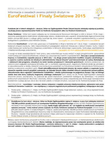 ODYSEJA UMYSŁU 2014-2015 Informacja o zasadach awansu polskich drużyn na EuroFestiwal i Finały Światowe 2015 Podobnie jak w latach ubiegłych – drużyny, które na Ogólnopolskim Finale Odysei Umysłu zdobędą najwięcej punktów, uzyskają prawo reprezentowania Polski na Festiwalu Europejskim albo na Finałach Światowych. Finały Światowe – które tym razem odbędą się na Uniwersytecie Stanowym Michigan w USA w dniach 19-24. maja – stanowią spektakularne zwieńczenie odysejowego sezonu, realizowane przy wsparciu Amerykańskiej Agencji Kosmicznej NASA: ponad 800 drużyn z całego globu poznaje się, bawi razem – a przede wszystkim współzawodniczy w swoich [szczegóły na: www.odysseyofthemind.com/wf2015] kategoriach o prestiżowy tytuł Mistrzów Świata. Natomiast EuroFestiwal – w tym roku goszczący w Czelabińsku w Rosji w terminie od 1. do 6. maja – z założenia nie jest kolejnym etapem konkursu, tylko niepowtarzalnym przeglądem dokonań Odyseuszy z różnych krajów i kultur. Celem całej imprezy jest autentyczna integracja uczestników w klimacie aktywnego wypoczynku, twórczego współdziałania i międzynarodowego zrozumienia. [szczegóły na: www.odysseyofthemindeurofest2015.com] Z uwagi na skalę przedsięwzięcia i ilość pracy, jaką wolontariusze muszą włożyć w jego przygotowanie, gospodarze nadchodzących edycji EuroFestiwalu ustalani są z przynajmniej 2-letnim wyprzedzeniem. Decyzja o przeprowadzeniu imprezy w Czelabińsku zapadła jeszcze w 2013 roku – na długo przed wybuchem konfliktu rosyjsko-ukraińskiego – w oparciu o pełne zaufanie do lokalnych administratorów Odysei Umysłu® pod kierownictwem dr Larissy Matwiejewej – oddanych idei programu, otwartych na świat, bardzo przyjaznych i niezwykle gościnnych. Jesteśmy przekonani, że zarówno pod względem panującej atmosfery, jak i w wymiarze organizacyjnym, tegoroczny Festiwal okaże się sukcesem, a zakwaterowanie w Hotelu Malachit oraz konkursowa przestrzeń na Południowo-Uralskim Uniwersytecie Państwowym spełnią oczekiwania wszystkich gości. Przed zakwalifikowanymi drużynami otworzy się szansa udziału w wyprawie życia, zawarcia zupełnie nowych przyjaźni, pokazania, że Odyseja Umysłu zbliża młodzież różnych narodowości ponad polityką, zakosztowania nieco egzotyki i odwiedzenia Czelabińska – miasta usytuowanego na pograniczu Europy i Azji, na którego niebie dwa lata temu rozbłysły fragmenty wielkiego meteorytu! Tych, którzy na 24. Finale Ogólnopolskim zdobędą stosowne prawo, zachęcamy, by pokonali lęk przed nieznanym, przełamali nasilające się stereotypy i na przekór politycznym przywódcom Wschodu i Zachodu, którym umiejętności pracy zespołowej oraz twórczego rozwiązywania problemów wydają się być obce (bo nie brali udziału w Odysei Umysłu!), wyruszyli na 23. Festiwal Europejski do Rosji. Niemniej jednak – rozumiejąc i szanując obawy związane z napiętą sytuacją międzynarodową, zgłaszane nam przez niektórych trenerów i rodziców – we współpracy z naszymi zagranicznymi partnerami podjęliśmy następujące decyzje: 1. Tradycyjnie – zdobywcy 1. miejsc na Finale Ogólnopolskim będą mogli dokonać wyboru, czy chcą reprezentować Polskę na Finałach Światowych, czy na Festiwalu Europejskim. 2. Tradycyjnie – zdobywcy 2. miejsc na Finale Ogólnopolskim uzyskają prawo reprezentacji naszego kraju na Festiwalu Europejskim. 3. Dodatkowo (w tym roku) – drużyny, które na Finale Ogólnopolskim zajmą 2. miejsca, a przy tym zdobędą minimum 150/200 punktów przeliczonych za rozwiązanie Problemu Długoterminowego (oceny za Styl i Problem Spontaniczny nie będą w tym wypadku brane pod uwagę), będą mogły zdecydować, że – ze względu na okoliczności zewnętrzne opisane powyżej – wolą wybrać prawo wyjazdu na Finały Światowe zamiast na Festiwal Europejski. Innymi słowy, jeśli jakiś zespół zajmie w swojej kategorii 2. miejsce, uzyska przynajmniej 150/200 punktów przeliczonych za Problem Długoterminowy oraz zadeklaruje stosowną wolę na Oświadczeniu stanowiącym część Formularza Identyfikacyjnego Drużyny – będzie mógł (podobnie jak laureaci miejsc pierwszych) rozpocząć starania o wyjazd na 36. Światowe Finały Odysei Umysłu w Stanach Zjednoczonych. Bieżący sezon konkursowy przypadł na trudny czas w relacjach międzypaństwowych, a niestandardowe okoliczności wymagają niestandardowych działań. Mamy nadzieję, że zaproponowane przez nas rozwiązanie sprawi, że ostatecznie wszyscy laureaci 24. Finału Ogólnopolskiego – zarówno zdobywcy 1., jak i 2. miejsc – będą zadowoleni z podjętych decyzji i udziału w tegorocznych międzynarodowych imprezach Odysei Umysłu. (-) zespół fundacji Odyssey of the Mind Polska Odyssey of the Mind Polska 2014-2015