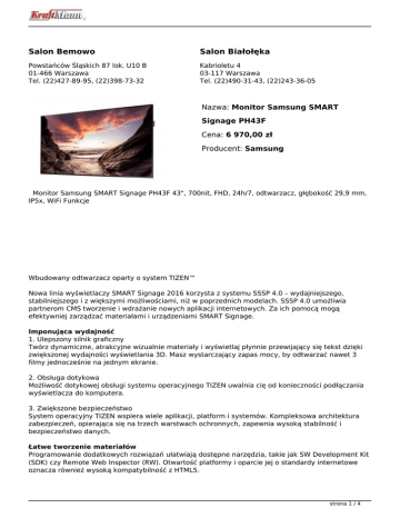 Salon Bemowo Salon Białołęka Powstańców Śląskich 87 lok. U10 B 01-466 Warszawa Tel. (22)427-89-95, (22)398-73-32 Kabrioletu 4 03-117 Warszawa Tel. (22)490-31-43, (22)243-36-05 Nazwa: Monitor Samsung SMART Signage PH43F Cena: 6 970,00 zł Producent: Samsung Monitor Samsung SMART Signage PH43F 43", 700nit, FHD, 24h/7, odtwarzacz, głębokość 29,9 mm, IP5x, WiFi Funkcje Wbudowany odtwarzacz oparty o system TIZEN™ Nowa linia wyświetlaczy SMART Signage 2016 korzysta z systemu SSSP 4.0 – wydajniejszego, stabilniejszego i z większymi możliwościami, niż w poprzednich modelach. SSSP 4.0 umożliwia partnerom CMS tworzenie i wdrażanie nowych aplikacji internetowych. Za ich pomocą mogą efektywniej zarządzać materiałami i urządzeniami SMART Signage. Imponująca wydajność 1. Ulepszony silnik graficzny Twórz dynamiczne, atrakcyjne wizualnie materiały i wyświetlaj płynnie przewijający się tekst dzięki zwiększonej wydajności wyświetlania 3D. Masz wystarczający zapas mocy, by odtwarzać nawet 3 filmy jednocześnie na jednym ekranie. 2. Obsługa dotykowa Możliwość dotykowej obsługi systemu operacyjnego TIZEN uwalnia cię od konieczności podłączania wyświetlacza do komputera. 3. Zwiększone bezpieczeństwo System operacyjny TIZEN wspiera wiele aplikacji, platform i systemów. Kompleksowa architektura zabezpieczeń, opierająca się na trzech warstwach ochronnych, zapewnia wysoką stabilność i bezpieczeństwo danych. Łatwe tworzenie materiałów Programowanie dodatkowych rozwiązań ułatwiają dostępne narzędzia, takie jak SW Development Kit (SDK) czy Remote Web Inspector (RW). Otwartość platformy i oparcie jej o standardy internetowe oznacza również wysoką kompatybilność z HTML5. strona 1 / 4 Prostota obsługi Intuicyjny interfejs, stworzony z myślą o sterowaniu dotykiem, ułatwia obsługę ekranu. Co więcej, przeglądarka internetowa może wyświetlać stronę główną bez konieczności tworzenia dodatkowej aplikacji webowej. Główny ekran SSSP 4.0 został usprawiony pod kątem łatwości obsługi interfejsu i szybkiego dostępu do aplikacji, które teraz uruchamiane są przez URL Launcher. Kompleksowe narzędzia do zarządzania materiałami Kluczowy element opartej na systemie TIZEN platformy SSSP 4.0, oprogramowanie Samsung MagicInfo Player S4, pomaga w pełnym wykorzystaniu możliwości sieci. Wszystko odbywa się za pośrednictwem centralnego serwera. Rozwiązanie MagicInfo Player S4 łączy w sobie dedykowany zapasowy odtwarzacz Backup Player oraz funkcję strumieniowania materiałów DataLink. Imponujące możliwości Nowy silnik graficzny zastosowany w ekranach SMART Signage 2016 znacząco podwyższa jakość wyświetlanego obrazu, zwiększając przy tym płynność animacji i przewijania tekstu. Wspierane są również zdjęcia wysokiej rozdzielczości (maks. 5120 x 5120) i ponad 100 bloków tekstu jednocześnie. Po włączeniu opcji Touch Overlay, użytkownicy mogą korzystać ze sterowania dotykowego, co uwalnia od konieczności podłączania wyświetlacza do komputera. Łatwa obsługa Oprócz funkcji odtwarzacza multimediów, rozwiązanie Samsung MagicInfo oferuje również zaawansowane narzędzia zarządzania materiałami, ustalania i edytowania harmonogramu ich odtwarzania, a także możliwość skonfigurowania wyświetlacza jako ściany wideo. Sterowanie urządzeniami odbywa się za pośrednictwem połączenia Wi-Fi. Nowy interfejs użytkownika sprawia, że korzystanie z tych funkcji jest łatwe i wygodne. Kompleksowe rozwiązanie Serwer Samsung MagicInfo również został na nowo zaprojektowany i zaktualizowany do wersji 4.0. Dołączone do niego wysokiej klasy oprogramowanie zarządzające umożliwia sterowanie połączonymi w sieć wyświetlaczami za pośrednictwem pojedynczego serwera. Nawet duże przedsiębiorstwa mogą szybko i wygodnie sterować ekranami SMART Signage z jednego miejsca. Wyświetlacz cieńszy niż inne strona 2 / 4 Wymiary wyświetlaczy Samsung SMART Signage z nowych serii PHF i PMF sprawiają, że sprawdzą się one doskonale w lokalizacjach ograniczonych przez brak miejsca czy wystrój. Są to najcieńsze ekrany na rynku, mają tylko 29,9 mm grubości, i są dostępne w rozmiarach 43”, 49” i 55”. Ponadto, ich ramki są niemal niewidoczne, co jeszcze mocniej przyciąga uwagę oglądających do wyświetlanych materiałów. * Parametry takie jak rozmiar, jasność i czas ciągłej pracy mogą różnić się w zależności od modelu. Więcej szczegółów w tabeli specyfikacji produktowej. Steruj wygodniej dzięki centralnemu odbiornikowi podczerwieni Samodzielny centralny odbiornik podczerwieni (IR) daje Ci jeszcze więcej możliwości wygodnego korzystania z wyświetlaczy. Poszczególne ekrany mogą odbierać sygnał IR za pośrednictwem jednego, głównego odbiornika. Możesz go zainstalować i zamontować na wiele różnych sposobów, dopasowując do potrzeb Twojej firmy, i sterować z różnych lokalizacji. Powłoka antyrefleksyjna Ekrany z serii PHF i PMF zostały pokryte antyrefleksyjną powłoką, która redukuje odbicie światła, aby zapewnić jak największą widoczność w każdych warunkach. Wyświetlane materiały będą wyraźne i czytelne zarówno w świetle słonecznym, jak i sztucznym. Sprawdzą się więc w takich miejscach, jak np. hale odlotów lotnisk czy witryny sklepowe. * Parametry takie jak rozmiar, jasność i czas ciągłej pracy mogą różnić się w zależności od modelu. Więcej szczegółów w tabeli specyfikacji produktowej. strona 3 / 4 Wyświetlacz odporny na wiele czynników zewnętrznych Wszystkie wyświetlacze SMART Signage z serii PMF i PHF otrzymały certyfikat IP5x, który oznacza ich wysoką odporność na szkodliwe działanie pyłu i wielu innych czynników zewnętrznych. Konstrukcja ekranów zapobiega kumulowaniu się kurzu, co czyni z nich urządzenia dostosowane do pracy na zewnątrz czy, np. metrze. Ponad to, nie wymagają dodatkowych osłon, dzięki czem