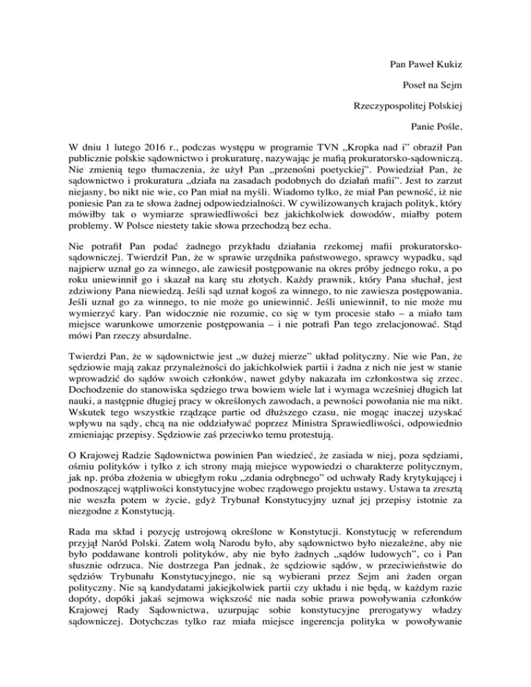 Pan Paweł Kukiz Poseł na Sejm Rzeczypospolitej Polskiej Panie Pośle, W dniu 1 lutego 2016 r., podczas występu w programie TVN „Kropka nad i” obraził Pan publicznie polskie sądownictwo i prokuraturę, nazywając je mafią prokuratorsko-sądowniczą. Nie zmienią tego tłumaczenia, że użył Pan „przenośni poetyckiej”. Powiedział Pan, że sądownictwo i prokuratura „działa na zasadach podobnych do działań mafii”. Jest to zarzut niejasny, bo nikt nie wie, co Pan miał na myśli. Wiadomo tylko, że miał Pan pewność, iż nie poniesie Pan za te słowa żadnej odpowiedzialności. W cywilizowanych krajach polityk, który mówiłby tak o wymiarze sprawiedliwości bez jakichkolwiek dowodów, miałby potem problemy. W Polsce niestety takie słowa przechodzą bez echa. Nie potrafił Pan podać żadnego przykładu działania rzekomej mafii prokuratorskosądowniczej. Twierdził Pan, że w sprawie urzędnika państwowego, sprawcy wypadku, sąd najpierw uznał go za winnego, ale zawiesił postępowanie na okres próby jednego roku, a po roku uniewinnił go i skazał na karę stu złotych. Każdy prawnik, który Pana słuchał, jest zdziwiony Pana niewiedzą. Jeśli sąd uznał kogoś za winnego, to nie zawiesza postępowania. Jeśli uznał go za winnego, to nie może go uniewinnić. Jeśli uniewinnił, to nie może mu wymierzyć kary. Pan widocznie nie rozumie, co się w tym procesie stało – a miało tam miejsce warunkowe umorzenie postępowania – i nie potrafi Pan tego zrelacjonować. Stąd mówi Pan rzeczy absurdalne. Twierdzi Pan, że w sądownictwie jest „w dużej mierze” układ polityczny. Nie wie Pan, że sędziowie mają zakaz przynależności do jakichkolwiek partii i żadna z nich nie jest w stanie wprowadzić do sądów swoich członków, nawet gdyby nakazała im członkostwa się zrzec. Dochodzenie do stanowiska sędziego trwa bowiem wiele lat i wymaga wcześniej długich lat nauki, a następnie długiej pracy w określonych zawodach, a pewności powołania nie ma nikt. Wskutek tego wszystkie rządzące partie od dłuższego czasu, nie mogąc inaczej uzyskać wpływu na sądy, chcą na nie oddziaływać poprzez Ministra Sprawiedliwości, odpowiednio zmieniając przepisy. Sędziowie zaś przeciwko temu protestują. O Krajowej Radzie Sądownictwa powinien Pan wiedzieć, że zasiada w niej, poza sędziami, ośmiu polityków i tylko z ich strony mają miejsce wypowiedzi o charakterze politycznym, jak np. próba złożenia w ubiegłym roku „zdania odrębnego” od uchwały Rady krytykującej i podnoszącej wątpliwości konstytucyjne wobec rządowego projektu ustawy. Ustawa ta zresztą nie weszła potem w życie, gdyż Trybunał Konstytucyjny uznał jej przepisy istotnie za niezgodne z Konstytucją. Rada ma skład i pozycję ustrojową określone w Konstytucji. Konstytucję w referendum przyjął Naród Polski. Zatem wolą Narodu było, aby sądownictwo było niezależne, aby nie było poddawane kontroli polityków, aby nie było żadnych „sądów ludowych”, co i Pan słusznie odrzuca. Nie dostrzega Pan jednak, że sędziowie sądów, w przeciwieństwie do sędziów Trybunału Konstytucyjnego, nie są wybierani przez Sejm ani żaden organ polityczny. Nie są kandydatami jakiejkolwiek partii czy układu i nie będą, w każdym razie dopóty, dopóki jakaś sejmowa większość nie nada sobie prawa powoływania członków Krajowej Rady Sądownictwa, uzurpując sobie konstytucyjne prerogatywy władzy sądowniczej. Dotychczas tylko raz miała miejsce ingerencja polityka w powoływanie sędziów, ze strony jednego z Prezydentów RP. Na szczęście później się to nie powtórzyło. Widoczna jest także Pańska niewiedza co do problematyki obcego wymiaru sprawiedliwości, który podaje Pan jako przykład. W Stanach Zjednoczonych prokurator generalny jest istotnie członkiem rządu i ma rangę równorzędną sekretarzowi stanu, ale podlega mu tylko prokuratura, a nie sądownictwo. Sądy są tam odrębną władzą, a podporządkowanie ich władzy wykonawczej naruszałoby konstytucję USA. Warto, żeby Pan przypomniał sobie, jak przed laty został Pan niesłusznie oskarżony o obrazę uczuć religijnych tekstem piosenki. Sąd wtedy Pana uniewinnił. Czy sytuacja, w której prokurator, na polecenie polityka - Ministra Sprawiedliwości i Prokuratora Generalnego Pana oskarża, a sąd wbrew jego stanowisku wydaje wyrok uniewinniający, byłaby możliwa, gdyby w Polsce istniała mafia prokuratorsko-sądownicza? O powierzenie rozpoznawania drobnych spraw innym osobom, niż sędziowie, o czym Pan też mówił, apelujemy od dawna. Jest mnóstwo spraw, które do rozstrzygnięcia nie wymagają angażowania sędziego, wystarczyłby np. referendarz sądowy. Niegdyś istniały w Polsce kolegia ds. wykroczeń. W wielu krajach działają sędziowie pokoju i można się zastanowić na ile dałoby się to rozwiązanie przenieść na nasz grunt. Jednak w żadnym kraju, w którym istnieje instytucja sędziego pokoju, sędzia taki nie ma prawa kontrolować sędziów zawodowych. Nie ma do tego kompetencji ani wystarczającej wiedzy prawniczej. To od jego decyzji odwołać się można do sędziego. Kontrolowanie sędziów przez „czynniki społeczne”, a więc przez osoby wskazane przez partie i wystawione choćby do jednomandatowych wyborów, pozbawiłoby sądy niezawisłości. Tej samej, dzięki której Pan został ongiś uniewinniony, mimo prowadzonej przeciwko Panu nagonki. Panie Pośle, radzimy Panu dogłębnie zapoznać się z Konstytucją RP, w szczególności z jej rozdziałem VIII oraz poznać takie ustawy, jak prawo o ustroju sądów powszechnych czy ustawa o Krajowej Radzie Sądownictwa, włącznie z przeanalizowaniem, jakich zmian dokonali w nich politycy na przestrzeni ostatnich piętnastu lat. To obszerne ustawy, ale wiedza ta przyda się Panu, gdy będzie Pan chciał działać na rzecz zmian w polskich sądach. Wreszcie zauważamy, że określenie „mafia prokurators