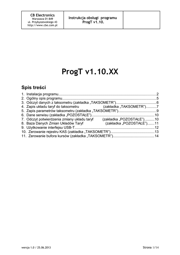 CB Electronics Warszawa 01-849 ul. Przybyszewskiego 43 http://www.cbe.com.pl Instrukcja obsługi programu ProgT v1.10. ProgT v1.10.XX Spis treści 1. Instalacja programu..................................................................................................2 2. Ogólny opis programu..............................................................................................5 3. Odczyt danych z taksometru (zakładka „TAKSOMETR”)........................................6 4. Zapis układu taryf do taksometru (zakładka „TAKSOMETR”)..........7 5. Zapis parametrów taksometru (zakładka „TAKSOMETR”)......................................9 6. Dane serwisu (zakładka „POZOSTAŁE”)...............................................................10 7. Odczyt potwierdzenia zmiany układu taryf (zakładka „POZOSTAŁE”)..........10 8. Baza Danych Zmian Układów Taryf (zakładka „POZOSTAŁE”).......11 9. Użytkowanie interfejsu USB-T................................................................................12 10. Zerowanie rejestru KAS (zakładka „TAKSOMETR”)............................................13 11. Zerowanie bufora kursów (zakładka „TAKSOMETR”).........................................14 wersja 1.0 / 25.06.2013 Strona 1/14 CB Electronics Warszawa 01-849 ul. Przybyszewskiego 43 http://www.cbe.com.pl Instrukcja obsługi programu ProgT v1.10. 1. Instalacja programu. Płytę CD z programem instalacyjnym włożyć do napędu. W zależności od systemu operacyjnego może pojawić się (lub nie) okno potwierdzenia automatycznego uruchomienia programu instalacyjnego z płyty: Po uruchomieniu programu pojawi się okno instalatora. Należy nacisnąć przycisk 'Install' w celu rozpoczęcia instalacji. Uwaga: Program należy zainstalować i używać jedynie będąc zalogowanym jako użytkownik z prawami administratora. wersja 1.0 / 25.06.2013 Strona 2/14 CB Electronics Warszawa 01-849 ul. Przybyszewskiego 43 http://www.cbe.com.pl Instrukcja obsługi programu ProgT v1.10. Instalacja rozpocznie się od zainstalowania sterowników urządzenia FTDI. Następnie zainstalowany zostanie program "Borland Database Engine 5.1" . W każdym oknie należy kliknąć „Next” w celu zainstalowania. wersja 1.0 / 25.06.2013 Strona 3/14 CB Electronics Warszawa 01-849 ul. Przybyszewskiego 43 http://www.cbe.com.pl wersja 1.0 / 25.06.2013 Instrukcja obsługi programu ProgT v1.10. Strona 4/14 CB Electronics Warszawa 01-849 ul. Przybyszewskiego 43 http://www.cbe.com.pl Instrukcja obsługi programu ProgT v1.10. Po zakończonej instalacji program można uruchomić poprzez: Menu Start -> Programy -> CB -> ProgT 2. Ogólny opis programu. ProgT v1.10.XX dedykowany jest do odczytu i zapisu danych taksometru „CEZAR”. Program komunikuje się z z taksometrem za pomocą interfejsu USB-T, operatego na układzie FT245RL. Program działa w środowisku Windows XP oraz Windows 7. Główne okno programu: wersja 1.0 / 25.06.2013 Strona 5/14 CB Electronics Warszawa 01-849 ul. Przybyszewskiego 43 http://www.cbe.com.pl Instrukcja obsługi programu ProgT v1.10. 3. Odczyt danych z taksometru (zakładka „TAKSOMETR”). Po wyborze odczytu z taksometru pojawi się następujące okno Program czeka na dane, które taksometr prześle po naciśnięciu odpowiednich przycisków. Po odebraniu danych zostaną one wyświetlone w kolejnym oknie: Odczytane dane można edytować i zapisać do taksometru. wersja 1.0 / 25.06.2013 Strona 6/14 CB Electronics Warszawa 01-849 ul. Przybyszewskiego 43 http://www.cbe.com.pl Instrukcja obsługi programu ProgT v1.10. 4. Zapis układu taryf do taksometru (zakładka „TAKSOMETR”). Okno zapisu układu taryf. Po prawej stronie okna wyświetlona jest predefiniowana lista gotowych układów taryf. Po kliknięciu odpowiedniej pozycji z listy, dane układu taryf są automatyznie wypełniane wartościami. Wpisane dane układu taryf można zmienić przed zapisem, używając przycisku „Edytuj”. Po kliknięciu „Zapis do taksometru” wyświetlone zostanie okno wyboru danych do wydruku/zapisu. Zaznaczenie opcji „Drukuj serię” spowoduje że okno wyboru danych do wydruku/zapisu zostanie wyświetlone tylko przy pierwszym zapisie. Wybrane ustawienia będą wtedy automatycznie stosowane do wszystkich kolejnych zapisów. Zaznaczenie opcji „Tylko do Bazy Danych” spowoduje wyłączenie wykonywania wydruków po każdym zapisie do taksometru. Wydruki można wykonać później korzystając z opcji „Baza Danych Zmian Układów Taryf” w menu głównym. Zaznaczenie obydwu opcji pozwola na seryjny zapis układu taryf przy raz określonych opcjach wydruku i z zapisem tylko do Bazy Danych. wersja 1.0 / 25.06.2013 Strona 7/14 CB Electronics Warszawa 01-849 ul. Przybyszewskiego 43 http://www.cbe.com.pl Instrukcja obsługi programu ProgT v1.10. Okno wyboru ustawień wydruku/zapisu: Przed zapisem układu taryf należy ustalić odpowiednie dane wydruku. Przy zapisie układu taryf do taksometru pojawi się okno: Po naciśnięciu odpowiednich przycisków w taksometrze nastąpi zapis wcześniej ustalonego układu taryf. Po zapisie nastąpi odczyt i weryfikacja poprawności zapisu. wersja 1.0 / 25.06.2013 Strona 8/14 CB Electronics Warszawa 01-849 ul. Przybyszewskiego 43 http://www.cbe.com.pl Instrukcja obsługi programu ProgT v1.10. 5. Zapis parametrów taksometru (zakładka „TAKSOMETR”). Zapis parametrów jest możliwy tylko za pomocą przycisku „S” (znajdującego się pod plombą) w taksometrze. Odznaczony parametr będzie sprawdzony pod względem poprawności i wyświetli się okno dialogowe zapisu. Po dwukrotnym naciśnięciu przycisku „S” wybrane parametry zostaną zapisane. wersja 1.0 / 25.06.2013 Strona 9/14 CB Electronics Warszawa 01-849 ul. Przybyszewskiego 43 http://www.cbe.com.pl Instrukcja obsługi programu ProgT v1.10. 6. Dane serwisu (zakładka „POZOSTAŁE”). Dane te są wpisywane przez producenta. Jednoznacznie określają serwis, który dokonuje zmian w 