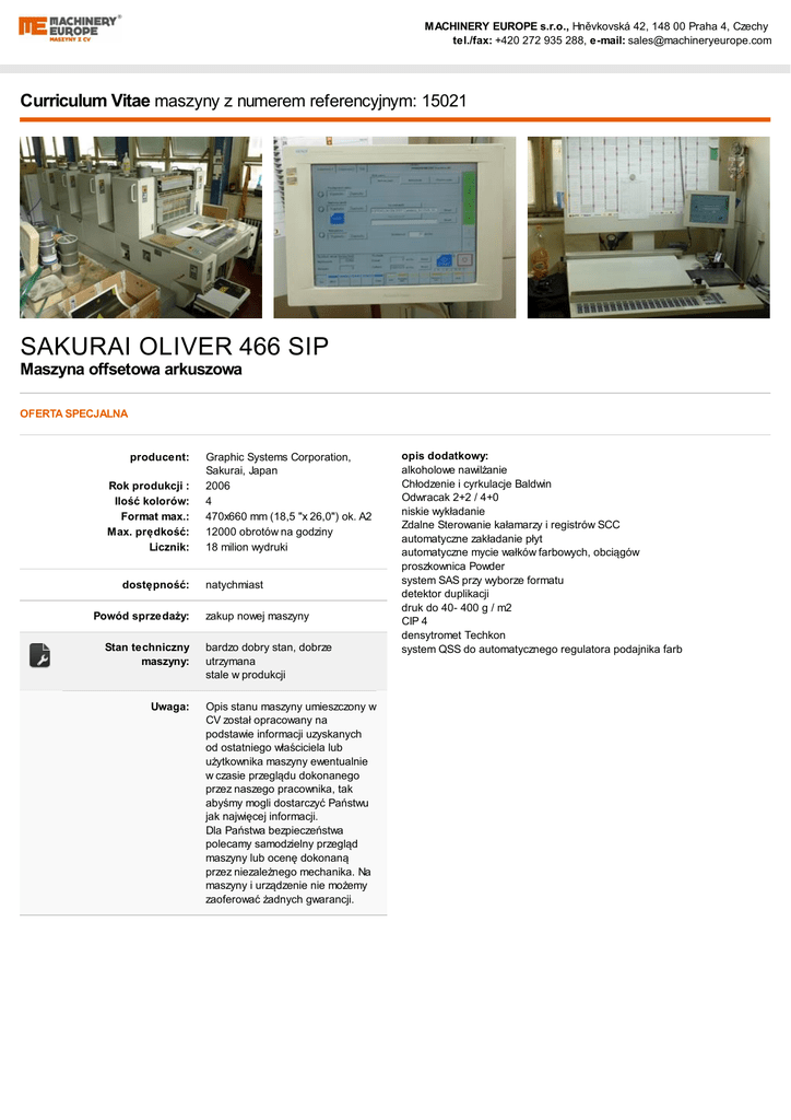 MACHINERY EUROPE s.r.o., Hněvkovská 42, 148 00 Praha 4, Czechy tel./fax: +420 272 935 288, e-mail: [email protected] Curriculum Vitae maszyny z numerem referencyjnym: 15021 SAKURAI OLIVER 466 SIP Maszyna offsetowa arkuszowa OFERTA SPECJALNA producent: Rok produkcji : Ilość kolorów: Format max.: Max. prędkość: Licznik: dostępność: Powód sprzedaży: Stan techniczny maszyny: Uwaga: Graphic Systems Corporation, Sakurai, Japan 2006 4 470x660 mm (18,5 "x 26,0") ok. A2 12000 obrotów na godziny 18 milion wydruki natychmiast zakup nowej maszyny bardzo dobry stan, dobrze utrzymana stale w produkcji Opis stanu maszyny umieszczony w CV został opracowany na podstawie informacji uzyskanych od ostatniego właściciela lub użytkownika maszyny ewentualnie w czasie przeglądu dokonanego przez naszego pracownika, tak abyśmy mogli dostarczyć Państwu jak najwięcej informacji. Dla Państwa bezpieczeństwa polecamy samodzielny przegląd maszyny lub ocenę dokonaną przez niezależnego mechanika. Na maszyny i urządzenie nie możemy zaoferować żadnych gwarancji. opis dodatkowy: alkoholowe nawilżanie Chłodzenie i cyrkulacje Baldwin Odwracak 2+2 / 4+0 niskie wykładanie Zdalne Sterowanie kałamarzy i registrów SCC automatyczne zakładanie płyt automatyczne mycie wałków farbowych, obciągów proszkownica Powder system SAS przy wyborze formatu detektor duplikacji druk do 40- 400 g / m2 CIP 4 densytromet Techkon system QSS do automatycznego regulatora podajnika farb