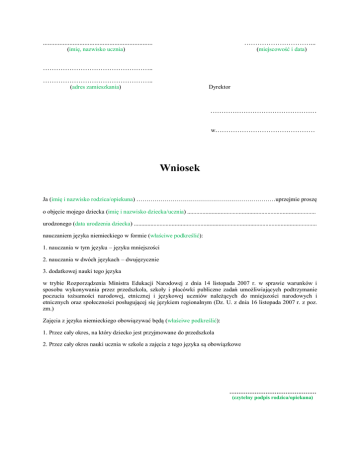 .................................................................. …………………………... (imię, nazwisko ucznia) (miejscowość i data) ………………………………………….. ………………………………………….. (adres zamieszkania) Dyrektor ………………………………………… w……………………………………… Wniosek Ja (imię i nazwisko rodzica/opiekuna) ……………………………………………………………uprzejmie proszę o objęcie mojego dziecka (imię i nazwisko dziecka/ucznia) ..................................................................................... urodzonego (data urodzenia dziecka) ......................................................................................................................... nauczaniem języka niemieckiego w formie (właściwe podkreślić): 1. nauczania w tym języku – języku mniejszości 2. nauczania w dwóch językach – dwujęzycznie 3. dodatkowej nauki tego języka w trybie Rozporządzenia Ministra Edukacji Narodowej z dnia 14 listopada 2007 r. w sprawie warunków i sposobu wykonywania przez przedszkola, szkoły i placówki publiczne zadań umożliwiających podtrzymanie poczucia tożsamości narodowej, etnicznej i językowej uczniów należących do mniejszości narodowych i etnicznych oraz społeczności posługującej się językiem regionalnym (Dz. U. z dnia 16 listopada 2007 r. z poz. zm.) Zajęcia z języka niemieckiego obowiązywać będą (właściwe podkreślić): 1. Przez cały okres, na który dziecko jest przyjmowane do przedszkola 2. Przez cały okres nauki ucznia w szkole a zajęcia z tego języka są obowiązkowe ………………………………………… (czytelny podpis rodzica/opiekuna) Zwei Sprachen doppelte Chance Dlaczego dwujęzycznie? Dzieci dwujęzyczne: + Lepiej radzą sobie w szkole niż rówieśnicy znający jeden język + Szybciej i efektywniej uczą się innych języków obcych + Są pewniejsze siebie oraz bardziej wrażliwe wobec innych ludzi i kultur + Myślą płynniej, kreatywniej i elastycznej + Jako dorośli mają większe szanse na międzynarodowym rynku pracy + Uczą się języka, jako nośnika kultury Dbasz o dobro dziecka? Język Mniejszości Niemieckiej to dla niego szansa! Zaznacz 2 x pozycję nr 2 i złóż wniosek u dyrektora szkoły! Państwo zapewnia Ci takie prawo!