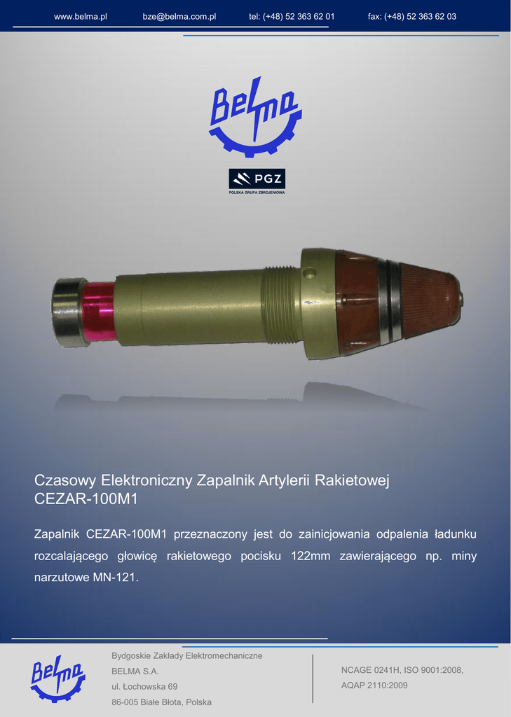 www.belma.pl [email protected] tel: (+48) 52 363 62 01 fax: (+48) 52 363 62 03 POLSKA GRUPA ZBROJENIOWA Czasowy Elektroniczny Zapalnik Artylerii Rakietowej CEZAR-100M1 Zapalnik CEZAR-100M1 przeznaczony jest do zainicjowania odpalenia ładunku rozcalającego głowicę rakietowego pocisku 122mm zawierającego np. miny narzutowe MN-121. Bydgoskie Zakłady Elektromechaniczne BELMA S.A. NCAGE 0241H, ISO 9001:2008, ul. Łochowska 69 AQAP 2110:2009 86-005 Białe Błota, Polska www.belma.pl [email protected] tel: (+48) 52 363 62 01 fax: (+48) 52 363 62 03 Dane techniczne Masa 0,88 kg Długość 240 mm Średnica 64 mm Gwint M45 x 2 Długosć gwintu 22 mm Maksymalny programowalny czas 100 s Rozdzielczość nastaw czasu 0,02 s Zasilanie Bateryjne Zapalnik CEZAR-100M1 przeznaczony jest do zainicjowania odpalenia ładunku rozcalającego głowicę rakietowego pocisku 122mm zawierającego np. miny narzutowe MN-121, po zaprogramowanym czasie, mierzonym od startu pocisku. Programowanie nastaw czasu rozcalenia odbywa się za pomocą programatora elektronicznego EP-92M. Zapalnik po zaprogramowaniu znajduje się w stanie biernej gotowości do użycia. Pod wpływem sił przeciążenia, działających w momencie startu rakiety, zaczyna pracę układ odmierzania czasu. Po około 3 sekundach od startu ustepuje zabezpieczenie, a po upływie zaprogramowanego czasu nastepuje zadziałanie zapalnika i rozcalenie głowicy. Bydgoskie Zakłady Elektromechaniczne BELMA S.A. NCAGE 0241H, ISO 9001:2008, ul. Łochowska 69 AQAP 2110:2009 86-005 Białe Błota, Polska