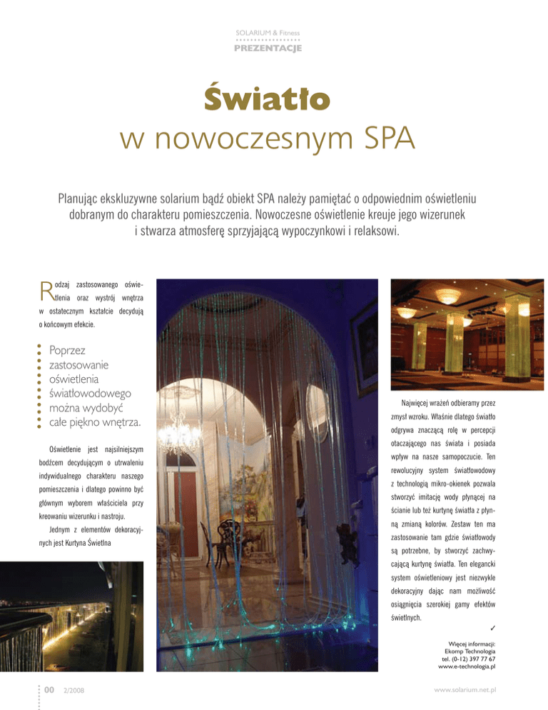 SOLARIUM & Fitness PREZENTACJE Światło w nowoczesnym SPA Planując ekskluzywne solarium bądź obiekt SPA należy pamiętać o odpowiednim oświetleniu dobranym do charakteru pomieszczenia. Nowoczesne oświetlenie kreuje jego wizerunek i stwarza atmosferę sprzyjającą wypoczynkowi i relaksowi. R odzaj zastosowanego oświetlenia oraz wystrój wnętrza w ostatecznym kształcie decydują o końcowym efekcie. Poprzez zastosowanie oświetlenia światłowodowego można wydobyć całe piękno wnętrza. Oświetlenie jest najsilniejszym bodźcem decydującym o utrwaleniu indywidualnego charakteru naszego pomieszczenia i dlatego powinno być głównym wyborem właściciela przy kreowaniu wizerunku i nastroju. Jednym z elementów dekoracyjnych jest Kurtyna Świetlna Najwięcej wrażeń odbieramy przez zmysł wzroku. Właśnie dlatego światło odgrywa znaczącą rolę w percepcji otaczającego nas świata i posiada wpływ na nasze samopoczucie. Ten rewolucyjny system światłowodowy z technologią mikro-okienek pozwala stworzyć imitację wody płynącej na ścianie lub też kurtynę światła z płynną zmianą kolorów. Zestaw ten ma zastosowanie tam gdzie światłowody są potrzebne, by stworzyć zachwycającą kurtynę światła. Ten elegancki system oświetleniowy jest niezwykle dekoracyjny dając nam możliwość osiągnięcia szerokiej gamy efektów świetlnych. 3 Więcej informacji: Ekomp Technologia tel. (0-12) 397 77 67 www.e-technologia.pl 00 2/2008 www.solarium.net.pl