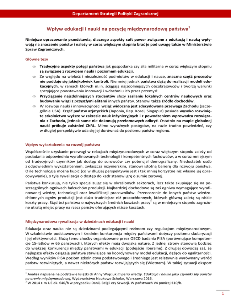 Departament Strategii Polityki Zagranicznej Wpływ edukacji i nauki na pozycję międzynarodową państwa1 Niniejsze opracowanie przedstawia, dlaczego aspekty soft power związane z edukacją i nauką wpływają na znaczenie państw i należy w coraz większym stopniu brać je pod uwagę także w Ministerstwie Spraw Zagranicznych. Główne tezy • • • • Tradycyjne aspekty potęgi państwa jak gospodarka czy siła militarna w coraz większym stopniu są związane z rozwojem nauki i poziomem edukacji. Ze względu na wielość i niezależność podmiotów w edukacji i nauce, znaczna część procesów nie poddaje się jakiejkolwiek kontroli. Niemniej jednak państwa dążą do realizacji modeli edukacyjnych, w ramach których m.in. ściągają najzdolniejszych obcokrajowców i tworzą warunki sprzyjające powstawaniu innowacji i wdrażaniu ich przez przemysł. Przyciąganie najzdolniejszych studentów służy zasilaniu lokalnych centrów naukowych oraz budowaniu więzi z przyszłymi elitami innych państw. Stanowi także źródło dochodów. W rozwoju nauki i innowacyjności wciąż widoczna jest zdecydowana przewaga Zachodu (szczególnie USA). Część państw azjatyckich (Japonia, Rep. Korei, Singapur) posiada wysoko rozwinięte szkolnictwo wyższe w zakresie nauk inżynieryjnych i z powodzeniem wprowadza rozwiązania z Zachodu, jednak same nie dokonują przełomowych odkryć. Ostatnio na mapie globalnej nauki próbuje zaistnieć ChRL. Mimo wyraźnych postępów, na razie trudno powiedzieć, czy w długiej perspektywie uda się jej dorównać do poziomu państw regionu. Wpływ wykształcenia na rozwój państwa Współcześnie uzyskanie przewagi w relacjach międzynarodowych w coraz większym stopniu zależy od posiadania odpowiednio wyrafinowanych technologii i kompetentnych fachowców, a w coraz mniejszym od tradycyjnych czynników jak dostęp do surowców czy potencjał demograficzny. Niedostatek osób z odpowiednim wykształceniem, zwłaszcza inżynierskim, stanowi istotną barierę dla rozwoju państwa. O ile technologię można kupić (co w długiej perspektywie jest i tak mniej korzystne niż własne jej opracowywanie), o tyle rywalizacja o dostęp do kadr stanowi grę o sumie zerowej. Państwa konkurują, nie tylko specjalizując się w określonych sektorach, lecz także skupiając się na poszczególnych ogniwach łańcuchów produkcji. Najbardziej dochodowe są zaś ogniwa wymagające wyrafinowanej wiedzy, technologii oraz kwalifikacji pracowników. Przenoszenie do innych państw wiedzochłonnych ogniw produkcji jest dużo trudniejsze niż pracochłonnych, których główną zaletą są niskie koszty pracy. Stąd też państwa o najwyższych średnich kosztach pracy2 są w mniejszym stopniu zagrożone utratą miejsc pracy na rzecz państw oferujących niższe kosztach. Międzynarodowa rywalizacja w dziedzinach edukacji i nauki Edukacja oraz nauka nie są dziedzinami podlegającymi reżimom czy regulacjom międzynarodowym. W szkolnictwie podstawowym i średnim konkurencja między państwami dotyczy poziomu skolaryzacji i jej efektywności. Służą temu choćby organizowane przez OECD badania PISA (porównujące kompetencje 15-latków w 65 państwach), których efekty mają dwojaką naturę. Z jednej strony stanowią bodziec do większej konkurencji między państwami w edukacji (podejście liberalne). Z drugiej dowodzą zaś, że najlepsze efekty osiągają państwa stawiające na koordynowany model edukacji, dążący do egalitarności. Według wyników PISA poziom szkolnictwa podstawowego i średniego jest relatywnie wyrównany wśród państw rozwiniętych, a nawet niektórych państw rozwijających się (Wietnam). W takiej sytuacji eksport 1 Analiza napisana na podstawie książki dr Anny Wojciuk Imperia wiedzy. Edukacja i nauka jako czynniki siły państw na arenie międzynarodowej, Wydawnictwo Naukowe Scholar, Warszawa 2016. 2 W 2014 r. w UE ok. €40/h w przypadku Danii, Belgii czy Szwecji. W państwach V4 poniżej €10/h. 1 Departament Strategii Polityki Zagranicznej edukacji na tych poziomach, jako że nie stanowi elementu decydującego o przewadze jednych państw nad innymi, jest instrumentem głównie pomocy rozwojowej, a nie rywalizacji. Tymczasem w szkolnictwie wyższym i nauce przewaga państw szeroko rozumianego Zachodu jest bezapelacyjna, co wynika z trwających już od kilku dekad trendów, m.in. akumulacji wiedzy, przyciągania kolejnych pokoleń najzdolniejszych osób z innych państw, wysokich nakładów finansowych na naukę, czy umiejętności wdrożenia nowych rozwiązań w przemyśle. Obecnie co roku za granicę wyjeżdża ok. 3 mln studentów i naukowców . Spośród nich 2/3 trafia do USA i Europy Zachodniej; dla państw azjatyckich ważnymi eksporterami edukacji są także Australia i Nowa Zelandia. Państwa ściągające najzdolniejsze umysły budują więzi z przyszłymi elitami innych państw oraz osiągają zysk stricte finansowy (tylko w 2012 USA zarobiły w ten sposób 22 mld USD). Za sprawą eksportu edukacji zachodnie paradygmaty ekonomiczne, filozoficzne, politologiczne czy prawnicze wciąż stanowią punkt odniesienia w globalnych dyskursach i normach prawa międzynarodowego. W 2010 na 5,5 mln dyplomów w dziedzinach ścisłych i inżynieryjnych (S&E) 24% przyznano w ChRL, 17% w UE, a 10% w USA. Chociaż w ChRL, Turcji, Niemczech, Polsce, Tajwanie liczby te w ciągu 10 lat podwoiły się, to jednak odbyło się to kosztem jakości kształcenia. Tym samym niezmiennie bezkonkurencyjne pozostają dyplomy uzyskane w USA. Rysunek 1. Główne kierunki przepływu studentów. Strategie wybranych państw pod kątem rozwoju edukacji i nauki Wśród wykształconych modeli organizacji systemów wiedzy zasadniczymi są: • • Model liberalny (np. USA, UK), korzystający z dużej mobilności i wykształcenia kompetencji dających bazę do dalszego dokształcania się i zdobywania nowych kwalifikacji przez całe życie. Wadą takiego modelu jest 