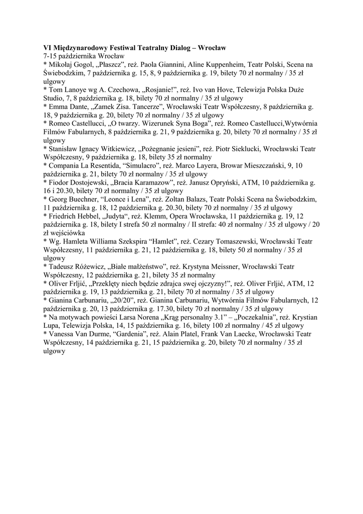 VI Międzynarodowy Festiwal Teatralny Dialog – Wrocław 7-15 października Wrocław * Mikołaj Gogol, „Płaszcz”, reż. Paola Giannini, Aline Kuppenheim, Teatr Polski, Scena na Świebodzkim, 7 października g. 15, 8, 9 października g. 19, bilety 70 zł normalny / 35 zł ulgowy * Tom Lanoye wg A. Czechowa, „Rosjanie!”, reż. Ivo van Hove, Telewizja Polska Duże Studio, 7, 8 października g. 18, bilety 70 zł normalny / 35 zł ulgowy * Emma Dante, „Zamek Zisa. Tancerze”, Wrocławski Teatr Współczesny, 8 października g. 18, 9 października g. 20, bilety 70 zł normalny / 35 zł ulgowy * Romeo Castellucci, „O twarzy. Wizerunek Syna Boga”, reż. Romeo Castellucci,Wytwórnia Filmów Fabularnych, 8 października g. 21, 9 października g. 20, bilety 70 zł normalny / 35 zł ulgowy * Stanisław Ignacy Witkiewicz, „Pożegnanie jesieni”, reż. Piotr Sieklucki, Wrocławski Teatr Współczesny, 9 października g. 18, bilety 35 zł normalny * Compania La Resentida, “Simulacro”, reż. Marco Layera, Browar Mieszczański, 9, 10 października g. 21, bilety 70 zł normalny / 35 zł ulgowy * Fiodor Dostojewski, „Bracia Karamazow”, reż. Janusz Opryński, ATM, 10 października g. 16 i 20.30, bilety 70 zł normalny / 35 zł ulgowy * Georg Buechner, “Leonce i Lena”, reż. Zoltan Balazs, Teatr Polski Scena na Świebodzkim, 11 października g. 18, 12 października g. 20.30, bilety 70 zł normalny / 35 zł ulgowy * Friedrich Hebbel, „Judyta“, reż. Klemm, Opera Wrocławska, 11 października g. 19, 12 października g. 18, bilety I strefa 50 zł normalny / II strefa: 40 zł normalny / 35 zł ulgowy / 20 zł wejściówka * Wg. Hamleta Williama Szekspira “Hamlet”, reż. Cezary Tomaszewski, Wrocławski Teatr Współczesny, 11 października g. 21, 12 października g. 18, bilety 50 zł normalny / 35 zł ulgowy * Tadeusz Różewicz, „Białe małżeństwo”, reż. Krystyna Meissner, Wrocławski Teatr Współczesny, 12 października g. 21, bilety 35 zł normalny * Oliver Frljić, „Przeklęty niech będzie zdrajca swej ojczyzny!”, reż. Oliver Frljić, ATM, 12 października g. 19, 13 października g. 21, bilety 70 zł normalny / 35 zł ulgowy * Gianina Carbunariu, „20/20”, reż. Gianina Carbunariu, Wytwórnia Filmów Fabularnych, 12 października g. 20, 13 października g. 17.30, bilety 70 zł normalny / 35 zł ulgowy * Na motywach powieści Larsa Norena „Krąg personalny 3.1” – „Poczekalnia”, reż. Krystian Lupa, Telewizja Polska, 14, 15 października g. 16, bilety 100 zł normalny / 45 zł ulgowy * Vanessa Van Durme, “Gardenia”, reż. Alain Platel, Frank Van Laecke, Wrocławski Teatr Współczesny, 14 października g. 21, 15 października g. 20, bilety 70 zł normalny / 35 zł ulgowy