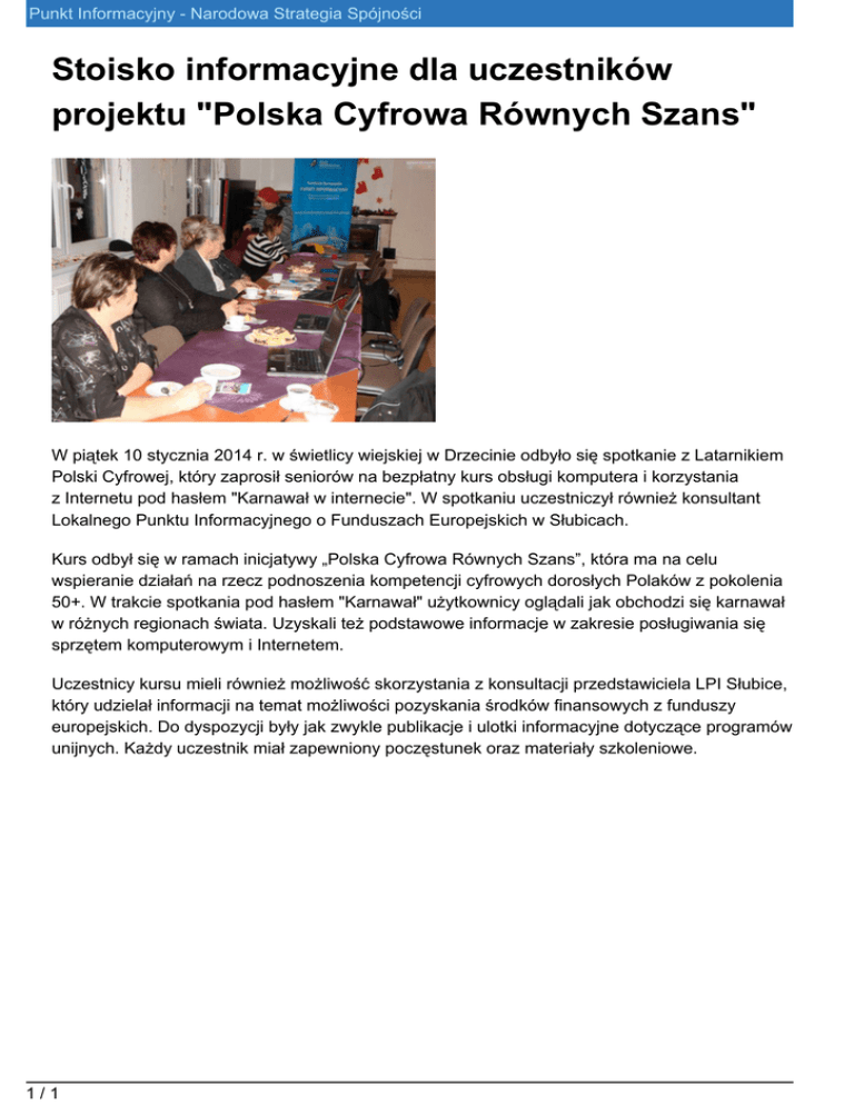 Punkt Informacyjny - Narodowa Strategia Spójności Stoisko informacyjne dla uczestników projektu "Polska Cyfrowa Równych Szans" W piątek 10 stycznia 2014 r. w świetlicy wiejskiej w Drzecinie odbyło się spotkanie z Latarnikiem Polski Cyfrowej, który zaprosił seniorów na bezpłatny kurs obsługi komputera i korzystania z Internetu pod hasłem "Karnawał w internecie". W spotkaniu uczestniczył również konsultant Lokalnego Punktu Informacyjnego o Funduszach Europejskich w Słubicach. Kurs odbył się w ramach inicjatywy „Polska Cyfrowa Równych Szans”, która ma na celu wspieranie działań na rzecz podnoszenia kompetencji cyfrowych dorosłych Polaków z pokolenia 50+. W trakcie spotkania pod hasłem "Karnawał" użytkownicy oglądali jak obchodzi się karnawał w różnych regionach świata. Uzyskali też podstawowe informacje w zakresie posługiwania się sprzętem komputerowym i Internetem. Uczestnicy kursu mieli również możliwość skorzystania z konsultacji przedstawiciela LPI Słubice, który udzielał informacji na temat możliwości pozyskania środków finansowych z funduszy europejskich. Do dyspozycji były jak zwykle publikacje i ulotki informacyjne dotyczące programów unijnych. Każdy uczestnik miał zapewniony poczęstunek oraz materiały szkoleniowe. 1/1