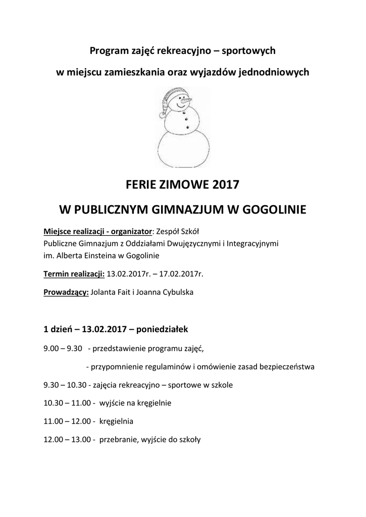 Program zajęć rekreacyjno – sportowych w miejscu zamieszkania oraz wyjazdów jednodniowych FERIE ZIMOWE 2017 W PUBLICZNYM GIMNAZJUM W GOGOLINIE Miejsce realizacji - organizator: Zespół Szkół Publiczne Gimnazjum z Oddziałami Dwujęzycznymi i Integracyjnymi im. Alberta Einsteina w Gogolinie Termin realizacji: 13.02.2017r. – 17.02.2017r. Prowadzący: Jolanta Fait i Joanna Cybulska 1 dzień – 13.02.2017 – poniedziałek 9.00 – 9.30 - przedstawienie programu zajęć, - przypomnienie regulaminów i omówienie zasad bezpieczeństwa 9.30 – 10.30 - zajęcia rekreacyjno – sportowe w szkole 10.30 – 11.00 - wyjście na kręgielnie 11.00 – 12.00 - kręgielnia 12.00 – 13.00 - przebranie, wyjście do szkoły 2 dzień – 14.02.2017 – wtorek 9.00 – 10.00 - gry zespołowe w szkole 10.00 – 10.30 - przejazd do kina w Krapkowicach 10.30 – 12.00 - kino 12.30 – 13.00 - przejazd do szkoły 3 dzień – 15.02.2017 – środa 9.00 - wyjście ze szkoły na pływalnię w Gogolinie 9.30 – 11.00 - zajęcia na basenie 11.00 – 12.00 - warsztaty na basenie 12.00 – 12.30 - przejście do szkoły 12.30 – 13.00 - zajęcia w szkole 4 dzień – 16.02.2017 – czwartek 9.00 – 10.30 - wyjazd na lodowisko ( przejazd, wypożyczenie łyżew itp. ) 10.30 – 11.30 - zajęcia na lodowisku 11.30 – 13.00 - przebranie i wyjazd do szkoły 5 dzień – 17.02.2017 – piątek 9.00 – 13.00 - zajęcia w szkole : - rozgrywki sportowe - zajęcia artystyczne - podsumowanie ferii zimowych w szkole Powyższy program w zależności od pogody i propozycji uczestników zajęć może być modyfikowany.