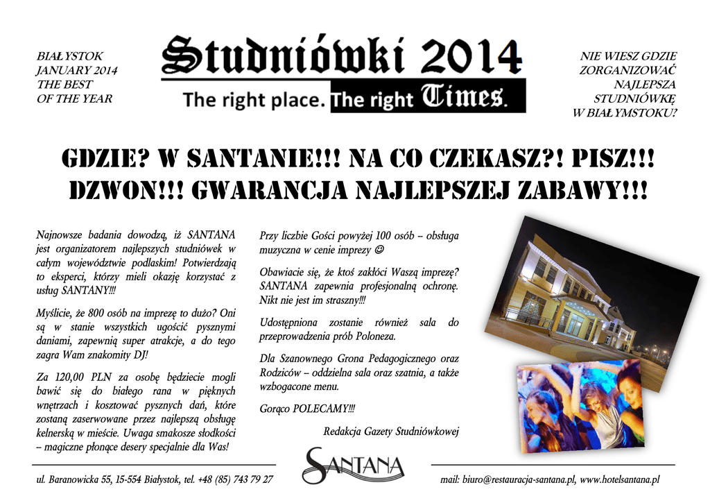 BIAŁYSTOK JANUARY 2014 THE BEST OF THE YEAR NIE WIESZ GDZIE ZORGANIZOWAĆ NAJLEPSZA STUDNIÓWKĘ W BIAŁYMSTOKU? GDZIE? W SANTANIE!!! NA CO CZEKASZ?! PISZ!!! DZWON!!! GWARANCJA NAJLEPSZEJ ZABAWY!!! Najnowsze badania dowodzą, iż SANTANA jest organizatorem najlepszych studniówek w całym województwie podlaskim! Potwierdzają to eksperci, którzy mieli okazję korzystać z usług SANTANY!!! Myślicie, że 800 osób na imprezę to dużo? Oni są w stanie wszystkich ugościć pysznymi daniami, zapewnią super atrakcje, a do tego zagra Wam znakomity DJ! Za 120,00 PLN za osobę będziecie mogli bawić się do białego rana w pięknych wnętrzach i kosztować pysznych dań, które zostaną zaserwowane przez najlepszą obsługę kelnerską w mieście. Uwaga smakosze słodkości – magiczne płonące desery specjalnie dla Was! Przy liczbie Gości powyżej 100 osób – obsługa muzyczna w cenie imprezy Obawiacie się, że ktoś zakłóci Waszą imprezę? SANTANA zapewnia profesjonalną ochronę. Nikt nie jest im straszny!!! Udostępniona zostanie również przeprowadzenia prób Poloneza. sala do Dla Szanownego Grona Pedagogicznego oraz Rodziców – oddzielna sala oraz szatnia, a także wzbogacone menu. Gorąco POLECAMY!!! ul. Baranowicka 55, 15-554 Białystok, tel. +48 (85) 743 79 27 Redakcja Gazety Studniówkowej mail: [email protected], www.hotelsantana.pl