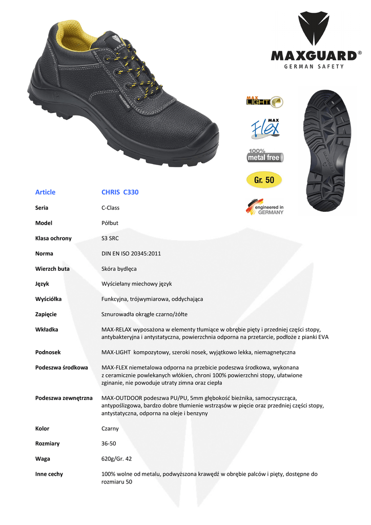 Article CHRIS C330 Seria C-Class Model Półbut Klasa ochrony S3 SRC Norma DIN EN ISO 20345:2011 Wierzch buta Skóra bydlęca Język Wyściełany miechowy język Wyściółka Funkcyjna, trójwymiarowa, oddychająca Zapięcie Sznurowadła okrągłe czarno/żółte Wkładka MAX-RELAX wyposażona w elementy tłumiące w obrębie pięty i przedniej części stopy, antybakteryjna i antystatyczna, powierzchnia odporna na przetarcie, podłoże z pianki EVA Podnosek MAX-LIGHT kompozytowy, szeroki nosek, wyjątkowo lekka, niemagnetyczna Podeszwa środkowa MAX-FLEX niemetalowa odporna na przebicie podeszwa środkowa, wykonana z ceramicznie powlekanych włókien, chroni 100% powierzchni stopy, ułatwione zginanie, nie powoduje utraty zimna oraz ciepła Podeszwa zewnętrzna MAX-OUTDOOR podeszwa PU/PU, 5mm głębokość bieżnika, samoczyszcząca, antypoślizgowa, bardzo dobre tłumienie wstrząsów w pięcie oraz przedniej części stopy, antystatyczna, odporna na oleje i benzyny Kolor Czarny Rozmiary 36-50 Waga 620g/Gr. 42 Inne cechy 100% wolne od metalu, podwyższona krawędź w obrębie palców i pięty, dostępne do rozmiaru 50