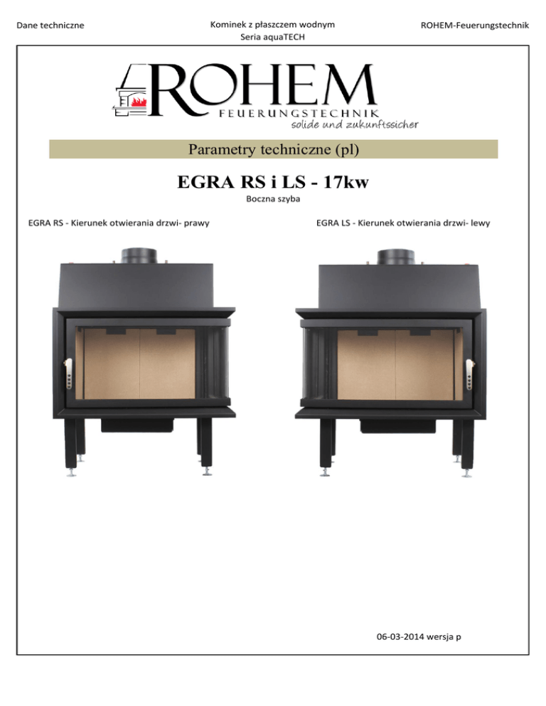Kominek z płaszczem wodnym Seria aquaTECH Dane techniczne ROHEM-Feuerungstechnik Parametry techniczne (pl) EGRA RS i LS - 17kw Boczna szyba EGRA RS - Kierunek otwierania drzwi- prawy EGRA LS - Kierunek otwierania drzwi- lewy 06-03-2014 wersja p Dane techniczne Kominek z płaszczem wodnym Seria aquaTECH ROHEM-Feuerungstechnik Dane techniczne Moc całkowita Moc płaszcza wodnego Moc powietrzna Ciężar Pojemność wody Sprawność Maksymalna długość polan Średnica rury dymnej standardowo Płaszcz wewnętrzny Wyłożenie podłogi Zewnętrzny dolot powietrza* Możliwość przyłączenia świeżego powietrza zewnętrznego Maksymalne ciśnienie pracy Kurtyna powietrzna Dopuszczalne paliwa Emisja CO przy 13% tlenu Zawartość pyłu z drewna Numer kontroli Numer DIN EN BimSchV Stufe 1 BimSchV Stufe 2 Numer CH - VKF Znak CE Norma AT §15a B-VG Odstępy od części palnych Palenie ciągłe Dane do obliczenia wielkości komina Przepływ masy gazów spalinowych Temperatura gazów Wymagany ciąg Wielokrotne wykorzystanie komina (typ A1) kW kW kW kg l % cm mm bar mg/m³ mg/m³ cm g/s °C mPa 17 10,5 6,5 215 36 ~81 50 180 Wermikulit Stal specjalna Tak (120mm) DUO 2 stronnie- boki* w zależności od bocznej szyby 2,5 Tak Drewno 1041 33,49 35/10-LG/2011 EN 13229 Tak Tak Nie Tak Tak 8 + 10 izolacji cieplnej Tak 12,76 246 12 Opcjonalnie *Ten wkład kominkowy jest zbudowany niezależnie od powietrza otoczenia. Ale nie certyfikat DIBT. Akcesoria opcjonalne Drzwi samozamykające Szyba samoczyszcząca Średnica rury spalinowej(mm)* Wyposażenie dodatkowe Zsyp popiołu pod kominek lub do piwnicy **W zależności od przydatności komina ta opcja jest możliwa. Zastrzegamy sobie prawo do błędów w opisach i parametrach technicznych. Tak Tak 160/180/200 na zapytanie na zapytanie Dane techniczne Kominek z płaszczem wodnym Seria aquaTECH ROHEM-Feuerungstechnik