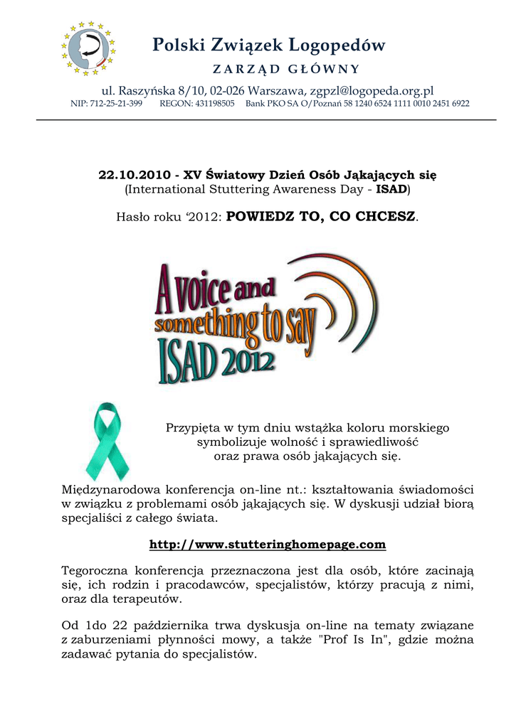 Polski Związek Logopedów ZARZĄD GŁÓWNY ul. Raszyńska 8/10, 02-026 Warszawa, [email protected] NIP: 712-25-21-399 REGON: 431198505 Bank PKO SA O/Poznań 58 1240 6524 1111 0010 2451 6922 22.10.2010 - XV Światowy Dzień Osób Jąkających się (International Stuttering Awareness Day - ISAD) Hasło roku ‘2012: POWIEDZ TO, CO CHCESZ. Przypięta w tym dniu wstążka koloru morskiego symbolizuje wolność i sprawiedliwość oraz prawa osób jąkających się. Międzynarodowa konferencja on-line nt.: kształtowania świadomości w związku z problemami osób jąkających się. W dyskusji udział biorą specjaliści z całego świata. http://www.stutteringhomepage.com Tegoroczna konferencja przeznaczona jest dla osób, które zacinają się, ich rodzin i pracodawców, specjalistów, którzy pracują z nimi, oraz dla terapeutów. Od 1do 22 października trwa dyskusja on-line na tematy związane z zaburzeniami płynności mowy, a także "Prof Is In", gdzie można zadawać pytania do specjalistów. Udział w dyskusji odzwierciedla zawodowe problemy osób jąkających się na całym świecie. ISAD uznaje rosnący sojusz między terapeutami mowy i języka oraz pacjentami, którzy uczą się od siebie współpracy, udzielają wsparcia podczas akcji. Edukowanie siebie i ogółu społeczeństwa ma wpływ na naświetlanie problemu jąkania, które ma olbrzymi wpływ na życie jednostek. W dniach 19 – 21 października 2012 w Akademii Wychowania Fizycznego w Katowicach odbędzie się Ogólnopolski Zjazd Osób Jąkających się. Organizatorem jest Ogólnopolskie Stowarzyszenie Osób Jąkających się OSTOJA – Klub J Katowice. W ramach zjazdu przewidziane są panele dyskusyjne dotyczące funkcjonowania osób jąkających się w społeczeństwie, zwłaszcza na rynku pracy, a także wykłady i warsztaty praktykujących logopedów oraz psychologów. W poniedziałek, 22 października 2012 roku, od godziny 17.00 do 22.00 logopedzi-eksperci zajmujący się terapią jąkania z całej Polski udzielać będą wskazówek i porad na platformie internetowej – FB, Skype. Szczegółowy program na stronie www.logopeda.org.pl Zapraszamy. Z poważaniem Zarząd Główny Polskiego Związku Logopedów Małgorzata Konczanin