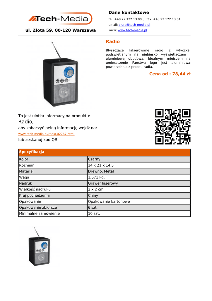 Dane kontaktowe tel. +48 22 122 13 00 , fax. +48 22 122 13 01 email: [email protected] ul. Złota 59, 00-120 Warszawa www: www.tech-media.pl Radio Błyszczące lakierowane radio z wtyczką, podświetlanym na niebiesko wyświetlaczem i aluminiową obudową. Idealnym miejscem na umieszczenie Państwa logo jest aluminiowa powierzchnia z przodu radia. Cena od : 78,44 zł To jest ulotka informacyjna produktu: Radio, aby zobaczyć pełną informację wejdź na: www.tech-media.pl/radio,02767.html lub zeskanuj kod QR. Specyfikacja Kolor Czarny Rozmiar 14 x 21 x 14,5 Materiał Drewno, Metal Waga 1,671 kg. Nadruk Grawer laserowy Wielkość nadruku 3 x 2 cm Kraj pochodzenia Chiny Opakowanie Opakowanie kartonowe Opakowanie zbiorcze 6 szt. Minimalne zamówienie 10 szt.