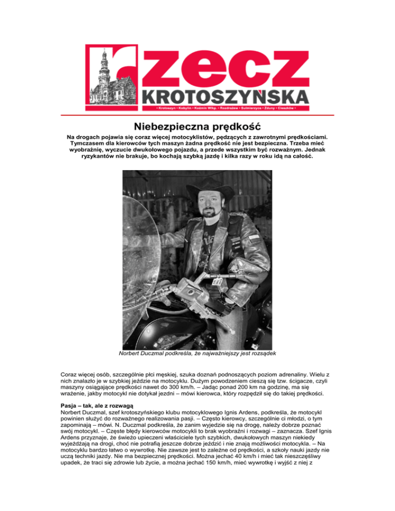 Niebezpieczna prędkość Na drogach pojawia się coraz więcej motocyklistów, pędzących z zawrotnymi prędkościami. Tymczasem dla kierowców tych maszyn żadna prędkość nie jest bezpieczna. Trzeba mieć wyobraźnię, wyczucie dwukołowego pojazdu, a przede wszystkim być rozważnym. Jednak ryzykantów nie brakuje, bo kochają szybką jazdę i kilka razy w roku idą na całość. Norbert Duczmal podkreśla, że najważniejszy jest rozsądek Coraz więcej osób, szczególnie płci męskiej, szuka doznań podnoszących poziom adrenaliny. Wielu z nich znalazło je w szybkiej jeździe na motocyklu. Dużym powodzeniem cieszą się tzw. ścigacze, czyli maszyny osiągające prędkości nawet do 300 km/h. – Jadąc ponad 200 km na godzinę, ma się wrażenie, jakby motocykl nie dotykał jezdni – mówi kierowca, który rozpędził się do takiej prędkości. Pasja – tak, ale z rozwagą Norbert Duczmal, szef krotoszyńskiego klubu motocyklowego Ignis Ardens, podkreśla, że motocykl powinien służyć do rozważnego realizowania pasji. – Często kierowcy, szczególnie ci młodzi, o tym zapominają – mówi. N. Duczmal podkreśla, że zanim wyjedzie się na drogę, należy dobrze poznać swój motocykl. – Częste błędy kierowców motocykli to brak wyobraźni i rozwagi – zaznacza. Szef Ignis Ardens przyznaje, że świeżo upieczeni właściciele tych szybkich, dwukołowych maszyn niekiedy wyjeżdżają na drogi, choć nie potrafią jeszcze dobrze jeździć i nie znają możliwości motocykla. – Na motocyklu bardzo łatwo o wywrotkę. Nie zawsze jest to zależne od prędkości, a szkoły nauki jazdy nie uczą techniki jazdy. Nie ma bezpiecznej prędkości. Można jechać 40 km/h i mieć tak nieszczęśliwy upadek, że traci się zdrowie lub życie, a można jechać 150 km/h, mieć wywrotkę i wyjść z niej z niewielkimi obrażeniami. Najważniejsze, by poruszać się po drodze z rozsądkiem i mieć świadomość tego, co się może wydarzyć – zwraca uwagę N. Duczmal. Nie daj się zabić i nie zabijaj Tak mocne słowa znalazły się w apelu sformułowanym przez policjantów z Komendy Powiatowej Policji w Krotoszynie. – W większości kościołów powiatu krotoszyńskiego apel został odczytany przez księży – informuje Włodzimierz Szał, rzecznik prasowy krotoszyńskiej policji. My również go zamieszczamy. Niech będzie przestrogą. Apelujemy do motocyklistów o zachowanie umiaru podczas pierwszych przed wiosennych wycieczek. Coraz częściej odbieramy sygnały o brawurze na „ścigaczach”. Motocykle, które pojawiają się na naszych drogach, posiadają niebezpieczną dla nierozważnych kierowców moc. Należy pamiętać, że nawierzchnia jezdni po zimie jest zanieczyszczona i przyczepność motocykla nie jest prawidłowa. Twarde, nierozgrzane opony tych pojazdów stają się śliskie i niebezpieczne. Duże natężenie ruchu i dziury w jezdni również nie sprzyjają tego typu pojazdom. Motocykl to pojazd, na którym zwykłe ubranie jest niewystarczające. Warto zadbać o właściwy kombinezon z elementami bezpieczeństwa oraz właściwy kask z atestami. Dlatego apelujemy o rozwagę. Bądźmy na drodze rozważni. Pamiętaj! Życie masz tylko jedno: nie daj się zabić i nie zabijaj… Anna Szklarek Rzecz Krotoszyńska, nr 17/835, 26 kwietnia 2011 r