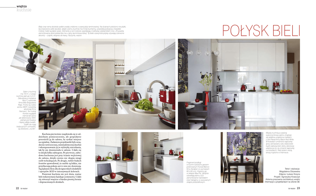 wnętrza kuchnie Połysk bieli Blaty oraz rama dookoła szafek zostały zrobione z szarej płyty laminowanej. Na ścianach położono nie płytki, lecz barwione szkło lacobel, dzięki czemu kuchnia ma mniej kuchenny, a bardziej pokojowy charakter. Cokoły mebli są także szare. Elementy w tym kolorze współgrają z lodówką i piekarnikiem inox. Zmywarka zamontowana obok piekarnika ma u góry aluminiowa listwę. Tę biało-szarą kolorystykę ożywiają czerwone akcenty – czajnik, ekspres do kawy, naczynia, wazon. Salon z kuchnią ma 19 m2, z czego kuchnia zajmuje 3,4 m2. Zabudowę w kształcie litery C wykonała firma Max Bogusława Klaja. Fronty są z płyty acrilux (mdf z powłoką akrylową) firmy Niemann. Ten rodzaj frontów wygląda niemal tak samo jak lakierowany mdf, jednak jest trwalszy i lepiej odbija światło. Szafki nie mają tradycyjnych uchwytów, są otwierane „na klik”. Kuchnia pierwotnie znajdowała się w oddzielnym pomieszczeniu, ale gospodarze przenieśli ją do salonu, by zyskać miejsce na sypialnię. Zadaniem projektantki było urządzenie nowoczesnej, minimalistycznej kuchni i wkomponowanie jej w stylistykę mieszkania, tak by nie dominowała w salonie. Udało się to dzięki kilku zabiegom. Po pierwsze, zabudowa kuchenna jest przy ścianie wejściowej do salonu, dzięki czemu nie skupia uwagi osób wchodzących. Po drugie, wybór białych frontów spowodował, że meble są lekkie, nie przytłaczają pokoju ani w nim nie dominują. Są pięknym tłem dla designerskich dodatków i sprzętów agd w intensywnych kolorach. Ponieważ kuchnia nie jest duża, ważne było wykorzystanie każdego centymetra. Udało się stworzyć wnętrze o bardzo prostej formie i dopracowanych detalach. 22 tak mieszkam Między kuchnią a częścią wypoczynkową salonu znajduje się jadalnia urządzona meblami z serii Reset firmy Black Red White. W krzesłach zmieniono tapicerkę (przy zamawianiu sofy właściciele kupili większą ilość skóry obiciowej właśnie po to, by zmienić tapicerkę na krzesłach). Nad stołem wiszą lampy kupione w Internecie. Fragment podłogi w kuchni wyłożono gresem polerowanym Kursal Blanco firmy Keraben (o wymiarach 60 x 60 cm). Kupiono go w sklepie Max-Fliz. Wnętrze oświetlają taśmy LED zamontowane nad blatem oraz halogeny w wysuwanym okapie podszafkowym. Tekst i stylizacja: Magdalena Olszewska Zdjęcia: Łukasz Kozyra Projekt: Agnieszka Krawczyk /Artema pracownia architektury wnętrz Informacje o projektantach na stronie 98. tak mieszkam 23