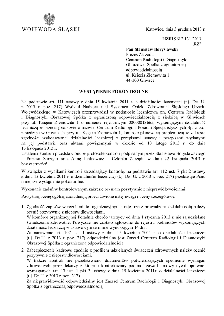 WO J E WO D A Ś LĄ S KI Katowice, dnia 3 grudnia 2013 r. NZIII.9612.131.2013 „RZ” Pan Stanisław Borysławski Prezes Zarządu Centrum Radiologii i Diagnostyki Obrazowej Spółka z ograniczoną odpowiedzialnością ul. Księcia Ziemowita 1 44-100 Gliwice WYSTĄPIENIE POKONTROLNE Na podstawie art. 111 ustawy z dnia 15 kwietnia 2011 r. o działalności leczniczej (t.j. Dz. U. z 2013 r. poz. 217) Wydział Nadzoru nad Systemem Opieki Zdrowotnej Śląskiego Urzędu Wojewódzkiego w Katowicach przeprowadził w podmiocie leczniczym pn. Centrum Radiologii i Diagnostyki Obrazowej Spółka z ograniczoną odpowiedzialnością z siedzibą w Gliwicach przy ul. Księcia Ziemowita 1 o numerze rejestrowym 00000013665, wykonującym działalność leczniczą w przedsiębiorstwie o nazwie: Centrum Radiologii i Poradni Specjalistycznych Sp. z o.o. z siedzibą w Gliwicach przy ul. Księcia Ziemowita 1, kontrolę planowaną problemową w zakresie zgodności wykonywanej działalności leczniczej z przepisami ustawy i przepisami wydanymi na jej podstawie oraz aktami powiązanymi w okresie od 18 lutego 2013 r. do dnia 15 listopada 2013 r. Ustalenia kontroli przedstawiono w protokole kontroli podpisanym przez Stanisława Borysławskiego – Prezesa Zarządu oraz Annę Jankiewicz – Członka Zarządu w dniu 22 listopada 2013 r. bez zastrzeŜeń. W związku z wynikami kontroli zarządzający kontrolę, na podstawie art. 112 ust. 7 pkt 2 ustawy z dnia 15 kwietnia 2011 r. o działalności leczniczej (t.j. Dz. U. z 2013 r. poz. 217) przekazuje Panu niniejsze wystąpienie pokontrolne. Wykonanie zadań w kontrolowanym zakresie oceniam pozytywnie z nieprawidłowościami. PowyŜszą ocenę ogólną uzasadniają przedstawione niŜej uwagi i oceny szczegółowe. 1. Zgodność zapisów w regulaminie organizacyjnym i rejestrze z prowadzoną działalnością naleŜy ocenić pozytywnie z nieprawidłowościami. W komórce organizacyjnej Poradnia chorób tarczycy od dnia 1 stycznia 2013 r. nie są udzielane świadczenia zdrowotne. PowyŜsze nie zostało zgłoszone do rejestru podmiotów wykonujących działalność leczniczą w ustawowym terminie wynoszącym 14 dni. Za naruszenie art. 107 ust. 1 ustawy z dnia 15 kwietnia 2011 r. o działalności leczniczej (t.j. Dz.U. z 2013 r. poz. 217) odpowiedzialny jest Zarząd Centrum Radiologii i Diagnostyki Obrazowej Spółka z ograniczoną odpowiedzialnością. 2. Zabezpieczenie kadrowe zgodnie z profilem udzielanych świadczeń zdrowotnych naleŜy ocenić pozytywnie z nieprawidłowościami. W trakcie kontroli nie przedstawiono dokumentów potwierdzających spełnienie wymagań zdrowotnych przez lekarzy z którymi kontrolowany podmiot zawarł umowy cywilnoprawne, wymaganych art. 17 ust. 1 pkt 3 ustawy z dnia 15 kwietnia 2011r. o działalności leczniczej (t.j. Dz.U. z 2013 r. poz. 217). Za nieprawidłowość odpowiedzialny jest Zarząd Centrum Radiologii i Diagnostyki Obrazowej Spółka z ograniczoną odpowiedzialnością. 3. Spełnienie przez wyroby medyczne wykorzystywane w procesie udzielania świadczeń zdrowotnych wymagań określonych w odrębnych przepisach naleŜy ocenić pozytywnie. 4. Spełnienie obowiązku zawarcia umowy odpowiedzialności cywilnej odpowiedzialności cywilnej obejmującej szkody będące następstwem udzielania świadczeń zdrowotnych albo niezgodnego z prawem zaniechania udzielania świadczeń zdrowotnych naleŜy ocenić pozytywnie. 5. Dokumentację organizacyjną podmiotu leczniczego naleŜy ocenić pozytywnie. 6. Pomieszczenia przedsiębiorstwa podmiotu leczniczego naleŜy ocenić pozytywnie. Mając na uwadze powyŜsze oceny i uwagi zalecam: 1. Dokonać wykreślenia komórki organizacyjnej z rejestru podmiotów wykonujących działalność leczniczą, bądź nawiązać współpracę z lekarzem zabezpieczającym obsadę kadrową w Poradni chorób tarczycy w terminie 14 dni od daty doręczenia niniejszego wystąpienia pokontrolnego. 2. Przedstawienie organowi kontrolującemu uwierzytelnionych kopii dokumentów potwierdzających spełnienie wymagań zdrowotnych dla lekarzy, z którymi zawarto umowy cywilnoprawne w terminie 30 dni od daty doręczenia niniejszego wystąpienia pokontrolnego. Oczekuję przedstawienia przez Zarząd Centrum Radiologii i Diagnostyki Obrazowej Spółka z ograniczoną odpowiedzialnością. w wyŜej wymienionych terminach informacji o sposobie wykonania zaleceń bądź o działaniach podjętych w celu ich realizacji lub przyczynach niepodjęcia takich działań. Niezrealizowanie zaleceń pokontrolnych skutkuje zastosowaniem procedury przewidzianej w art. 108 ust. 2 pkt 4) ustawy z dnia 15 kwietnia 2011 r. o działalności leczniczej (t.j. Dz. U. z 2013 r. poz. 217). z up. WOJEWODY ŚLĄSKIEGO (-) Ireneusz Ryszkiel Dyrektor Wydziału Nadzoru nad Systemem Opieki Zdrowotnej …............................................................................ (Podpis zarządzającego kontrolą) Do wiadomości: 1. Wydział Kontroli i Audytu Śląskiego Urzędu Wojewódzkiego w Katowicach, 2. Oddział Rejestracji Podmiotów Leczniczych Wydziału Nadzoru nad Systemem Opieki Zdrowotnej Śląskiego Urzędu Wojewódzkiego w Katowicach, 3. a/a. WO J E WO D A Ś LĄ S KI Katowice, dnia 3 grudnia 2013 r. NZIII.9612.131.2013 „RZ” Pani Anna Jankiewicz Członek Zarządu Centrum Radiologii i Diagnostyki Obrazowej Spółka z ograniczoną odpowiedzialnością ul. Księcia Ziemowita 1 44-100 Gliwice WYSTĄPIENIE POKONTROLNE Na podstawie art. 111 ustawy z dnia 15 kwietnia 2011 r. o działalności leczniczej (t.j. Dz. U. z 2013 r. poz. 217) Wydział Nadzoru nad Systemem Opieki Zdrowotnej Śląskiego Urzędu Wojewódzkiego w Katowicach przeprowadził w podmiocie leczniczym pn. Centrum Radiologii i Diagnostyki Obrazowej Spółka z ograniczoną odpowiedzialnością z siedzibą w Gliwicach przy ul. Księcia Ziemowita 1 o numerze rejestrowym 00000013665, wykonującym działalność leczniczą w przedsiębiorstwie o nazwie: Centrum Radiologii i Poradni Specjali