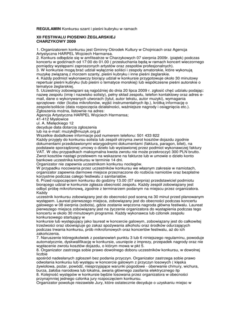 REGULAMIN Konkursu szant i pieśni kubryku w ramach XII FESTIWALU PIOSENKI ŻEGLARSKIEJ CHARZYKOWY 2009 1. Organizatorem konkursu jest Gminny Ośrodek Kultury w Chojnicach oraz Agencja Artystyczna HARPEL Wojciech Harmansa. 2. Konkurs odbędzie się w amfiteatrze w Charzykowych 07 sierpnia 2009r. (piątek) podczas koncertu w godzinach od 17:00 do 01.00 ( przesłuchania będą w ramach koncert wieczornego pomiędzy występami zaproszonych artystów oraz zespołów profesjonalnych). 3. W konkursie mogą brać udział wyłącznie soliści i zespoły amatorskie, które wykonują muzykę związaną z morzem szanty, pieśni kubryku i inne pieśni żeglarskie. 4. Każdy podmiot wykonawczy biorący udział w konkursie przygotowuje około 30 minutowy repertuar pieśni kubryku (lub pieśni o tematyce morskiej) lub współczesne pieśni autorskie o tematyce żeglarskiej. 5. Uczestnicy zobowiązani są najpóźniej do dnia 20 lipca 2009 r. zgłosić chęć udziału podając: nazwę zespołu (imię i nazwisko solisty), pełny skład zespołu, telefon kontaktowy oraz adres email, dane o wykonywanych utworach (tytuł, autor tekstu, autor muzyki), wymagania sprzętowe- rider (liczba mikrofonów, wyjść instrumentalnych itp.), krótką informację o zespole/soliście (data rozpoczęcia działalności, ważniejsze nagrody i osiągnięcia etc.). Zgłoszenia można, listownie na adres: Agencja Artystyczna HARPEL Wojciech Harmansa; 41-412 Mysłowice ul. A. Mielęckiego 12 decyduje data dotarcia zgłoszenia lub na e-mail: [email protected] Wszelkie dodatkowe informacje pod numerem telefonu: 501 433 822 Każdy przyjęty do konkursu solista lub zespół otrzyma zwrot kosztów dojazdu zgodnie dokumentami przedstawionymi wiarygodnymi dokumentami (faktura, paragon, bilet), na podstawie sporządzonej umowy o dzieło lub wystawionej przez podmiot wykonawczej faktury VAT. W obu przypadkach maksymalna kwota zwrotu nie może przekroczyć 300 PLN brutto. Zwrot kosztów nastąpi przelewem na wskazane na fakturze lub w umowie o dzieło konto bankowe uczestnika konkursu w terminie 14 dni. Organizator nie zapewnia uczestnikom konkursu noclegów. W przypadku nocowania przez uczestników konkursu we własnym zakresie w namiotach, organizator zapewnia darmowe miejsce przeznaczone do rozbicia namiotów oraz bezpłatne korzystnie podczas całego festiwalu z sanitariatów. 6. Przed rozpoczęciem konkursu do godziny 13.00 (07 sierpnia) przedstawiciel podmiotu biorącego udział w konkursie zgłasza obecność zespołu. Każdy zespół zobowiązany jest odbyć próbę mikrofonową, zgodnie z terminarzem podanym na miejscu przez organizatora. Każdy uczestnik konkursu zobowiązany jest do obecności pod sceną na 30 minut przed planowanym występem. Laureat pierwszego miejsca, zobowiązany jest do obecności podczas koncertu galowego w 08 sierpnia (sobota), gdzie zostanie wręczona nagroda główna festiwalu. Laureat pierwszego miejsca zobowiązany jest na życzenie organizatora do wystąpienia podczas tego koncertu w około 30 minutowym programie. Każdy wykonawca lub członek zespołu konkursowego startujący w konkursie lub występujący jako laureat w koncercie galowym, zobowiązany jest do całkowitej trzeźwości oraz obowiązuje go zakaz spożywania alkoholu oraz środków odurzających podczas trwania konkursu, prób mikrofonowych oraz koncertów festiwalu, aż do ich zakończenia. 7. Naruszenie któregokolwiek z postanowień punktu 3 lub 6 niniejszego regulaminu, powoduje automatycznie, dyskwalifikację w konkursie, usunięcie z imprezy, przepadek nagrody oraz nie wypłacenie zwrotu kosztów dojazdu, o którym mowa w pkt 5. 8. Organizator zastrzega sobie prawo dowolnego doboru uczestników konkursu, w dowolnej liczbie spośród nadesłanych zgłoszeń bez podania przyczyn. Organizator zastrzega sobie prawo odwołania konkursu lub występu w koncercie galowym z przyczyn losowych ( klęska żywiołowa, pożar, powódź, niesprzyjające warunki pogodowe - oberwanie chmury, wichura, burza, żałoba narodowa lub lokalna, awaria głównego zasilania elektrycznego itp 8. Kolejność występów w konkursie będzie losowana przez organizatora w obecności przynajmniej jednego członka jury rozpoczęciem konkursu. Organizator powołuje niezawisłe Jury, które ostatecznie decyduje o uzyskaniu miejsc w konkursie i przyznaniu nagród. Skład Jury: Agnieszka Krajewska - członek jury Małgorzata Szpera - członek jury Mirosław Kowalewski — przewodnicz jury Michał Smoliński — członek jury 9. W wypadku niemożliwości przybycia któregoś z członków Jury organizator powołuje na jego miejsce inną osobę, tak aby Jury było czteroosobowe. 10. Zwycięzca konkursu otrzymuje następująca nagrody: Wielki Pagaj Ottona Weilanda, zaproszenie do udziału w Festiwalu Piosenki Żeglarskiej Charzykowy 2010 r., nominacja do udziału w przesłuchaniach konkursowych festiwalu Shanties 2010 i Nagroda główna: 3000 PLN ( trzy tysiące zł) brutto. 11. Jury może ustalić inne niż określone w pkt. 10 wyróżnienie. 12. Otrzymanie wyróżnienia jest niezależne od uzyskanych miejsc tzn. uczestnik może zająć np. I miejsce i otrzymać wyróżnienie. 13. Jury ma prawo nie przyznać jednej lub wszystkich nagród i wyróżnień, o których mowa w pkt. 10. 14. Uczestnicy wykonują swój repertuar na żywo. Niedozwolone jest użycie playbacku lub półplaybacku. Niezastosowanie się do powyższego spowoduje dyskwalifikację wykonawcy. 15. Jury podejmuje decyzję o przyznaniu nagród opisanych w pkt. 10 i 11 na posiedzeniu bezpośrednio po zakończeniu przesłuchań konkursowych i sporządza werdykt. Członków Jury obowiązuje bezwzględna tajemnica werdyktu aż do momentu odczytania werdyktu. 16. Werdykt Jury będzie odczytany na koncercie galowym festiwalu 08 sierpnia 2009r. w sobotę ok. godz. 19.00 i jest połączony z wręczeniem nagród. 17. Zaleca się uczestnikom, aby planowany czas ich przebywania na scenie nie przekroczył 30 min wraz z