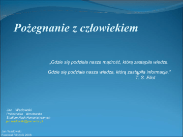 Pożegnanie z człowiekiem „Gdzie się podziała nasza mądrość, którą zastąpiła wiedza. Gdzie się podziała nasza wiedza, którą zastąpiła informacja.” T. S. Eliot Jan Wadowski Politechnika Wrocławska Studium Nauk Humanistycznych [email protected] Jan Wadowski Festiwal Filozofii 2008 Bioniczny myśliciel Jan Wadowski Festiwal Filozofii 2008 Utopia Wizja idealnych społeczeństw i sposobów życia Utopie abstrakcyjne Utopie konkretne Utopie mogą spełniać bardzo ważną rolę relatywizując określone przekonania i rzekome konieczności życia ludzkiego. Prawdziwy utopista głęboko wierzy w możliwość realizacji własnej wizji. Są trzy rodzaje utopii – psychologiczno-etyczne społeczno - cywilizacyjne naukowo - techniczne Jan Wadowski Festiwal Filozofii 2008 Utopista – duch niepogodzony Jest to ktoś, kto nie godzi się z istniejącą rzeczywistością i poszukuje jakiegoś ideału. Żyjąc w tym rozdarciu między tym, co jest a tym, co jest pomyślane (możliwość), utopista tworzy wizje. Wierzy on, że jego rozwiązania nie są oderwane od przyszłej rzeczywistości i często podejmuje działania w celu jej przybliżenia. Bez utopii nie ma zmiany, postępu, działania. Utopie mogą być zrealizowane dzięki technologiom Jan Wadowski Festiwal Filozofii 2008 Widmo technologii Jan Wadowski Festiwal Filozofii 2008 Transhumanizm (transhuman - skrót od transistory human, "przejściowa forma człowieka") „Transhumanizm to klasa filozofii, które próbują kierować nas w stronę kondycji postludzkiej. Transhumanizm dzieli wiele elementów z humanizmem przede wszystkim szacunek dla rozumu i nauki, nacisk na postęp i docenianie roli człowieczeństwa (czy transczłowieczeństwa) w życiu. Transhumanizm różni się od humanizmu przez oczekiwanie na radykalne zmiany w naszej naturze i dostępnych nam możliwościach oferowanych nam przez różne nauki i technologie.„ Max More Jan Wadowski Festiwal Filozofii 2008 Ruch intelektualno – kulturowy, pozytywnie odnoszący się do możliwości, jak i potrzeby, fundamentalnej zmiany ludzkiej kondycji, szczególnie poprzez wykorzystanie technologii do wyeliminowania procesu starzenia się i do ogromnego udoskonalenia intelektualnych, fizycznych i psychicznych możliwości człowieka Transhumaniści rozpatrują ludzką naturę jako „pracę w toku", otwarty proces, niedopracowany początek, który możemy nauczyć się modyfikować w pożądany sposób. Transhumaniści mają nadzieję, że poprzez odpowiedzialne użycie nauki, technologii i innych racjonalnych środków zostaniemy w końcu postludźmi (posthuman), istotami z wybitnie większymi Jan Wadowski możliwościami niż ludzie, jakimi jesteśmy obecnie. Festiwal Filozofii 2008 Tezy transhumanizmu 1. Przyszłość ludzkości będzie radykalnie zmieniona przez technologie 2. Nowe technologie powinny być wykorzystane dla dobra ludzkości. 3. Pozwolą one przekroczyć nasze ograniczenia biologiczne, psychologiczne itp. 4. Nowe technologie mogą być bardzo niebezpieczne. 5. Trzeba uwzględnić dobro wszystkich, w tym również zwierząt. Jan Wadowski Festiwal Filozofii 2008 GRIN Genetyka, robotyka, informatyka, nanotechnologia Około 12% amerykanów można określić jako „cyborgi”. „Cyborgizacja” oznacza integrację organizmu biologicznego z technologią. Jan Wadowski Festiwal Filozofii 2008 Technologia Technologia - Wiedza o sposobach przetwarzania surowców i wytwarzania wyrobów. Technologia jest sumą pośrednictw pomiędzy nami a światem natury i sumą tych rozłączeń pośredniczących nas nawzajem. Technologia w przeciwieństwie do narzędzi jest produktem wielko - skalowych systemów wydobycia, produkcji, dystrybucji i konsumpcji. Technologia staje się podstawową przestrzenią relacji społecznych oraz indywidualnych. Technologia jako sztuka osiągnięcia nieśmiertelności i szczęścia oraz przekroczenia człowieczeństwa. Jan Wadowski Festiwal Filozofii 2008 Prawo Moore’a Coraz mniejsze i coraz bardziej kompatybilne z człowiekiem komputery zrównają się z możliwościami jego mózgu w 2020 roku. W 2030 r. moc komputerów przewyższy mózg człowieka dwukrotnie a w 2085 jeden komputer będzie miał moc obliczeniową i pamięć 8 miliardów ludzi. Komputery będą myśleć za nas i podejmować optymalne decyzje. Elementy sztucznej inteligencji wszczepiane będą bezpośrednio do mózgu, co w znaczący sposób zmieni postrzeganie przez człowieka swego życia i jego sensu. Zbliża się epoka biolektronicznej hybrydyzacji człowieka (człowiek bioniczny). Jan Wadowski Festiwal Filozofii 2008 Antropotechnologia 1. Następuje coraz większe sprzężenie człowieka z komputerem i siecią. 2. Sztuczna inteligencja będzie wspomagać człowieka a nawet kierować jego życiem. 3. Nanotechnologia umożliwi człowiekowi o wiele dłuższe życie oraz zapewni nieograniczoną ilość wszelkich dóbr. 4. Wkroczą leki prokognitywne, stymulatory i blokery oraz sieci neuronowe sprzężone z mózgiem ludzkim. 5. Nastąpi bioelektroniczna hybrydyzacja człowieka. 6. Nastąpi genetyczne wspomaganie i planowane. 7. Ludzka świadomość będzie przechowywana w sieci. 8. Człowiek będzie mógł otrzymać sztuczne ciało. 9. Człowiek zaadoptuje się do życia na innych planetach. 10. Powstanie Istota postludzka, która zastąpi człowieka. Jan Wadowski Festiwal Filozofii 2008 Nanotechnologia To ogólna nazwa technik i sposobów tworzenia rozmaitych struktur o rozmiarach nanometrycznych, wiąże się z opanowaniem technologii manipulowania i przekształcaniem materii w skali pojedynczych atomów, czyli odległości rzędu nanometrów. Info-człowiek - Możliwość wszczepiania do mózgu nanokomputerowych implantów zawierających gotową wiedzę. Jan Wadowski Festiwal Filozofii 2008 Nanoświat XXI wieku Nanonauka zajmuje się badaniami zjawisk i manipulowaniem materiałami w skali atomowej, cząsteczkowej i makrocząsteczkowej. Zadaniem nanotechnologii jest proj