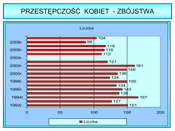 PRZESTĘPCZOŚĆ KOBIET - ZBÓJSTWA Liczba 104 88 2008r. 118 116 112 2006r. 2004r. 121 2002r. 161 149 136 124 2000r. 1998r. 150 134 143 138 1996r. 1994r 167 127 1992r. 151 0 50 100 Liczba 150 200 PRZESTĘPCZOŚĆ KOBIET - ZABÓJSTWO % 18 16 16,9 15,3 14 12 10 13,3 13,2 13,1 14,6 15,1 13,3 12,9 13,2 13,9 11,9 11,7 13,8 13,0 11,5 11,5 8 6 4 % 2009r. 2008r. 2007r. 2006r. 2005r. 2004r. 2003r. 2002r. 2001r. 2000r. 1999r. 1998r. 1997r. 1996r. 1995r. 1994r 1993r. 1992r. 2 0 PRZESTĘPCZOŚĆ KOBIET Podejrzane o spowodowanie uszczerbku na zdrowiu - % kobiet do ogółu 7,6 7,6 7,9 7,3 7,4 7,8 7,4 7,6 7,4 7,2 7,1 7,0 7,1 7,2 8,4 8,7 6,2 6,1 19 92 19 r. 93 r 19 . 94 19 r 95 19 r. 96 19 r. 97 19 r. 98 r 19 . 99 20 r. 00 20 r. 01 20 r. 02 r 20 . 03 20 r. 04 20 r. 05 20 r. 06 20 r. 07 r 20 . 08 20 r. 09 r. 10 9 8 7 6 5 4 3 2 1 0 PRZESTĘPCZOŚĆ KOBIET Podejrzani o udział w bójce lub pobicie - % kobiet do ogółu 10 8,7 9 8,1 8 7,8 7,4 7 8,7 8,0 7,7 7,8 7,7 7,2 7,4 7,4 7,1 7,4 7,4 7,3 6,3 6 7,9 5 4 3 2 1 . . 08 r 09 r 20 . 07 r 20 . 06 r 20 . 05 r 20 . 04 r 20 . 03 r 20 . 02 r 20 . 01 r 20 . 00 r 20 . 99 r 20 . 98 r 19 . 97 r 19 . 96 r 19 . 19 95 r 19 94 r . 93 r 19 . 19 19 92 r 0 PRZESTĘPCZOŚĆ KOBIET Podejrzani o zgwałcenie - % kobiet do ogółu 2 1,8 1,6 1,8 1,9 1,6 1,4 1,2 1 0,8 1,4 1,1 0,9 0,8 0,6 0,4 0,5 0,9 0,8 0,8 0,6 0,7 0,2 19 92 r 19 . 93 r. 19 94 19 r 95 r 19 . 96 r 19 . 97 r 19 . 98 r 19 . 99 r 20 . 00 r 20 . 01 r 20 . 02 r 20 . 03 r 20 . 04 r 20 . 05 r 20 . 06 r 20 . 07 r 20 . 08 r 20 . 09 r. 0,2 0 0,6 0,7 0,8 0,8 PRZESTĘPCZOŚĆ KOBIET Podejrzani o rozbój, wymuszenie rozbójnicze i kradzieże rozbójnicze % kobiet do ogółu 7 6,1 6 4,9 5 4 3 4,5 3,6 3,9 4,0 4,3 4,4 4,6 5,6 4,9 4,5 4,4 4,9 4,6 5,8 4,3 3,3 2 1 19 92 r. 19 93 r. 19 94 r 19 95 r. 19 96 r. 19 97 r. 19 98 r. 19 99 r. 20 00 r. 20 01 r. 20 02 r. 20 03 r. 20 04 r. 20 05 r. 20 06 r. 20 07 r. 20 08 r. 20 09 r. 0 PRZESTĘPCZOŚĆ KOBIET Podejrzani o kredzież i kradziez z włamaniem - % kobiet do ogółu 12 9,3 10 8,3 6,4 7,3 5,2 6 4,2 3,8 3,7 4,5 6,0 6,6 6,8 5,7 3,1 4 2 7,7 7,3 8 3,3 19 92 r. 19 93 r. 19 94 r 19 95 r. 19 96 r. 19 97 r. 19 98 r. 19 99 r. 20 00 r. 20 01 r. 20 02 r. 20 03 r. 20 04 r. 20 05 r. 20 06 r. 20 07 r. 20 08 r. 20 09 r. 0 10,5 PRZESTĘPCZOŚĆ KOBIET W kryminologii mówi się o dwóch aspektach przestępczości kobiet: 1) jakościowym- przedstawiającym dyskusje o specyfice przestępstw popełnianych przez kobiety 2) ilościowym- chodzi o ustalenie rozmiarów przestępczości kobiet , oraz porównanie ich z przestępczością mężczyzn w celu znalezienia odpowiedzi na pytanie czy rzeczywiście mniej kobiet niż mężczyzn popełnia przestępstwa. W aspekcie jakościowym podejmuje się dyskusję : - czy istnieją specyficzne i charakterystyczne rodzaje przestępstw popełnianych przez kobiety - czy kobiety dokonują takich samych przestępstw jak mężczyźni - czy wszystkie przestępstwa popełniane prze mężczyzn mogą popełniać kobiety - czy istnieje różnica w sposobie ich dokonania PRZESTĘPCZOŚĆ KOBIET Czynniki biologiczne Badacze poszukiwali związku między cyklami fizjologicznymi a zachowaniami przestępczymi. Brano pod uwagę menstruację, ciążę, okres poporodowy, oraz klimakterium. Według niektórych autorów z okresem ciąży i okresem poporodowym wiążą się takie rodzaje przestępstw jak: kradzieże sklepowe, dzieciobójstwo, znęcanie się nad dziećmi. Okresowi ciąży w wielu przypadkach towarzyszą stany depresyjne, nadmierna wrażliwość, chwiejność emocjonalna , które mogą sprzyjać zachowaniom przestępczym. Przemoc nad dziećmi lub dzieciobójstwo może mieć ścisły związek z depresją poporodową szczególnie w przypadku kobiet, które po raz kolejny zaszły w nieplanowaną lub niechcianą ciążę. PRZESTĘPCZOŚĆ KOBIET Czynniki psychologiczne Badania biologiczne i psychologiczne, a także badanie form przestępczości kobiet i mężczyzn wskazuje na różnice w stopniu agresywności obu płci i typie zachowania agresywnego. Za K. Pospiszylem wyróżniamy trzy płaszczyzny różniące reagowanie na wszelkie przeszkody i niepowodzenia mężczyzn i kobiet. : - przedstawiciele obu płci w różnym stopniu przeżywają frustracje - przedstawicielom obu płci przypisywane jest różne prawo wyładowania agresji, kobiety – „bierne”, mężczyźni- „ czynne” - inne są kulturowe mechanizmy tłumaczenia agresji obu płci , u kobiet jest zawsze oceniana bardziej surowo PRZESTĘPCZOŚĆ KOBIET Czynniki społeczne (socjologiczne). Uważano , że czynnikami wpływającymi na przestępczość kobiet jest: wzrastająca samodzielność i niezależność kobiet, wzrost gospodarczy, który sprzyja wzrostowi przestępczości, zmieniające się modele zachowania kobiet oraz specyficzne sposoby ich przystosowania. Albert Irak na podstawie statystyk kryminalnych stwierdził , że im wyższy rozwój gospodarczy tym większa przestępczość kobiet w społeczeństwie w pogoni za bogactwem i na odwrót. W ostatnich latach co raz częściej w etiologii przestępczości kobiet autorzy odwołują się do teorii wieloczynnikowych lub do teorii wypracowanych dla mężczyzn. Różnica płci koreluje raczej z rolami społecznymi, które pełnią. Współczesne badania prowadzone w Polsce i innych krajach wskazuje na wzrastającą liczbę przestępstw agresywnych popełnianych prze kobiety. Zmieniają się motywy ich działania związane z niekorzystną sytuacją społeczną, najczęściej rodzinną , nadużywaniem alkoholu. Potwierdzeniem tej tezy jest zdanie sędziów którzy podkreślają , iż kobiety charakteryzują się większym niż w przypadku mężczyzn , stopniem okrucieństwa. Są autorkami „agresywnych i bestialskich wręcz zachowań” , stają się bezlitosne. Biorą udział w handlu narkotykami , są egzekutorami długów , haraczy, stoją na czele grup przestępczych , a także coraz częściej dokonują włamań i kradzieży. PRZESTĘPCZOŚĆ KOBIET Dzieciobó