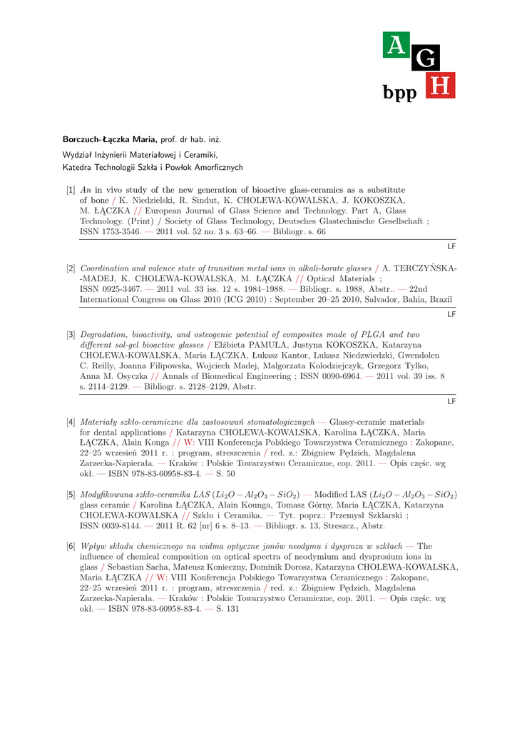 A Borczuch-Łączka Maria, prof. dr hab. inż. Wydział Inżynierii Materiałowej i Ceramiki, Katedra Technologii Szkła i Powłok Amorficznych G bpp H [1] An in vivo study of the new generation of bioactive glass-ceramics as a substitute of bone / K. Niedzielski, R. Sindut, K. CHOLEWA-KOWALSKA, J. KOKOSZKA, M. ŁĄCZKA // European Journal of Glass Science and Technology. Part A, Glass Technology. (Print) / Society of Glass Technology, Deutsches Glastechnische Gesellschaft ; ISSN 1753-3546. — 2011 vol. 52 no. 3 s. 63–66. — Bibliogr. s. 66 LF [2] Coordination and valence state of transition metal ions in alkali-borate glasses / A. TERCZYŃSKA-MADEJ, K. CHOLEWA-KOWALSKA, M. ŁĄCZKA // Optical Materials ; ISSN 0925-3467. — 2011 vol. 33 iss. 12 s. 1984–1988. — Bibliogr. s. 1988, Abstr.. — 22nd International Congress on Glass 2010 (ICG 2010) : September 20–25 2010, Salvador, Bahia, Brazil LF [3] Degradation, bioactivity, and osteogenic potential of composites made of PLGA and two different sol-gel bioactive glasses / Elżbieta PAMUŁA, Justyna KOKOSZKA, Katarzyna CHOLEWA-KOWALSKA, Maria ŁĄCZKA, Łukasz Kantor, Lukasz Niedzwiedzki, Gwendolen C. Reilly, Joanna Filipowska, Wojciech Madej, Malgorzata Kolodziejczyk, Grzegorz Tylko, Anna M. Osyczka // Annals of Biomedical Engineering ; ISSN 0090-6964. — 2011 vol. 39 iss. 8 s. 2114–2129. — Bibliogr. s. 2128–2129, Abstr. LF [4] Materiały szkło-ceramiczne dla zastosowań stomatologicznych — Glassy-ceramic materials for dental applications / Katarzyna CHOLEWA-KOWALSKA, Karolina ŁĄCZKA, Maria ŁĄCZKA, Alain Konga // W: VIII Konferencja Polskiego Towarzystwa Ceramicznego : Zakopane, 22–25 wrzesień 2011 r. : program, streszczenia / red. z.: Zbigniew Pędzich, Magdalena Zarzecka-Napierała. — Kraków : Polskie Towarzystwo Ceramiczne, cop. 2011. — Opis częśc. wg okł. — ISBN 978-83-60958-83-4. — S. 50 [5] Modyfikowana szkło-ceramika LAS (Li2 O − Al2 O3 − SiO2 ) — Modified LAS (Li2 O − Al2 O3 − SiO2 ) glass ceramic / Karolina ŁĄCZKA, Alain Kounga, Tomasz Górny, Maria ŁĄCZKA, Katarzyna CHOLEWA-KOWALSKA // Szkło i Ceramika. — Tyt. poprz.: Przemysł Szklarski ; ISSN 0039-8144. — 2011 R. 62 [nr] 6 s. 8–13. — Bibliogr. s. 13, Streszcz., Abstr. [6] Wpływ składu chemicznego na widma optyczne jonów neodymu i dysprozu w szkłach — The influence of chemical composition on optical spectra of neodymium and dysprosium ions in glass / Sebastian Sacha, Mateusz Konieczny, Dominik Dorosz, Katarzyna CHOLEWA-KOWALSKA, Maria ŁĄCZKA // W: VIII Konferencja Polskiego Towarzystwa Ceramicznego : Zakopane, 22–25 wrzesień 2011 r. : program, streszczenia / red. z.: Zbigniew Pędzich, Magdalena Zarzecka-Napierała. — Kraków : Polskie Towarzystwo Ceramiczne, cop. 2011. — Opis częśc. wg okł. — ISBN 978-83-60958-83-4. — S. 131