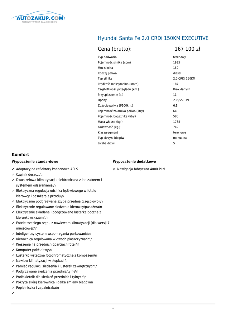 Hyundai Santa Fe 2.0 CRDi 150KM EXECUTIVE Cena (brutto): 167 100 zł Typ nadwozia terenowy Pojemność silnika (ccm) 1995 Moc silnika 150 Rodzaj paliwa diesel Typ silnika 2.0 CRDi 150KM Prędkość maksymalna (km/h) 187 Częstotliwość przeglądu (km.) Brak danych Przyspieszenie (s.) 11 Opony 235/55 R19 Zużycie paliwa (l/100km.) 6.1 Pojemność zbiornika paliwa (litry) 64 Pojemność bagażnika (litry) 585 Masa własna (kg.) 1768 Ładowność (kg.) 742 Klasa/segment terenowe Typ skrzyni biegów manualna Liczba drzwi 5 Komfort Wyposażenie standardowe Wyposażenie dodatkowe ✓ Adaptacyjne reflektory ksenonowe AFLS ✕ Nawigacja fabryczna 4000 PLN ✓ Czujnik deszczu\n ✓ Dwustrefowa klimatyzacja elektroniczna z jonizatorem i systemem odszraniania\n ✓ Elektryczna regulacja odcinka lędźwiowego w fotelu kierowcy i pasażera z przodu\n ✓ Elektrycznie podgrzewana szyba przednia (częściowo)\n ✓ Elektrycznie regulowane siedzenie kierowcy/pasażera\n ✓ Elektrycznie składane i podgrzewane lusterka boczne z kierunkowskazami\n ✓ Fotele trzeciego rzędu z nawiewem klimatyzacji (dla wersji 7 miejscowej)\n ✓ Inteligentny system wspomagania parkowania\n ✓ Kierownica regulowana w dwóch płaszczyznach\n ✓ Kieszenie na przednich oparciach foteli\n ✓ Komputer pokładowy\n ✓ Lusterko wsteczne fotochromatyczne z kompasem\n ✓ Nawiew klimatyzacji w słupkach\n ✓ Pamięć regulacji siedzenia i lusterek zewnętrznych\n ✓ Podgrzewane siedzenia przednie/tylne\n ✓ Podłokietnik dla siedzeń przednich i tylnych\n ✓ Pokryta skórą kierownica i gałka zmiany biegów\n ✓ Popielniczka i zapalniczka\n ✓ 1 Przednie i tylne szyby elektryczne z funkcją 2 bezpieczeństwa\n 3 ✓ Przyciemniane szyby tylne; od słupka B\n ✓ Radio z odtwarzaczem CD, RDS, MP3, USB, AUX, sterowanie w kierownicy, wyświetlacz LCD, Virtual Surround\n ✓ Relingi dachowe\n ✓ Szyby atermiczne\n ✓ Tylne czujniki parkowania\n ✓ Tylne siedzenie: podział siedziska 60:40; podział oparcia 40:20:40\n ✓ Wspomaganie kierownicy typu FlexSteer\n ✓ Żaluzje szyb tylnych drzwi\n ✓ Zestaw głośnomówiący Bluetooth\n Bezpieczeństwo Wyposażenie standardowe Wyposażenie dodatkowe ✓ ABS z asystentem hamowania\n ✓ Aktywny system ochrony pieszych\n ✓ Asystent kontroli zjazdu - DBC\n ✓ Automatyczne ryglowanie drzwi/ automatyczne odryglowanie przy uderzeniu\n ✓ Automatyczne światła awaryjne\n ✓ Czujnik ciśnienia w oponach - TPMS\n ✓ Elektroniczny system kontroli poślizgu kół TCS\n ✓ Elektryczny hamulec postojowy\n ✓ ESC/VSM system stabilizacji pojazdu z zarządzaniem stabilnością przyczepy\n ✓ HAC - system wspomagający ruszanie pod górę\n ✓ Mocowanie fotelików dziecięcych (ISOFIX)\n ✓ Pełne koło zapasowe\n ✓ Poduszka kolanowa kierowcy\n ✓ Poduszki kurtynowe dla wszystkich rzędów siedzeń\n ✓ Przednie boczne poduszki powietrzne\n ✓ Przednie poduszki bezpieczeństwa\n ✓ Światła ksenonowe\n ✓ System utrzymywania toru jazdy\n Dodatki Wyposażenie standardowe Wyposażenie dodatkowe ✓ Chlapacze ✕ Automatyczna skrzynia biegów (dla wersji silnika 2.2 CRDi) ✓ Chłodzony schowek pasażera ✕ Dopłata do lakieru metallic/pearl 2500 PLN ✓ Gniazdo elektryczne 220 V w bagażniku ✕ Panoramiczne okno dachowe 5000 PLN 6000 PLN ✓ Grill przedni - chrom / czarny chrom\n ✓ Ilość głośników 10\n ✓ Kamera cofania\n ✓ Klamki drzwi w kolorze chrom\n ✓ 4 Kluczyk zbliżeniowy z przyciskiem start/stop\n 5 ✓ Kolorowy wyświetlacz LCD typu TFT komputera pokładowego\n ✓ Koła ze stopów lekkich\n ✓ Lampy LED tylne\n ✓ Rozmiar opon i kół 235/55 19"\n ✓ Skórzana tapicerka\n ✓ Światła doświetlające zakręty\n ✓ Światła LED do jazdy dziennej i lampy przeciwmgielne\n ✓ Tempomat z ogranicznikiem prędkości\n ✓ Tylny spojler\n ✓ Zintegrowana nawigacja w języku polskim (wzmacniacz zewnętrzny i subwoofer)\n Doprecyzowanie oferty Kontakt: Nazwa użytkownika: admin Nazwa firmy: qqq Adres: qqq 12, 41-706 qqq1, NIP: 954 REGON: 1 Telefon: 123, 1 Fax: 1 Email: 1 www: 6