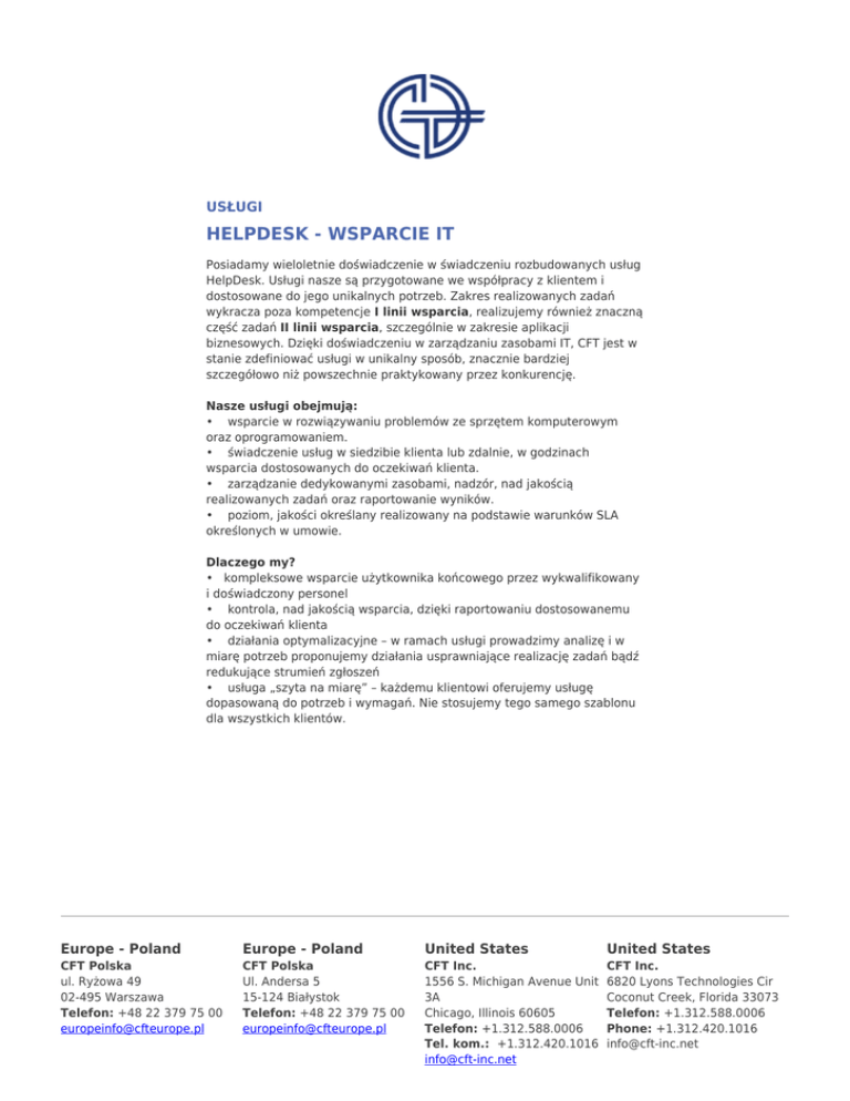 USŁUGI HELPDESK - WSPARCIE IT Posiadamy wieloletnie doświadczenie w świadczeniu rozbudowanych usług HelpDesk. Usługi nasze są przygotowane we współpracy z klientem i dostosowane do jego unikalnych potrzeb. Zakres realizowanych zadań wykracza poza kompetencje I linii wsparcia, realizujemy również znaczną część zadań II linii wsparcia, szczególnie w zakresie aplikacji biznesowych. Dzięki doświadczeniu w zarządzaniu zasobami IT, CFT jest w stanie zdefiniować usługi w unikalny sposób, znacznie bardziej szczegółowo niż powszechnie praktykowany przez konkurencję. Nasze usługi obejmują: • wsparcie w rozwiązywaniu problemów ze sprzętem komputerowym oraz oprogramowaniem. • świadczenie usług w siedzibie klienta lub zdalnie, w godzinach wsparcia dostosowanych do oczekiwań klienta. • zarządzanie dedykowanymi zasobami, nadzór, nad jakością realizowanych zadań oraz raportowanie wyników. • poziom, jakości określany realizowany na podstawie warunków SLA określonych w umowie. Dlaczego my? • kompleksowe wsparcie użytkownika końcowego przez wykwalifikowany i doświadczony personel • kontrola, nad jakością wsparcia, dzięki raportowaniu dostosowanemu do oczekiwań klienta • działania optymalizacyjne – w ramach usługi prowadzimy analizę i w miarę potrzeb proponujemy działania usprawniające realizację zadań bądź redukujące strumień zgłoszeń • usługa „szyta na miarę” – każdemu klientowi oferujemy usługę dopasowaną do potrzeb i wymagań. Nie stosujemy tego samego szablonu dla wszystkich klientów. Europe - Poland Europe - Poland United States United States CFT Polska ul. Ryżowa 49 02-495 Warszawa Telefon: +48 22 379 75 00 [email protected] CFT Polska Ul. Andersa 5 15-124 Białystok Telefon: +48 22 379 75 00 [email protected] CFT Inc. 1556 S. Michigan Avenue Unit 3A Chicago, Illinois 60605 Telefon: +1.312.588.0006 Tel. kom.: +1.312.420.1016 [email protected] CFT Inc. 6820 Lyons Technologies Cir Coconut Creek, Florida 33073 Telefon: +1.312.588.0006 Phone: +1.312.420.1016 [email protected]
