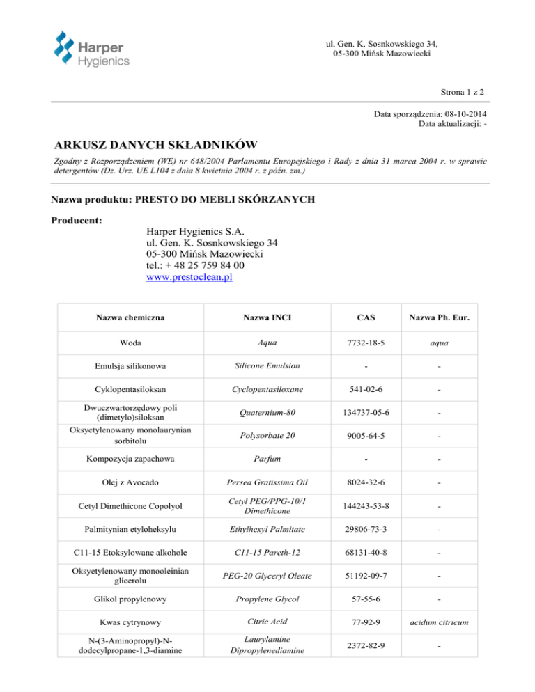 ul. Gen. K. Sosnkowskiego 34, 05-300 Mińsk Mazowiecki Strona 1 z 2 Data sporządzenia: 08-10-2014 Data aktualizacji: - ARKUSZ DANYCH SKŁADNIKÓW Zgodny z Rozporządzeniem (WE) nr 648/2004 Parlamentu Europejskiego i Rady z dnia 31 marca 2004 r. w sprawie detergentów (Dz. Urz. UE L104 z dnia 8 kwietnia 2004 r. z późn. zm.) Nazwa produktu: PRESTO DO MEBLI SKÓRZANYCH Producent: Harper Hygienics S.A. ul. Gen. K. Sosnkowskiego 34 05-300 Mińsk Mazowiecki tel.: + 48 25 759 84 00 www.prestoclean.pl Nazwa chemiczna Nazwa INCI CAS Nazwa Ph. Eur. Woda Aqua 7732-18-5 aqua Emulsja silikonowa Silicone Emulsion - - Cyklopentasiloksan Cyclopentasiloxane 541-02-6 - Dwuczwartorzędowy poli (dimetylo)siloksan Quaternium-80 134737-05-6 - Oksyetylenowany monolaurynian sorbitolu Polysorbate 20 9005-64-5 - Kompozycja zapachowa Parfum - - Olej z Avocado Persea Gratissima Oil 8024-32-6 - Cetyl Dimethicone Copolyol Cetyl PEG/PPG-10/1 Dimethicone 144243-53-8 - Palmitynian etyloheksylu Ethylhexyl Palmitate 29806-73-3 - C11-15 Etoksylowane alkohole C11-15 Pareth-12 68131-40-8 - Oksyetylenowany monooleinian glicerolu PEG-20 Glyceryl Oleate 51192-09-7 - Glikol propylenowy Propylene Glycol 57-55-6 - Kwas cytrynowy Citric Acid 77-92-9 acidum citricum N-(3-Aminopropyl)-Ndodecylpropane-1,3-diamine Laurylamine Dipropylenediamine 2372-82-9 - ul. Gen. K. Sosnkowskiego 34, 05-300 Mińsk Mazowiecki Strona 2 z 2 1,2-Benzisothiazol-3(2H)-one Benzisothiazolinone 2634-33-5 - 2-Methyl-2H-isothiazol-3-one Methylisothiazolinone 2682-20-4 - Link do strony internetowej Pharmacos Komisji Europejskiej, zawierającej tabelę korelacji między nazwami INCI, a nazwami Farmakopei Europejskiej i numerami CAS: http://ec.europa.eu/consumers/cosmetics/cosing/