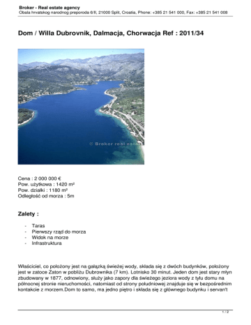Broker - Real estate agency Obala hrvatskog narodnog preporoda 6/II, 21000 Split, Croatia, Phone: +385 21 541 000, Fax: +385 21 541 008 Dom / Willa Dubrovnik, Dalmacja, Chorwacja Ref : 2011/34 Cena : 2 000 000 € Pow. użytkowa : 1420 m² Pow. działki : 1180 m² Odległość od morza : 5m Zalety : - Taras Pierwszy rząd do morza Widok na morze Infrastruktura Właściciel, co położony jest na gałązką świeżej wody, składa się z dwóch budynków, położony jest w zatoce Zaton w pobliżu Dubrownika (7 km). Lotnisko 30 minut. Jeden dom jest stary młyn zbudowany w 1877, odnowiony, służy jako zapory dla świeżego jeziora wody z tyłu domu na północnej stronie nieruchomości, natomiast od strony południowej znajduje się w bezpośrednim kontakcie z morzem.Dom to samo, ma jedno piętro i składa się z głównego budynku i servan't 1/2 Broker - Real estate agency Obala hrvatskog narodnog preporoda 6/II, 21000 Split, Croatia, Phone: +385 21 541 000, Fax: +385 21 541 008 domu (ok. 720 m kw. lub 7,750 ²), z dużą werandę z przodu, wszystko razem daje Wich powierzchnię ziemi na 779m2 lub 8,385 sq ft. Drugi dom, podłoga z aprox. 700 m² i 7.500 m², z powierzchnią ziemi lub 4,300 mkw. Stóp lub 400 m kw., znajduje się na pierwszej linii morza, zamyka małą zatoczkę co czyni go idealnym do cumowania jachtu. W północno-wschodnim narożniku jest inna gałązka dodatkowym jakości wody, osuszono należy do domu.Wydawanie pozwolenia na lokalizację dla obu domów jest w toku. 2/2