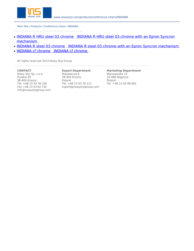 www.nowystyl.com/products/conference-chairs/INDIANA Main Site / Products / Conference chairs / INDIANA ● ● ● INDIANA R HRU steel 03 chrome INDIANA R HRU steel 03 chrome with an Epron Syncron mechanism INDIANA R steel 03 chrome INDIANA R steel 03 chrome with an Epron Syncron mechanism INDIANA cf chrome INDIANA cf chrome All rights reserved 2013 Nowy Styl Group CONTACT Nowy Styl Sp. z o.o. Pużaka 49 38-400 Krosno Tel. +48 13 43 76 100 Fax +48 13 43 62 732 [email protected] Export Department Mięsowicza 6 38-400 Krosno Poland Tel. +48 13 43 76 111 [email protected] Marketing Department Warszawska 15 32-086 Węgrzce Poland Tel. +48 12 63 98 602