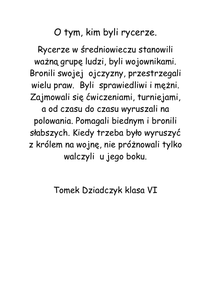 O tym, kim byli rycerze. Rycerze w średniowieczu stanowili ważną grupę ludzi, byli wojownikami. Bronili swojej ojczyzny, przestrzegali wielu praw. Byli sprawiedliwi i mężni. Zajmowali się ćwiczeniami, turniejami, a od czasu do czasu wyruszali na polowania. Pomagali biednym i bronili słabszych. Kiedy trzeba było wyruszyć z królem na wojnę, nie próżnowali tylko walczyli u jego boku. Tomek Dziadczyk klasa VI