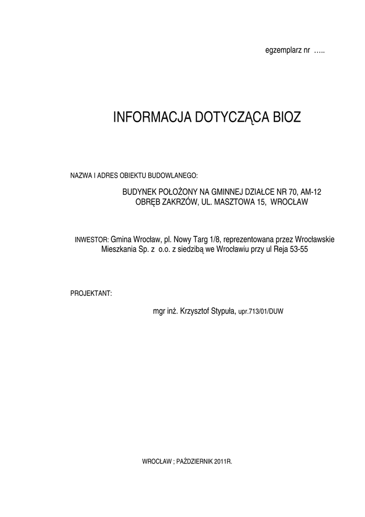 egzemplarz nr ….. INFORMACJA DOTYCZĄCA BIOZ NAZWA I ADRES OBIEKTU BUDOWLANEGO: BUDYNEK POŁOŻONY NA GMINNEJ DZIAŁCE NR 70, AM-12 OBRĘB ZAKRZÓW, UL. MASZTOWA 15, WROCŁAW INWESTOR: Gmina Wrocław, pl. Nowy Targ 1/8, reprezentowana przez Wrocławskie Mieszkania Sp. z o.o. z siedzibą we Wrocławiu przy ul Reja 53-55 PROJEKTANT: mgr inż. Krzysztof Stypuła, upr.713/01/DUW WROCŁAW ; PAŹDZIERNIK 2011R. CZĘŚĆ OPISOWA 1.ZAKRES ROBÓT DLA CAŁEGO ZMIERZENIA BUDOWLANEGO ORAZ KOLEJNOŚĆ REALIZACJI POSZCZEGÓLNYCH ETAPÓW. Zakres prowadzenia robót rozbiórkowych oraz ich kolejność podano w pkt. 5. Projektu rozbiórki. 2.WYKAZ ISTNIEJĄCYCH OBIEKTÓW BUDOWLANYCH PRZEZNACZONYCH DO ROZBIÓRKI. Do rozbiórki przeznaczono budynek przy ul. Masztowej 15, 3k - oznaczony na mapie zasadniczej do celów opiniodawczych kolorem pomarańczowym ( Projekt rozbiórki str. 3Mapa zasadnicza) 3.ELEMENTY ZAGOSPODAROWANIA DZIAŁKI, KTÓRE MOGĄ STWAŻAĆ ZAGROŻENIE BEZPIECZEŃSTWA I ZDROWIA LUDZI. Na działce brak jest elementów zagospodarowania. 4.WSKAZANIE DOTYCZĄCE PRZEWIDYWANYCH ZAGROŻEŃ WYSTĘPUJĄCYCH PODCZAS REALIZACJI ROBÓT ROZBIÓRKOWYCH, OKREŚLAJĄCE SKALĘ I RODZAJE ZAGROŻEŃ ORAZ MIEJSCE I CZAS ICH WYSTĄPIENIA 4.1. Sąsiedztwo stacji bazowej ( Projekt rozbiórki, pkt 11 ust. 7- Uwagi końcowe) 4.2. Sąsiedztwo budynków przy ul. Masztowej 13 i 17 ( Projekt rozbiórki; pkt 8 - uwaga oraz pkt 11 ust. 8- Uwagi końcowe) 5.WSKAZANIE SPOSOBU PROWADZENIA INSTRUKTAŻU PRACOWNIKÓW PRZED PRZYSTAPIENIEM DO REALIZACJI ROBÓT SZCZEGÓLNIE NIEBEZPIECZNYCH Należy przeprowadzić instruktaż stanowiskowy 6.DODATKOWE WSKAZANIA W TYM ZAPEWNIAJĄCE BEZPIECZNĄ I SPRAWNĄ KOMUNIKACJĘ, UMOŻLIWIAJĄCĄ SZYBKĄ EWAKUACJĘ NA WYPADEK POŻARU, AWARII I INNYCH ZAGROŻEŃ. Roboty należy prowadzić z rusztowań Prace rozbiórkowe należy wstrzymać przy V wiatru powyżej 10m/s. Jeżeli zachodzi możliwość przewrócenia części konstrukcji obiektu przez wiatr jest zabronione. W czasie prowadzenia robót rozbiórkowych przebywanie ludzi na niższych kondygnacjach jest zabronione przewracanie ścian lub innych części obiektu przez podkopywanie i podcinanie jest zabronione W czasie wykonywania robót rozbiórkowych sposobami zmechanizowanymi wszystkie osoby i maszyny powinny znajdować się poza strefą niebezpieczną W czasie wykonywania robót rozbiórkowych sposobem przewracania długość umocowanych lin powinna być trzykrotnie większa od wysokości obiektu, a ich umocowanie powinno być niezawodne. Dojazd umożliwiającą szybką ewakuację na wypadek pożaru, awarii i innych zagrożeń zapewniony jest od strony ul. Masztowej i prostopadle do ul. Zatorskiej ( droga pomiędzy dz. nr 68/11 a 277/6- Mapa zasadnicza) Projektant: