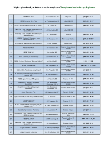 Wykaz placówek, w których można wykonad bezpłatne badania cytologiczne. 2 1 NZOZ FEM-MED. ul. Konarzewska 12 Dopiewo (061)814 83 21 2 NZOZ Poradnia Gin.-Poło. ul. Poniatowskiego 20 Luboń 62-030 (061) 813 09 17 3 NZOZ Centrum Medyczne HCP Sp. Z O.O. ul. Lipowa 60 Luboń 62-030 (061) 831 14 35 4 Pięć+ Sp. z o.o. Ośrodek RehabilitacyjnoSpecjalistyczny ul. Wschodnia 25 Luboń 62-030 5 Pięć+ Sp. z o.o. Ośrodek RehabilitacyjnoSpecjalistyczny ul. Dworcowa 3 Mosina (061) 819 24 07 6 NS ZOZ "Medicus" Utworzony przez "Medicus-Bonus" ul. Dworcowa 10 Murowana Goślina (061) 81 13 057 7 Przychodnia Specjalistyczna NOWAMED ul. Wł. Jagiełły Pobiedziska (061)815 46 80 8 NZOZ BIG MED. ul. Starołęcka 52 Poznań-Nowe Miasto 61-361 (061) 879 30 74 9 NZOZ "GINPOL" Os. Lecha 120 Poznań-Nowe Miasto 61- 298 (061) 872 24 58 10 Spec. Gabinet gin. Położniczy Os. Piastowskie 75 Poznań-Nowe Miasto 61-159 (061) 879 02 09 11 NZOZ Centrum Medyczne "Zdrowa Kobieta" ul. Kórnicka 24 Poznań-Stare Miasto 61-141 0 602 111 302 12 NZPiSOZ Hipokrates Os. Marysieńki 25 Poznań-Stare Miasto 60-683 (061) 823 47 11, 1106 13 Gabinet Gin. Położniczy Jerzy Krężel Os. Przyjaźni 133 Poznań-Stare Miasto 61-686 (061)820 75 41 14 N ZOZ Zespół Poradni Specjalistycznych Artmed S.C. os. Na Murawie 5 c Poznań-Stare Miasto (061) 825 01 34 15 NZOZ spec. Centrum Medyczne ul. Opolska 58 Poznań 61-433 (061) 662 32 67 16 Piątkowskie Centrum Usług Med. "DAGMED" Os. Bolesława Chrobrego 108 A Poznań-Stare Miasto 60-681 (061) 828 37 30 17 Zespół Poradni Specjalistycznych "Termedica" Os. Bolesława Chrobrego 101 Poznań-Stare Miasto (061)822 56 03 18 Spec. Gab. Gin.- Poł. ul. Warszawska 107 Poznań- 61-047 (061) 879 02 50 19 Spec. Gabinet Lekarski Krzysztof Podsiadło ul. Bukowa 1 Poznań-Wilda 61-444 (061) 832 90 03 20 NZOZ "MEDICIR" ul. Podgajska 5A Poznań 60-416 (061) 841 79 25 21 NZOZ Zespół Poradni Specjalistycznych Artmed S. C. ul. Galla Anonima 2 D Poznań Jeżyce (061) 843 53 23 22 Szpital Wojewódzki w Poznaniu ul. Juraszów 7 Poznań-Jeżyce (061)821 24 14 23 Zespół spec. Gab. Lekarskich "Mirmar" S.C. NZOZ Konsyliarz ul. Słowackiego 8 Poznań Jeżyce 60823 (061) 662 74 25 24 NZOZ "ELLMED" ul. Słowackiego 8 Poznań-Jeżyce 60823 (061) 866 84 10, 11 25 Pięć+ Sp. z o.o. Ośrodek RehabilitacyjnoSpecjalistyczny ul. Słowackiego8 Poznań-Jeżyce (061)665 66 36 26 "Gaja" Poradnie Lekarskie ul. Rzeczypospolitej 6 Poznań -Nowe Miasto 61-397 (061) 877 29 53 27 „Gaja” Poradnie Lekarskie Os. Orła Białego 103 Poznań-Nowe Miasto 61-251 (061) 875 62 35 28 NZOZ Specjalistyczne Centrum Zdrowia Kobiety ul. Cienista 10 Poznań-Jeżyce 60587 (061) 842 08 08 29 NZOZ Przychodnia Specjalistyczna „Gutmed” ul. Czwartaków 17 Poznań-Wilda 61-495 (061) 832 56 76 30 Zakład Usług Medycznych Promed Sp. z O.O. ul. Kasprzaka 16 Poznań 60-237 (061) 866 44 24 31 NZOZ „Centrum Diagnostyki Ginekologia Położnictwo, USG” ul. Plac Spiski 1 Poznań-Jeżyce 60614 (061) 847 87 27 32 111 Szpital Wojskowy z Przychodnią SP ZOZ ul. Szylinga 2 Poznań-Grunwald 60780 (061) 857 42 98 33 Ośrodek Profilaktyki i Epidemiologii Nowotworów ul. Marii Magdaleny 8a/b Poznań 61-707 (061) 855 75 29 34 GPSK UM w Poznaniu ul. Polna 33 Poznań 60-535 (061) 841 9310, 9694 35 Poradnia Ginekologiczna "Angra" ul. Krasińskiego 16 Poznań 60-830 (061) 845 49 33 36 Spółdzielnia Pracy Lekarsko-Specjalistyczna ul. Mickiewicza 36 Poznań-Jeżyce (061) 848 08 41 37 Prywatna Lecznica Certus Sp.Z O.O ul. Dąbrowskiego 262 Poznań-Jeżyce (061) 845 65 00 38 ZOZ Poznań-Jeżyce ul. Mickiewicza 2 Poznań-Jeżyce 60834 (061) 848 10 11 wew 398 39 "Gaja" Poradnie Lekarskie Os. Zwycięstwa 110 Poznań (061) 828 88 34 40 Indywidualna Specjalistyczna Praktyka Lekarska Os. B. Chrobrego 118 Poznań-Stare Miasto 60-681 (061) 822 67 57 41 NZOZ Centrum Medyczne HCP Lecznictwo Stacjonarne ul. 28 Czerwca 1956r. 194 Poznań-Wilda 60-965 (061) 831 25 88 42 ZOZ MSWiA ul. Dojazd 34 Poznań-Jeżyce 60631 (061) 846 47 45 43 Przychodnia Rehabilitacyjna przy USI Spółdzielni Wielobranżowej ul. Szewska 5 Poznań-Stare Miasto 61-760 (061) 853 23 43 44 "Gaja" Poradnie Lekarskie ul. Ognik 18 Poznań-Grunwald (061) 867 40 43 45 NZOZ Euromedicuc ul. Wojskowa 1b Poznań -Grunwald 0 506 298 115 46 NZOZ Lecznictwo GinekologicznoPołożnicze ul. Ziębicka 16 Poznań-Grunwald (061)868 51 20 47 "MEDICOR" Spec. Poradnie Lekarsko Stomatologiczne ul. Kraszewskiego 11 Puszczykowo 62-041 (061) 898 42 22 48 NZO Medycznej Gin. Poł. "Rok. Med." ul. Pocztowa 3 Rokietnica 62-090 (061) 814 51 99 49 MBZ -Medicus Indywidualna Spec. Praktyka Lekarska ul. Promienista 89 Raszyn-Poznań (061)861 76 92 50 Przychodnia Specjalistyczna "Jakubowska Medica" ul. Mickiewicza 1 Stęszew 62-060 (061)813 50 19 51 Medicor Spec. Poradnie LekarskoStomatologiczne ul. Piotra Skargi 22 Stęszew 62-060 (061) 813 42 61 52 Specjalistyczny Gabinet Gin.-Poł. ul. Młodzieżowa 2 Suchy Las 62-002 (061) 652 14 88 53 NSZOZ "Medisana" ul. Poznańska 15 Swarzędz 62-020 (061) 818 17 85 54 NZOZ "Euromed"- Poradnie Wielospecjalistyczne ul. Kowalska 12 Swarzędz 62-020 (061) 815 99 15 55 Przychodnia Spec. NZOZ Medicor ul. Sportowa 1 Tarnowo Podgórne 62-080 (061) 896 32 81