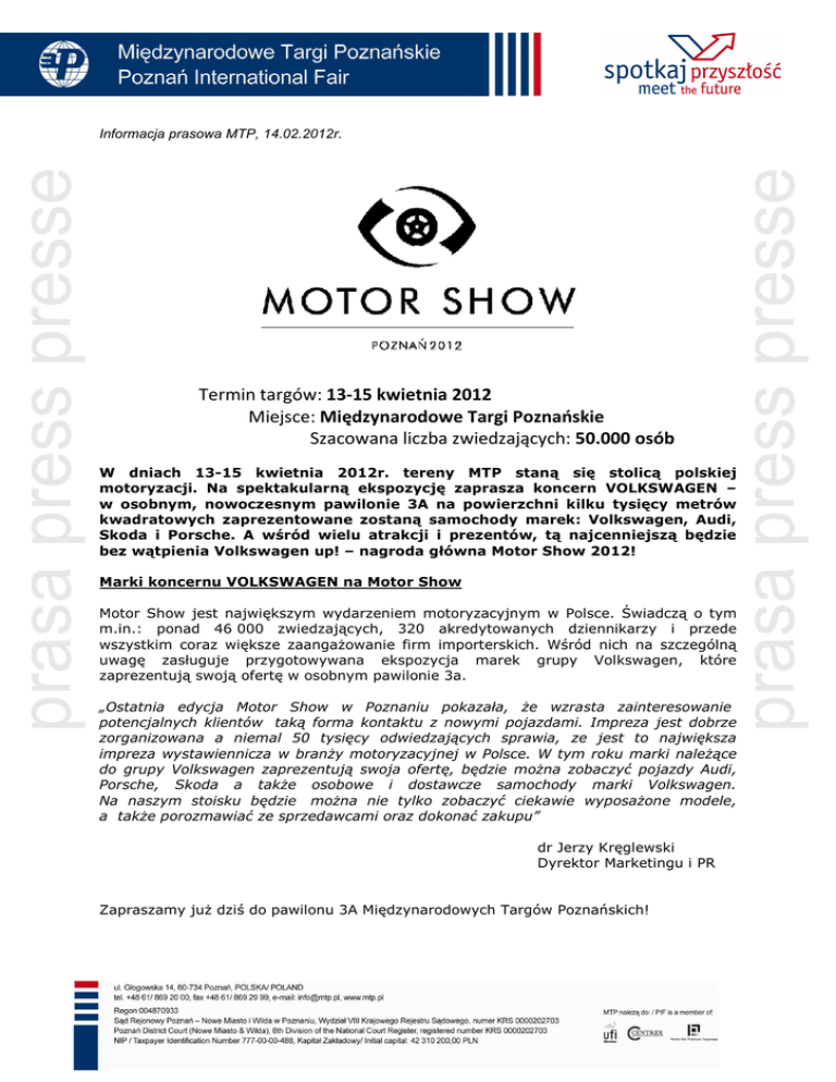 Informacja prasowa MTP, 14.02.2012r. Termin targów: 13-15 kwietnia 2012 Miejsce: Międzynarodowe Targi Poznańskie Szacowana liczba zwiedzających: 50.000 osób W dniach 13-15 kwietnia 2012r. tereny MTP staną się stolicą polskiej motoryzacji. Na spektakularną ekspozycję zaprasza koncern VOLKSWAGEN – w osobnym, nowoczesnym pawilonie 3A na powierzchni kilku tysięcy metrów kwadratowych zaprezentowane zostaną samochody marek: Volkswagen, Audi, Skoda i Porsche. A wśród wielu atrakcji i prezentów, tą najcenniejszą będzie bez wątpienia Volkswagen up! – nagroda główna Motor Show 2012! Marki koncernu VOLKSWAGEN na Motor Show Motor Show jest największym wydarzeniem motoryzacyjnym w Polsce. Świadczą o tym m.in.: ponad 46 000 zwiedzających, 320 akredytowanych dziennikarzy i przede wszystkim coraz większe zaangaŜowanie firm importerskich. Wśród nich na szczególną uwagę zasługuje przygotowywana ekspozycja marek grupy Volkswagen, które zaprezentują swoją ofertę w osobnym pawilonie 3a. „Ostatnia edycja Motor Show w Poznaniu pokazała, Ŝe wzrasta zainteresowanie potencjalnych klientów taką forma kontaktu z nowymi pojazdami. Impreza jest dobrze zorganizowana a niemal 50 tysięcy odwiedzających sprawia, ze jest to największa impreza wystawiennicza w branŜy motoryzacyjnej w Polsce. W tym roku marki naleŜące do grupy Volkswagen zaprezentują swoja ofertę, będzie moŜna zobaczyć pojazdy Audi, Porsche, Skoda a takŜe osobowe i dostawcze samochody marki Volkswagen. Na naszym stoisku będzie moŜna nie tylko zobaczyć ciekawie wyposaŜone modele, a takŜe porozmawiać ze sprzedawcami oraz dokonać zakupu” dr Jerzy Kręglewski Dyrektor Marketingu i PR Zapraszamy juŜ dziś do pawilonu 3A Międzynarodowych Targów Poznańskich! Przyjdź i wygraj nowy samochód – Volkswagen Up! JuŜ po raz trzeci goście targów Motor Show będą mogli wziąć udział w konkursie, w którym nagrodą główną będzie samochód osobowy. Tym razem szczęśliwy zwycięzca stanie się posiadaczem nowego Volkswagena up! Promowany hasłem „up! - małe jest wielkie!” samochód, idealnie oddaje jego charakter. Model jest połączeniem funkcjonalności, nowoczesnego design`u oraz ekonomicznej jazdy. Szanuj swój czas – Kup bilet ONLINE! Nabycie biletu elektronicznego to najskuteczniejszy sposób błyskawicznego wejścia na Motor Show przy uniknięciu oczekiwania w kolejkach do kas. By kupić wejściówki ma targi wystarczy jedynie wejść na stronę internetową www.MotorShow.pl, gdzie znajdują się informacje jak „krok po kroku” kupić bilety. Ceny biletów pozostają na ubiegłorocznym poziomie: 15 zł od osoby za bilet normalny lub 10 zł od osoby za bilet rodzinny (przy zakupie trzech biletów). MOTOR SHOW 2012 – 13-15 kwietnia 2012 - Największe Motoryzacyjne Show w Polsce… NajwaŜniejsze informacje: Targi odbywają się w dniach 13-15 kwietnia 2012r. Godziny otwarcia: Piątek – Motor Show VIP Day: 13.00-20.00; Sobota: 10.00-18.00 ; Niedziela: 10.00-17.00 Wejście bezpłatne - Dzieci do lat 3 Bilet 15 zł / osoba - Bilet obowiązuje w sobotę lub w niedzielę. UpowaŜnia do jednorazowego wejścia na Motor Show. BILET RODZINNY 10 zł / osoba – dla rodziny od min. 3 osób (sprzedaŜ wyłącznie w kasach MTP, w czasie Motor Show) Bilet 100 zł / osoba - Bilet specjalny, upowaŜnia do wejścia na Motor Show VIP DAY Miejsce: Międzynarodowe Targi Poznańskie Pawilony 3, 3a, 4, 5, 6, 6A MTP. Wejścia: wschodnie (ul. Głogowska), północne (ul. Bukowska) Kontakt dla mediów: Dariusz Wawrzyniak PR & Marketing Motor Show Międzynarodowe Targi Poznańskie tel. 061 869 22 98, e-mail: [email protected]