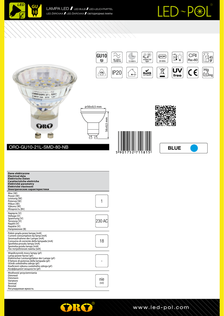 lampa led LED žárovka LED Bulb LED ŽIAROVKA LED-Leuchtmittel Светодиодные лампы GU10 AC 230 V ~50/60 Hz 15 000 h instant full light 20 000x +40 CRI -15 Ra>80 Hg IP20 0,0mg 56±0,5 mm 50±0,5 mm ORO-GU10-21L-SMD-80-NB BLUE Dane elektryczne Electrical data Elektrische Daten Caratteristiche elettriche Elektrické parametry Elektrické vlastnosti Электрические характеристики Moc [W] Power [W] Leistung [W] Potenza [W] Příkon [W] Výkonu [W] Мощность [Вт] 1 Napięcie [V] Voltage [V] Spannung [V] Tensione [V] Napětí [V] Napätie [V] Напряжение [В] 230 AC Pobór prądu przez lampę [mA] Current consumption by lamp [mA] Stromaufnahme der Lampe [mA] Consumo di corrente della lampada [mA] Spotřeba proudu lampy [mA] Spotreba prúdu lampy [mA] Ток потребления лампы [мА] Współczynnik mocy lampy (pf ) Lamp power factor (pf ) Elektrischer Leistungsfaktor der Lampe (pf ) Il fattore di potenza della lampada (pf ) Účiník světelného zdroje (pf ) Koeficient výkonu svetelného zdroja (pf ) Коэффициент мощности (pf ) Możliwość przyciemniania Dimmed Dimmern Variatore Stmívač Reostat Регулируемая яркость 45 gr 18 - nie (not) w w w. l e d - p o l . c o m lampa led LED žárovka LED Bulb LED ŽIAROVKA LED-Leuchtmittel Светодиодные лампы Właściwości światła Properties of light Eigenschaften von Licht Proprietà della luce Vlastnosti světla Vlastnosti svetla Параметры светового излучения Wymiary i waga Lamp dimensions and weight Abmessungen und Gewicht Dimensioni e peso Rozměry a váha Rozmery a hmotnosť Размеры и вес Nominalny użyteczny strumień świetlny [lm] Nominal useful luminous flux [lm] Nomineller Nutzlichtstrom [lm] Il flusso luminoso nominale utile [lm] Typový užitečný světelný tok [lm] Nominálny užitočný svetelný tok [lm] Номинальная полезная потока [лм] - Długość całkowita [mm] Total length [mm] Gesamtlänge [mm] Lunghezza totale [mm] Celková délka [mm] Celková dĺžka [mm] Высота [мм] 56 - Maksymalna średnica [mm] Largest diameter [mm] Größter durchmesser [mm] Diametro massimo [mm] Největší průměr [mm] Najväčší priemer [mm] Ширина [мм] 50 - Waga [g] Weight [g] Gewicht [g] Peso [g] Váha [g] Hmotnosti [g] Вес [г] 45 - Wartości znamionowe Rated values Bemessungswert Valore dichiarato Jmenovitou hodnotou Menovitá hodnot Номинальные значения <1 Moc znamionowa [W] Rated power [W] Nennleistung [W] La potenza nominale [W] Jmenovitý výkon [W] Menovitý príkon [W] Номинальная мощность [Вт] 1 Znamionowy użyteczny strumień świetlny [lm] Rated useful luminous flux [lm] Bemessungsnutzlichtstrom [lm] Il flusso luminoso utile nominale [lm] Jmenovitý užitečný světelný tok [lm] Menovitý užitočný svetelný tok [lm] Номинальная полезная потока [лм] - Nominalny strumień świetlny [lm] Nominal luminous flux [lm] Nomineller Lichtstrom [lm] Il flusso luminoso nominale [lm] Typový světelný tok [lm] Nominálny svetelný tok [lm] Световая отдача [лм] Nominalny kąt promieniowania [o] Nominal beam angle [o] Nomineller Halbwertswinkel [o] L’angolo del fascio di luce nominale [o] Typový úhel poloviční svítivosti [o] Nominálny uhol svetelného zväzku [o] Номинальный угол освещения [o] Temperatura barwowa [K] Colour temperature [K] Farbtemperatur [K] La temperatura di colore [K] Teplota chromatičnosti [K] Teplota farby [K] Цветовая температура [K] Czas nagrzewania się lampy do 60% pełnego strumienia świetlnego [s] Warm-up time up to 60 % of the full light output [s] Anlaufzeit bis zur Erreichung von 60 % des vollen Lichtstroms [s] Il tempo di avvio fino al 60 % della piena emissione luminosa [s] Zahřívací doba do 60 % plného světelného výkonu [s] Čas na zahriatie do 60 % z celkového svetelného výkonu [s] Продолжительность прогревания 60 % светового излучения [c] Czas startu [s] Starting time [s] Startzeit [s] Il tempo di innesco [s] Startovací doba [s] Čas na zapnutie [s] Время начала [c] Współczynnik zachowania strumienia świetlnego na zakończenie nominalnego okresu trwałości Lumen maintenance factor (LLMF) Lampenlichtstromerhalt (LLMF) Il fattore di mantenimento del flusso luminoso (LLMF) Činitel stárnutí světelného zdroje (LLMF) Koeficient zachovania svetelného toku (LLMF) Коэффициент стабильности светового потока (LLMF) <0,5 0,7 Wskaźnik oddawania barw CRI [Ra] Colour rendering [Ra] Farbwiedergabe [Ra] La resa del colore [Ra] Podání barev [Ra] Podanie farieb [Ra] Цветопередача [Ra] - Jednolitość barwy [SDCM] Colour consistency [SDCM] Farbkonsistenz [SDCM] La coerenza dei colori [SDCM] Zachování barev [SDCM] Farebná konzistencia [SDCM] Цветность [SDCM]) - Liczba cykli włącz / wyłącz Number of switching cycles Zahl der Schaltzyklen Il numero di cicli di accensione Počet spínacích cyklů do poruchy Počet spínacích cyklov Количество циклов включения 15000 Znamionowa światłość szczytowa [cd] Rated peak intensity [cd] Bemessungsspitzenlichtstärke [cd] L’intensità di picco dichiarata [cd] Jmenovitý vrchol svítivosti [cd] Menovitá maximálna svietivosť [cd] Сила света [кд] - Znamionowy kąt promieniowania [o] Rated beam angle [o] Bemessungshalbwertswinkel [o] L’angolo del fascio dichiarato [o] Jmenovitý úhel poloviční svítivosti [o] Menovitý uhol svetelného zväzku [o] Номинальный угол луча [o] 120 Zawartość rtęci w lampie [mg] Lamp mercury content [mg] Quecksilbergehalt der Lampe [mg] Contenuto di mercurio della lampada [mg] Obsahem rtuti ve světelném zdroji [m
