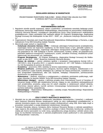 REGULAMIN UDZIAŁU W WARSZTACIE PROJEKTOWANIE PRZESTRZENI PUBLICZNEJ - NOWA ATRAKCYJNA USŁUGA DLA FIRM W OFERCIE INSTYTUCJI OTOCZENIA BIZNESU §1 POSTANOWIENIA OGÓLNE 1. Regulamin określa sposób organizacji, naboru uczestników i prowadzenia warsztatu będącego przedsięwzięciem Samorządu Województwa Wielkopolskiego, skierowanego do pracowników wielkopolskich Instytucji Otoczenia Biznesu, rozwijających specjalistyczne formy usług świadczonych wielkopolskim przedsiębiorcom. Celem warsztatów jest realizacja założeń III Programu Strategicznego „Regionalnej Strategii Innowacji dla Wielkopolski na lata 2015 – 2020”, pn. „Skuteczne Instytucje Otoczenia Biznesu”. 2. Organizatorem Warsztatu jest Urząd Marszałkowski Województwa Wielkopolskiego w Poznaniu, a jego realizatorem firma DEA Konsulting Izabela Tokarska. 3. Słowniczek pojęć użytych w regulaminie: Instytucje otoczenia biznesu (IOB) – instytucje ułatwiające funkcjonowanie przedsiębiorstw, wspierające biznes lub kojarzenie współpracy na linii biznes-nauka w tym: jednostki systemu finansowo-ubezpieczeniowego, organizacje ułatwiające nawiązywanie kontaktów i wspierające rozwój gospodarczy itd. IOB występuje w formie: stowarzyszeń, fundacji, spółek, izb gospodarczych, jednostek badawczo-rozwojowych, budżetowych, uczelni, ośrodków innowacji, inkubatorów przedsiębiorczości lub porozumień ww. podmiotów; Program Strategiczny - III Program Strategiczny „Regionalnej Strategii Innowacji dla Wielkopolski na lata 2015 – 2020”: Skuteczne Instytucje Otoczenia Biznesu; Pomoc de minimis – pomoc udzielana zgodnie z przepisami rozporządzenia Komisji (UE) nr 1407/2013 z dnia 18 grudnia 2013 r. w sprawie stosowania art. 107 i 108 Traktatu o funkcjonowaniu Unii Europejskiej do pomocy de minimis; Uczestnicy – pracownicy IOB z siedzibą na terenie województwa wielkopolskiego; Wnętrze publiczne - pomieszczenie (usługowe, biurowe) ogólnie dostępne, zlokalizowane w lokalu użytkowym (część budynku składająca się z jednego lub więcej pomieszczeń, wydzielona stałymi przegrodami budowlanymi, albo cały budynek, niebędący mieszkaniem, pomieszczeniem technicznym czy gospodarczym); Wykonawca – podmiot, wyłoniony w postępowaniu o udzielenie zamówienia publicznego, realizujący Warsztat na zlecenie UMWW: firma DEA Konsulting Izabela Tokarska; Wzornictwo (design) - zgodnie z definicją przyjętą przez International Council of Societies of Industrial Design (ICSID) jest działalnością twórczą, mającą na celu określenie wieloaspektowych cech przedmiotów, procesów, usług oraz ich całych zespołów w całościowych cyklach istnienia. Wzornictwo stanowi główny czynnik zarówno innowacyjnego humanizowania technologii, jak i wymiany kulturalnej i gospodarczej; Zamawiający - Województwo Wielkopolskie z siedzibą Urzędu Marszałkowskiego Województwa Wielkopolskiego w Poznaniu. §2 CELE I EFEKTY REALIZACJI WARSZTATU 1. Warsztat ma na celu podniesienie świadomości specjalistów (konsultantów i trenerów) z wielkopolskich Instytucji Otoczenia Biznesu świadczących usługi na rzecz wielkopolskich przedsiębiorców, w zakresie kreowania popytu oraz zapewnienia podaży profesjonalnych usług IOB, które będą mogli w przyszłości wykorzystać w swojej działalności szkoleniowej i doradczej. 2. Tematyka Warsztatu dotyczy rozwijania oferty Instytucji Otoczenia Biznesu w zakresie specjalistycznego wsparcia dla przedsiębiorstw. Uczestnicy uzyskają w trakcie Warsztatu teoretyczną i praktyczną wiedzę jak można wprowadzić na rynek nową, specjalistyczną usługę doradczą i odnieść sukces znajdując na nią klientów biznesowych, w zakresie projektowania wnętrz publicznych w celu podniesienia ich funkcjonalności i wizerunku. ul. Lipowa 1, 62-069 Dąbrówka [email protected] Tel. 884 818 088 www.deakonsulting.pl §3 UCZESTNICY WARSZTATU I WYŁĄCZENIA 1. Warsztat skierowany jest do pracowników Instytucji Otoczenia Biznesu z siedzibą na terenie województwa wielkopolskiego, które świadczą usługi na rzecz wielkopolskich przedsiębiorców, w szczególności do konsultantów i trenerów, prowadzących doradztwo biznesowe na rzecz wielkopolskich przedsiębiorstw 2. Do udziału w warsztacie preferowane będzie w pierwszej kolejności zgłoszenie przez jedną IOB po jednym przedstawicielu. Pozostali przedstawiciele IOB zgłoszeni już do udziału w warsztacie wpisani zostaną na listę rezerwową i zostaną przyjęci w miarę posiadania wolnych miejsc. 3. W Warsztacie nie mogą brać udziału IOB, którym nie przysługuje pomoc de minimis, o której mowa w par. 8 niniejszego regulaminu lub podlegają innym wykluczeniom. (Wzór oświadczenia o niepodleganiu wykluczeniu – stanowi załącznik nr 3 do Regulaminu). 1. 2. 3. 4. 5. 6. 7. 1. 2. 3. 4. 1. 2. §4 ZASADY REALIZACJI WARSZTATU Uczestnictwo w Warsztacie jest bezpłatne i stanowi pomoc de minimis. Organizator i Wykonawca nie pokrywają kosztów dojazdu i zakwaterowania Uczestników. Dla IOB udział w warsztatach stanowi pomoc publiczną w rozumieniu ustawy z dnia 30 kwietnia 2004 r. o postępowaniu w sprawach dotyczących pomocy publicznej (Dz.U. z 2007 r., Nr 59, poz. 404 z późn. zm.). Pomoc de minimis jest udzielana zgodnie z przepisami rozporządzenia Komisji (UE) nr 1407/2013 z dnia 18 grudnia 2013 r. w sprawie stosowania art. 107 i 108 Traktatu o funkcjonowaniu Unii Europejskiej do pomocy de minimis. Warsztat zrealizowany zostanie w terminie: 14-15 grudnia 2016r. W warsztacie udział weźmie: min. 15, a maks. 25 Uczestników, będących przedstawicielami min. 10 wielkopolskich Instytucji Otoczenia Biznesu, świadczących usługi na rzecz wielkopolskich przedsiębiorców. Warsztat odbywać się będzie na terenie Poznania w lokalizacji: Noble Tower, ul. Dąbrowskiego 77A. Warsztat finansowany jest ze środków własnych Samorządu Województwa Wielkopolskiego. §5 NABÓR INSTYTUCJI OTOCZENIA BIZNESU I ICH PRACOWN