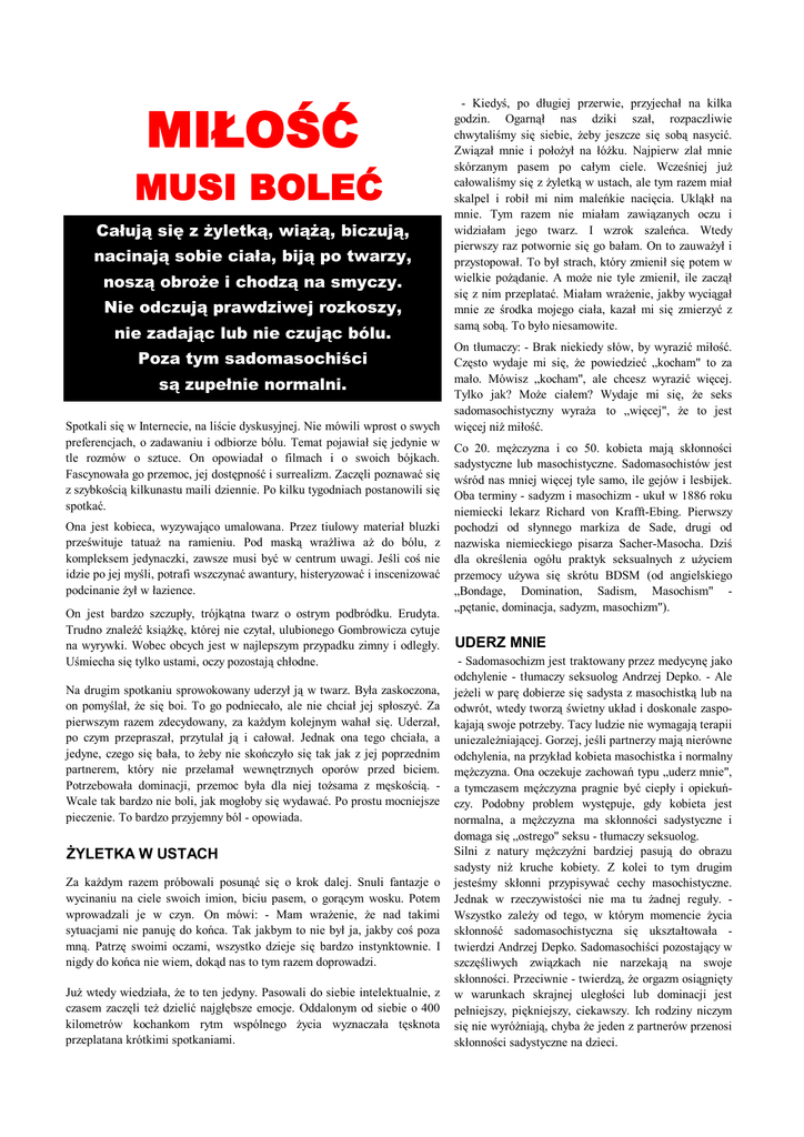 MIŁOŚĆ MUSI BOLEĆ Całują się z żyletką, wiążą, biczują, nacinają sobie ciała, biją po twarzy, noszą obroże i chodzą na smyczy. Nie odczują prawdziwej rozkoszy, nie zadając lub nie czując bólu. Poza tym sadomasochiści są zupełnie normalni. Spotkali się w Internecie, na liście dyskusyjnej. Nie mówili wprost o swych preferencjach, o zadawaniu i odbiorze bólu. Temat pojawiał się jedynie w tle rozmów o sztuce. On opowiadał o filmach i o swoich bójkach. Fascynowała go przemoc, jej dostępność i surrealizm. Zaczęli poznawać się z szybkością kilkunastu maili dziennie. Po kilku tygodniach postanowili się spotkać. Ona jest kobieca, wyzywająco umalowana. Przez tiulowy materiał bluzki prześwituje tatuaż na ramieniu. Pod maską wrażliwa aż do bólu, z kompleksem jedynaczki, zawsze musi być w centrum uwagi. Jeśli coś nie idzie po jej myśli, potrafi wszczynać awantury, histeryzować i inscenizować podcinanie żył w łazience. On jest bardzo szczupły, trójkątna twarz o ostrym podbródku. Erudyta. Trudno znaleźć książkę, której nie czytał, ulubionego Gombrowicza cytuje na wyrywki. Wobec obcych jest w najlepszym przypadku zimny i odległy. Uśmiecha się tylko ustami, oczy pozostają chłodne. Na drugim spotkaniu sprowokowany uderzył ją w twarz. Była zaskoczona, on pomyślał, że się boi. To go podniecało, ale nie chciał jej spłoszyć. Za pierwszym razem zdecydowany, za każdym kolejnym wahał się. Uderzał, po czym przepraszał, przytulał ją i całował. Jednak ona tego chciała, a jedyne, czego się bała, to żeby nie skończyło się tak jak z jej poprzednim partnerem, który nie przełamał wewnętrznych oporów przed biciem. Potrzebowała dominacji, przemoc była dla niej tożsama z męskością. Wcale tak bardzo nie boli, jak mogłoby się wydawać. Po prostu mocniejsze pieczenie. To bardzo przyjemny ból - opowiada. ŻYLETKA W USTACH Za każdym razem próbowali posunąć się o krok dalej. Snuli fantazje o wycinaniu na ciele swoich imion, biciu pasem, o gorącym wosku. Potem wprowadzali je w czyn. On mówi: - Mam wrażenie, że nad takimi sytuacjami nie panuję do końca. Tak jakbym to nie był ja, jakby coś poza mną. Patrzę swoimi oczami, wszystko dzieje się bardzo instynktownie. I nigdy do końca nie wiem, dokąd nas to tym razem doprowadzi. Już wtedy wiedziała, że to ten jedyny. Pasowali do siebie intelektualnie, z czasem zaczęli też dzielić najgłębsze emocje. Oddalonym od siebie o 400 kilometrów kochankom rytm wspólnego życia wyznaczała tęsknota przeplatana krótkimi spotkaniami. - Kiedyś, po długiej przerwie, przyjechał na kilka godzin. Ogarnął nas dziki szał, rozpaczliwie chwytaliśmy się siebie, żeby jeszcze się sobą nasycić. Związał mnie i położył na łóżku. Najpierw zlał mnie skórzanym pasem po całym ciele. Wcześniej już całowaliśmy się z żyletką w ustach, ale tym razem miał skalpel i robił mi nim maleńkie nacięcia. Ukląkł na mnie. Tym razem nie miałam zawiązanych oczu i widziałam jego twarz. I wzrok szaleńca. Wtedy pierwszy raz potwornie się go bałam. On to zauważył i przystopował. To był strach, który zmienił się potem w wielkie pożądanie. A może nie tyle zmienił, ile zaczął się z nim przeplatać. Miałam wrażenie, jakby wyciągał mnie ze środka mojego ciała, kazał mi się zmierzyć z samą sobą. To było niesamowite. On tłumaczy: - Brak niekiedy słów, by wyrazić miłość. Często wydaje mi się, że powiedzieć „kocham" to za mało. Mówisz „kocham", ale chcesz wyrazić więcej. Tylko jak? Może ciałem? Wydaje mi się, że seks sadomasochistyczny wyraża to „więcej", że to jest więcej niż miłość. Co 20. mężczyzna i co 50. kobieta mają skłonności sadystyczne lub masochistyczne. Sadomasochistów jest wśród nas mniej więcej tyle samo, ile gejów i lesbijek. Oba terminy - sadyzm i masochizm - ukuł w 1886 roku niemiecki lekarz Richard von Krafft-Ebing. Pierwszy pochodzi od słynnego markiza de Sade, drugi od nazwiska niemieckiego pisarza Sacher-Masocha. Dziś dla określenia ogółu praktyk seksualnych z użyciem przemocy używa się skrótu BDSM (od angielskiego „Bondage, Domination, Sadism, Masochism" „pętanie, dominacja, sadyzm, masochizm"). UDERZ MNIE - Sadomasochizm jest traktowany przez medycynę jako odchylenie - tłumaczy seksuolog Andrzej Depko. - Ale jeżeli w parę dobierze się sadysta z masochistką lub na odwrót, wtedy tworzą świetny układ i doskonale zaspokajają swoje potrzeby. Tacy ludzie nie wymagają terapii uniezależniającej. Gorzej, jeśli partnerzy mają nierówne odchylenia, na przykład kobieta masochistka i normalny mężczyzna. Ona oczekuje zachowań typu „uderz mnie", a tymczasem mężczyzna pragnie być ciepły i opiekuńczy. Podobny problem występuje, gdy kobieta jest normalna, a mężczyzna ma skłonności sadystyczne i domaga się „ostrego" seksu - tłumaczy seksuolog. Silni z natury mężczyźni bardziej pasują do obrazu sadysty niż kruche kobiety. Z kolei to tym drugim jesteśmy skłonni przypisywać cechy masochistyczne. Jednak w rzeczywistości nie ma tu żadnej reguły. Wszystko zależy od tego, w którym momencie życia skłonność sadomasochistyczna się ukształtowała twierdzi Andrzej Depko. Sadomasochiści pozostający w szczęśliwych związkach nie narzekają na swoje skłonności. Przeciwnie - twierdzą, że orgazm osiągnięty w warunkach skrajnej uległości lub dominacji jest pełniejszy, piękniejszy, ciekawszy. Ich rodziny niczym się nie wyróżniają, chyba że jeden z partnerów przenosi skłonności sadystyczne na dzieci. Zamiłowanie do przemocy w seksie ma swoje korzenie w traumatycznych wydarzeniach z dzieciństwa. - Osoba, którą jako dziecko bito, ma większe szansę zostać masochistą. Z kolei ktoś, kto obserwował sceny bicia paskiem, ale sam nie cierpiał fizycznie, zostanie raczej sadystą - uważa Depko. Na odchylenia narażon