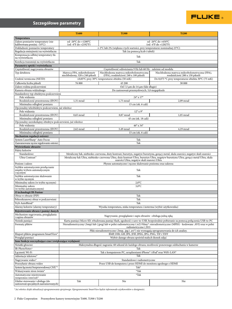 Szczegółowe parametry Ti400 Temperatura Zakres pomiarów temperatury (nie kalibrowana poniżej –10°C) Dokładność pomiarów temperatury Regulacja emisyjności na wyświetlaczu Kompensacja odbitej temperatury tła na wyświetlaczu Korekcja transmisji na wyświetlaczu Parametry optyki i wyświetlacza Częstotliwość nagrywania obrazów Typ detektora Czułość termiczna (NETD) od -20°C do +1200°C (od -4°F do +2192°F) Ti300 Ti200 od -20°C do +650°C (od -4°F do +1202°F) ± 2°C lub 2% (większa z tych wartości, przy temperaturze nominalnej 25°C) Tak (za pomocą liczb i tabeli) Tak Tak Częstotliwość odświeżania 9 Hz lub 60 Hz - zależnie od modelu Matryca FPA, mikrobolometr Niechłodzona matryca mikrobolometryczna Niechłodzona matryca mikrobolometryczna (FPA), niechłodzony, 320 x 240 pikseli (FPA), rozdzielczość 240 x 180 pikseli rozdzielczość 200 x 150 pikseli ≤0,05°C przy 30°C temperaturze obiektu (50 mK) Do 0,075 °C przy temperaturze obiektu 30°C (75 mK) Całkowita liczba pikseli 76 800 43 200 30 000 Zakres widma podczerwieni Od 7,5 μm do 14 μm (fale długie) Kamera obrazu widzialnego Do zastosowań przemysłowych, 5,0 megapiksele Standardowy typ obiektywu podczerwieni Pole widzenia 24° x 17° Rozdzielczość przestrzenna (IFOV) 1,31 mrad 1,75 mrad 2,09 mrad Minimalna odległość pomiaru 15 cm (ok. 6 cali) Opcjonalny teleobiektyw podczerwieni, już wkrótce Pole widzenia 12° x 9° Rozdzielczość przestrzenna (IFOV) 0,65 mrad 0,87 mrad 1,05 mrad Minimalna odległość pomiaru 45 cm (ok. 18 cali) Opcjonalny szerokokątny obiektyw podczerwieni, już wkrótce Pole widzenia 46° x 34° Rozdzielczość przestrzenna (IFOV) 2,62 mrad 3,49 mrad 4,19 mrad Minimalna odległość pomiaru 15 cm (ok. 6 cali) Mechanizm regulacji ostrości Tak System LaserSharp™ Auto Focus Zaawansowane ręczne regulowanie ostrości Tak Wyświetlanie obrazów Palety kolorów Standardowe Metaliczny łuk, niebiesko-czerwona, duży kontrast, bursztyn, negatyw bursztynu, gorący metal, skala szarości, negatyw skali szarości Ultra Contrast™ Metaliczny łuk Ultra, niebiesko-czerwona Ultra, duży kontrast Ultra, bursztyn Ultra, negatyw bursztynu Ultra, gorący metal Ultra, skala szarości Ultra, negatyw skali szarości Ultra Poziom i zakres Płynne automatyczne i ręczne skalowanie poziomu oraz zakresu Szybkie automatycznie przełączanie między trybem automatycznym Tak i ręcznym Szybkie automatyczne skalowanie Tak w trybie ręcznym Minimalny zakres (w trybie ręcznym) 2,0°C Minimalny zakres 3,0°C (w trybie automatycznym) O technologii IR-Fusion® Obraz w obrazie (PIP) Tak Pełnoekranowy obraz w podczerwieni Tak Tryb AutoBlend™ Tak Alarmy kolorów (alarmy temperatury) Wysoka temperatura, niska temperatura i izoterma (wybór użytkownika) Rejestrowanie obrazu i pamięć danych Mechanizm nagrywania, przeglądania Nagrywanie, przeglądanie i zapis obrazów –obsługa jedną ręką i zapisu obrazów Nośnik pamięci Karta pamięci Micro SD, wbudowana pamięć flash, zgodność z save-to-USB, bezpośrednie pobieranie za pomocą połączenia USB-to-PC Formaty plików Nieradiometryczny (.bmp) lub (.jpeg) lub w pełni radiometryczny (.is2) Filmy*: nieradiometryczne (MPEG - kodowane .AVI) oraz w pełni radiometryczne (.IS3) Pliki nieradiometryczne (.bmp, .jpg i .avi*) nie wymagają oprogramowania do ich analizy. Eksport plików programem SmartView® BMP, DIB, GIF, JPE, JFIF, JPEG, JPG, PNG, TIF i TIFF Przegląd pamięci Wybór danego obrazu spośród małych ikonek zdjęć Inne funkcje oszczędzające czas i zwiększające wydajność Notatki głosowe Maksymalna długość nagrania: 60 sekund do każdego obrazu; możliwość ponownego odsłuchania w kamerze IR-PhotoNotes™ Tak Łączność Wi-Fi Tak z komputerem PC, urządzeniami iPhone® i iPad® oraz WiFi-LAN* Tak Adnotacje tekstowe* Nagrywanie wideo* Przesyłanie obrazu wideo System łączności bezprzewodowej CNX™* Wskazywanie stron świata* Automatyczne rejestrowanie (temperatura i interwał)* Zdalne sterowanie i obsługa (do zastosowań specjalnych zaawansowanych) Standardowe i radiometryczne Przez USB do komputera i przez HDMI do monitora zgodnego z HDMI Tak* *Tak *Tak Tak Nie * Już wkrótce dzięki aktualizacji oprogramowania sprzętowego. Oprogramowanie SmartView będzie informowało użytkowników o dostępności. 2 Fluke Corporation Przemysłowe kamery termowizyjne Ti400, Ti300 i Ti200 Nie Parametry ogólne Temperatury pracy Temperatury przechowywania Wilgotność względna Solidny ekran dotykowy (pojemnościowy) Sterowanie i regulacja Oprogramowanie Akumulatory Czas pracy akumulatora Czas ładowania akumulatora Ładowanie akumulatorów z sieci Praca na zasilaniu sieciowym Oszczędzanie energii Normy bezpieczeństwa Kompatybilność elektromagnetyczna C Tick US FCC Wibracje Wstrząsy Upadek Wymiary (wys. x szer. x grub.) Waga (z akumulatorem) Szczelność obudowy Gwarancja Zalecany cykl kalibracji Obsługiwane języki od -10°C do +50°C od -20°C do 50°C bez akumulatorów 10% do 95% bez kondensacji Wyświetlacz LCD o przekątnej 8,9 cm (3,5"), poziomy, kolorowy VGA (640 x 480) z podświetleniem Wybór skali temperatur (°C/°F) Obsługiwane języki Ustawianie godziny/daty Regulacja emisyjności Kompensacja odbitej temperatury tła Korekcja transmisji Gorący punkt, zimny punkt i punkt środkowy na obrazie — do wyboru przez użytkownika Powiększane i pomniejszane okno pomiarowe z temperaturą MIN.-ŚRED.-MAKS. Alarmy kolorów Możliwość regulacji podświetlenia Preferencje wyświetlania informacji graficznych Dołączone pełne oprogramowanie analizujące i raportujące SmartView® i SmartView Mobile Dwa akumulatory litowo-jonowe bez efektu pamięci ze wskaźnikiem poziomu naładowania – 5 diod LED, wszystkie modele Ponad cztery godziny ciągłej pracy – każdy akumulator (przy 50% jasności ekranu LCD i przeciętnym użytkowaniu) 2,5 godziny do pełnego naładowania Ładowarka ładowarka sieciowa na 2 akumulat