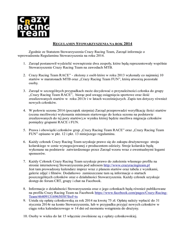 REGULAMIN STOWARZYSZENIA NA ROK 2014 Zgodnie ze Statutem Stowarzyszenia Crazy Racing Team, Zarząd informuje o wprowadzeniu Regulaminu Stowarzyszenia na roku 2014. 1. Zarząd postanowił wydzielić wewnętrznie dwa zespoły, które będą reprezentowały wspólnie Stowarzyszenie Crazy Racing Team na zawodach MTB. 2. Crazy Racing Team RACE” - złożony z osób które w roku 2013 wykonały co najmniej 10 startów w maratonach MTB oraz „Crazy Racing Team FUN”, którą utworzą pozostałe osoby. 3. Zarząd w szczególnych przypadkach może decydować o przynależności członka do grupy „Crazy Racing Team RACE”, biorąc pod uwagę osiągnięcia sportowe oraz ilość zrealizowanych startów w roku 2013r i w latach wcześniejszych. Zapis ten dotyczy również nowych członków. 4. W połowie sezonu 2014 (początek sierpnia) Zarząd przeprowadzi weryfikację ilości startów (ocena możliwości wykonania minimum startowego do końca sezonu na podstawie zrealizowanych do tej pory startów),w wyniku której będzie możliwa migracja członków pomiędzy grupami RACE i FUN. 5. Prawa i obowiązki członków grup „Crazy Racing Team RACE” oraz „Crazy Racing Team FUN” opisano w pkt. 12 i pkt. 13 niniejszego regulaminu. 6. Każdy członek Crazy Racing Team uzyskuje prawo się do zakupu drużynowego stroju kolarskiego w cenie wynegocjowanej z producentem odzieży. Stroje kolarskie będą wykonane na podstawie zatwierdzonego przez Zarząd wzoru wraz z ewentualnymi logami sponsorów. 7. Każdy Członek Crazy Racing Team uzyskuje prawo do założenia własnego profilu na stronie internetowej Stowarzyszenia pod adresem http://www.crazyracingteam.pl Jest tam prowadzony kalendarz imprez wraz z planem startów oraz tabela z wynikami, galerie zdjęć i filmów. Dodatkowo zamieszczane tam są informacje o startach poszczególnych członków oraz o działalności Stowarzyszenia. Każdy członek uzyskuje dostęp do forum CRT, grupy i chat na Facebook. 8. Informacje o działalności Stowarzyszenia oraz o jego członkach będą również publikowane na profilu Crazy Racing Team na Facebook https://www.facebook.com/pages/Crazy-RacingTeam/464091316965058?fref=ts 9. Ustala się opłatę członkowską za rok 2014 na kwotę 75 zł. Opłatę należy wpłacić do 31 stycznia 2014r na konto Stowarzyszenia, lub w przypadku przyjęć nowych członków w ciągu roku kalendarzowego w 14 dni od momentu wstąpienia do drużyny. 10. Osoby w wieku do lat 15 włącznie zwolnione są z opłaty członkowskiej. 11. Każdy członek Crazy Racing Team podpisuje oświadczenie o zapoznaniu się z regulaminem i zatwierdzeniu jego treści. 12. Prawa i obowiązki członków grupy ‘Crazy Racing Team RACE”; a) Każdy zawodnik grupy RACE zobowiązuje się do wykonania minimum 10 startów w maratonach MTB w roku 2014 r., w tym co najmniej jednej klasyfikacji generalnej dowolnego cyklu imprez: Mazovia MTB Marathon, Poland Bike Marathon, Maratony Kresowe, MTB Cross Maraton(dawne ŚLR), Legia MTB Marathon, MTB Marathon. Lista osób uprawnionych do uczestnictwa w grupie RACE zostanie podana do 31 grudnia 2013 r.. W przypadku niewykonania wyżej wymienionego zobowiązania, zawodnik zobowiązuje się do zwrotu otrzymanego dofinansowania zakupu stroju kolarskiego do dnia 31.12.2014 r. b) członek grupy może uzyskać dofinansowanie do kosztów zakupu drużynowych strojów kolarskich w wysokości określonej przez Zarząd, jeśli Stowarzyszenie pozyska sponsorów na rok 2014. Stroje kolarskie będą wykonane na podstawie zatwierdzonego przez Zarząd wzoru wraz z ewentualnymi logami sponsorów. c) członek grupy może uzyskać dofinansowanie do opłat startowych w wysokości określonej przez Zarząd, jeśli Stowarzyszenie pozyska sponsorów na rok 2014. Refundacja ta może zostać rozliczona po zakończeniu sezonu 2014, oznacza to, że każdy członek startuje w ciągu sezonu 2014 na własny koszt. d) członkowi grupy przysługuje prawo do korzystania z ulgowych grupowych opłat startowych w wysokości ustalonej przez Zarząd z organizatorami imprez kolarskich. Grupowe opłaty startowe będzie dokonywało Stowarzyszenie ze swojego konta. Członek grupy zobowiązuje się przelać na konto Stowarzyszenia równowartość opłaty startowej za daną imprezę co najmniej na 4 dni przed jej terminem. 12. Prawa i obowiązki członków grupy „Crazy Racing Team FUN”; a) członek grupy ma prawo uczestniczyć w dowolnej ilości edycji i startów maratonów MTB. b) członek grupy ma prawo do skorzystania ze zniżki na zakup drużynowego stroju kolarskiego wynegocjowanej przez Zarząd u producenta. Stroje kolarskie będą wykonane na podstawie zatwierdzonego przez Zarząd wzoru wraz z ewentualnymi logami sponsorów. c) członkowi grupy przysługuje prawo do korzystania z ulgowych grupowych opłat startowych w wysokości ustalonej przez Zarząd z organizatorami imprez kolarskich. Grupowe opłaty startowe będzie dokonywało Stowarzyszenie ze swojego konta. Członek grupy zobowiązuje się przelać na konto Stowarzyszenia równowartość opłaty startowej za daną imprezę co najmniej na 4 dni przed jej terminem. d) członkowie grupy przysługuje prawo przeniesienia do grupy „Crazy Racing Team RACE” w wyniku weryfikacji startów opisanej w punkcie 4 regulaminu.