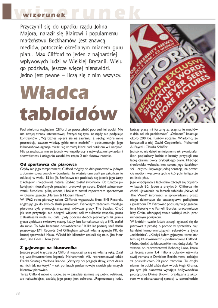 wizerunek wizerunek 9[cbLcbWRũ \R¢ MX ^YJMT^ [cM^ 3XQWJ 6JSX[J WJ[JcRũ \R¢ +UJR[X`R R YXY^UJ[WNV^ VJũŖNĢ\]`^ +NLTQJVß` 3N\] cWJ`L VNMRß` YX]XLcWRN XT[NĵUJWbV VRJWNV P^[^ YRJ[^ 6Ja ,UROOX[M ]X SNMNW c WJSKJ[McRNS `Yũb`X`bLQ U^McR ` @RNUTRNS +[b]JWRR @RNU^ PX YXMcR`RJ SN\cLcN `R¢LNS WRNWJ`RMcR 3NMWX SN\] YN`WN o URLc \R¢ c WRV `\cb\Lb Władca tabloidów ;ZO bTPWZXL beRWíOLXT .WTQQZ]O _Z [ZeZ^_LčZĦÛ [Z[]ePOYTPU P[ZVT 9TP XL ^bZUPU ^_]ZYd TY_P]YP_ZbPU >eNedNT ^Tí _dX ŇP YTROd YTP [ZO[T^`UP VZY_]LV_Çb k8ÇU MTeYP^ Z[TP]L ^Tí YL eL`QLYT` L Z^ZMd V_Ç]P XYTP [Z_]ePM`UÙ eLb^eP bTPOeÙ ROeTP XYTP eYLWPŅÛu w [ZO^`XZb`UP 5PRZ VTWV`Z^ZMZbLLRPYNULXTPĦNT^TíbXLčPUVWT_NPYLOM`_TVTPXb7ZYOdYTP 9TP []eP^eVLOeL X` _Z UPOYLV bP b^[Çč[]LNd e YLUbTíV^edXT RbTLeOLXT ^SZbMTeYP^` T Z^TÙRLYT` eL]ZMVÇb ]eíO` XWY Q`Y_Çb]ZNeYTP Od sportowca do piarowca 2OdMdYTPUPRZ_PX[P]LXPY_.WTQQZ]OXÇRčMdOZOeTĦ[]LNZbLÛbUPOYdX eOZXÇb_ZbL]ZbdNSb7ZYOdYTP?ZbčLĦYTP_LX_]LQTč[ZeLVZďNePYT` PO`VLNUTbbTPV` WL_>ePQZ^_b`YTP[ZOZMLčd^TíUPOYLVUPRZŇL]_d e VZWPRÇb T YTP[ZVZ]YL YL_`]L >edMVZ eZ^_Lč ebZWYTZYd :O _`čLNeVT [Z VZWPUYdNS YTP_]LQTZYdNS [Z^LOLNS `]L_ZbLč RZ ^[Z]_ /eTíVT eLTY_P]P^Z bLYT` Q`_MZWPX [TčVÙ bZOYÙ T MZV^PX eZ^_Lč ]P[Z]_P]PX ^[Z]_ZbdX b WZVLWYPU RLePNTP k8P]_ZY 8ZOP]Y 9Pb^u B $! ]ZV` [TL]Zbd _LWPY_ .WTQQZ]OL bd[L_]edčL QT]XL 084 =PNZ]O^ LYRLŇ`UÙN RZ OZ ^bZTNS ^č`ŇM []L^ZbdNS ;TP]b^edX eLOLYTPX XčZOPRZ [TL]ZbNL MdčL []ZXZNUL YTPeYLYPU bÇbNeL^ R]`[d ?SP -PL_WP^ .SZÛ ULV ^LX []edeYLUP YTP ZOPR]Lč bTíV^ePU ]ZWT b ^`VNP^TP eP^[Zč` []LNL e -PL_WP^LXT bTPWP X` OLčL k2Od [ZONeL^ ObÇNS [TP]b^edNS WL_ R]LYTL R]`[Led^VTbLčLĦbTL_ZbÙ^čLbíVLŇOdV_ZVZY_LV_ZbLč^Tíe084_]LQTLč OZ XYTP ?Z MdčZ MPeNPYYP OZĦbTLONePYTPu 6TWVL WL_ [ÇŅYTPU ^ePQ OeTLč` []L^ZbPRZ 084 =PNZ]O^ >dO 2TWWTYRSLX eLčZŇdč bčL^YÙ LRPYNUí ;= OZ V_Ç]PU ^[]ZbLOeTč 8LcL BĦ]ÇO TNS VWTPY_Çb eYLWPŅWT ^Tí XTY 5TX 3PY O]Tc -PP 2PP^T ?ZX 5ZSY^ Z gajowego na kłusownika 5P^eNeP[]ePO_]edOeTP^_VÙ.WTQQZ]O]Ze[ZNeÙč[]LNíYLbčL^YÙ]íVíELUÙč ^Tí b^[Çč_bZ]ePYTPX WPRPYOd 8ZSLXXPOL ,WT ]P[]PePY_ZbLč _LVŇP 1]LYVL>TYL_]íT8L]WZYL-]LYOZkB^ed^NdZYT[]LRYíWT^čLbdV_Ç]LOeTLčL YL YTNS ULV YL]VZ_dVu w _LV [Z WL_LNS [ZO^`XZb`UP ^bZTNS [TP]b^edNS VWTPY_Çb [TL]ZbTPN ?P]Le .WTQQZ]O XÇbT Z ^ZMTP ŇP b eL^LOeTP eLUX`UP ^Tí [`MWTN ]PWL_TZY^ LWP YLUbLŇYTPU^eÙ NeíĦNTÙ UPRZ []LNd UP^_ ZNS]ZYL k=P[]PePY_`Uí W`OeT # V_Ç]ed [čLNÙ XT QZ]_`Yí eL _]edXLYTP XPOTÇb e OLWL ZO TNS []ZMWPXÇbu k:NS]ZYLu VZ^e_`UP ZVZčZ _d^ Q`Y_Çb ]ZNeYTP BTLOZXZ ŇP VZ]ed^_LWT e YTPU /LaTO .Z[[P]QTPWO 8ZSLXPO ,W1LdPOT .WL`OTL>NSTQQP] 5POYLV_ZYTPOeTíVT`XTPUí_YPX``V]dbLYT`LQP] TVZY [Z[V`W_`]d W`OeTP e M]LYŇd []ed[TíWT X` čL_Ví NeL]YPU ZbNd M]d_dU^VTPRZ [TL]` 9TPNSíÛ Ħ]ZOZbT^VLbeM`OeLTYYL^_]ZYLUPRZOeTLčLWYZ ĦNTwNeí^_Z`V]dbLUÙNUPOYÙ^PY^LNUíYL[ZŇL] NTPXPOTZXbd^_LbTL_dNS`V_Ç]dNSYTPQTR`]`UP YL WTĦNTP [čLN 5PRZb^[Çč[]LNLe_LMWZTOLXTeLNeíčL^TíOZ[TP]Z b WL_LNS # 5POPY e []edULNTÇč .WTQQZ]OL YTP NSNTLč `ULbYTPYTL YL čLXLNS _LMWZTO` k9Pb^ ZQ ?SP BZ]Ou TYQZ]XLNUT Z ^[]ZbLOeLYT` []ePe YTPRZ OeTPbNedY OZ _ZbL]ed^_bL [ZWT_dVZX TRbTLeOZX?A;TL]ZbTPN[ZO^`YÙčbTíNRLePNTP TYYÙ ST^_Z]Tí w Z ;LXPWWT -Z]OP^ []LNZbYTNeNP 4eMd 2XTY ZQP]`UÙNPU ^bZUP bOeTíVT XTY []Z XTYPY_YdX [ZWT_dVZX B V]Ç_VTX NeL^TP W`OeTP eLNeíWT eRčL^eLÛ ^Tí OZ [TL]ZbNL e []ZĦMÙ Z [ZXZN b ^[]ePOLŇd YLU ML]OeTPU VZX[]ZXT_`UÙNdNS ^PV]P_Çb e ŇdNTL kNPWPM]T_TP^uk6TPOdĦMdčPXRLUZbdX_P]Le^_L čPX^TíVč`^ZbYTVTPXuw[ZO^`XZb`UP.WTQQZ]O 8ZŇYLOZOLÛŇPVč`^ZbYTVTPXYLO`ŇÙ^VLWí?Z bčLĦYTP ZY ]P[]PePY_ZbLč =PMPNNí 7ZZ^ V_Ç]L eL čÙNeYÙ ^`Xí XTWTZYL OZWL]Çb `ULbYTčL ^bÇU ]ZXLY^ e /LaTOPX -PNVSLXPX ZOOLUÙN eL [ZĦ]POYTN_bZ []ZN eL]ZMV` ?Z OeTíVT YTPX`YTP`NTNSč_LVŇP^VZVbMZV3`RS2]LY_L [Z _dX ULV [TL]ZbNL bdYLUíčL SZWWdbZZOeVL []Z^_d_`_VL /TaTYP -]ZbY []edčL[LYL e LV_Z ]PX b YTPOb`eYLNeYPU ^d_`LNUT b ^LXZNSZOeTP wizerunek k4YQZ]XLNUL WPNTLu ULV OeTPYYTV k?SP 8T]]Z]u YLebLč bTLOZXZĦÛ ZNTÙŇd .SP]TP-WLT]_LVŇPbd^ečL^[ZOUPRZ [TÇ]L .SZNTLŇbO`ŇPUXTP]eP[]LNL.WTQQZ]OL_Z`[`MWTNeYTLYTPTYQZ]XLNUTV_Ç]P YTP XTLčd `U]ePÛ ĦbTL_čL OeTPYYPRZ MdYLUXYTPU YTP ^[íOeL X` ZYL ^Y` e [ZbTPV k/Z^_L]NeLX _PRZ NePRZ W`OeTP [Z_]ePM`UÙ BčLĦYTP Z _LVTNS _PXL_LNS NSNÙ Ned_LÛu w _bTP]OeT [TL]ZbTPN YLedbLUÙN M]d_dU^VTP M]` VZbNPYLUML]OeTPUO]L[TPŇYdXTXPOTLXTĦbTL_L;ZOZMYPRZeOLYTLUP^_Mdčd bdOLbNLk>`YOLd?TXP^u,YO]Pb9PTW%k?LMWZTOd^_LUÙ^TíNZ]LeRZ]^ePLWP YTPXZŇPXdRZeL_ZZMbTYTLÛ:YYTP_bZ]ed_LMZTOÇbZYTX_dWVZ`čL_bTL []LNí2OdMd8Lc.WTQQZ]OYTPT^_YTLčeYLWPŅWTMdVZRZĦTYYPRZu 9TPb^ed^Nd^ÙUPOYLVLŇ_LVbd]Ze`XTLWTk5PRZ[]LNL[ZWPRLYLV`^ePYT` W`OeTMd[ÇŅYTPU^[]ePOLÛTNSO`^eí5P^_8PQT^_ZQPWP^PXYL^edNSNeL^Çbu w [ZO^`XZb`UP[TL]ZbNL[T^L]VL,WWT^ZY;PL]^ZY 1Z_%85 Pieniądze to nie wszystko b [ZčZbTP WL_ $ .WTQQZ]O XTLč _PŇ ^bÇU `OeTLč b `VLeLYT` ^Tí UPOYPRZ e YLU^čdYYTPU^edNS _d_` čÇbbST^_Z]TTM]d_dU^VTNSM]`VZbNÇbBXL]N` $#! ]ZV` _LMWZTO k?SP >`Yu Z[`MWTVZbLč _PV^_ k1]POOTP >_L]] eULOč XZUPRZ NSZXTVLu .WTQQZ]O V_Ç]d ZO[ZbTLOLč bÇbNeL^ eL ;= LV_Z]L YTP b^_]edXLč[`MWTVLNUT@eYLčŇP[]edNedYT^TíZYL OZbe]Z^_`[Z[`WL]YZĦNTRbTLeOd9TPXdWTč^Tí 8POTL[ZVZNSLčd>_L]]LLYLST^_Z]TTZNSZXTV` LV_Z] eL]LMTLč []ePe VZWPUYdNS VTWVLYLĦNTP WL_ Czytelnik nasz pan :R]ZXYdb[čdbYLŇdNTP.WTQQZ]OLb_dX]Çb YTPŇYLUPRZbdMZ]deLbZOZbPbdbL]čZb^[TP ]LYTP ZO YLUXčZO^edNS WL_ UPRZ UPOdYPU NÇ]VT b bLWNP e eL[LWPYTPX ]P`XL_ZTOLWYdX ^_LbÇb 5LV b^[ZXTYL ^LX []ePVZYLč ^Tí bÇbNeL^ ULV QL_LWYTPOeTLčL[`MWTNeYL^č`ŇMLeO]ZbTLbBTPW VTPU -]d_LYTT T ULV UPU ^_LY [ZRL]^eL ^Tí b _]LVNTP ]eÙOÇb VZY^P]bL_d^_Çb -dč _Z TX[`W^ OZ b^e NeíNTL []dbL_YPU V]`NUL_d []ePNTb ]eÙOZX []P XTP]L5ZSYL8LUZ]Lk4XML]OeTPU[]edRWÙOLX^Tí bčLOed_dXbTíNPUbTOeíST[ZV]deUT[ZObÇUYdNS ^_LYOL]OÇbTVZ]`[NUTuw_bTP]OeTč[`MWTNeYTPYTP OZOLUÙN RčZ^Çb ]eÙOZbT B bdbTLOeTP e ,YO]Pb /PY_ZYPX OWL _PWPbT eUT ,-. b XLU` ]ZV` .WTQQZ]O bdeYLč ŇP [ZVLedbLYTPW`OeTZXYLNedXYL[]LbOíeLWPŇd ]eÙOZbT ^[]LbTL X` bTPWVÙ