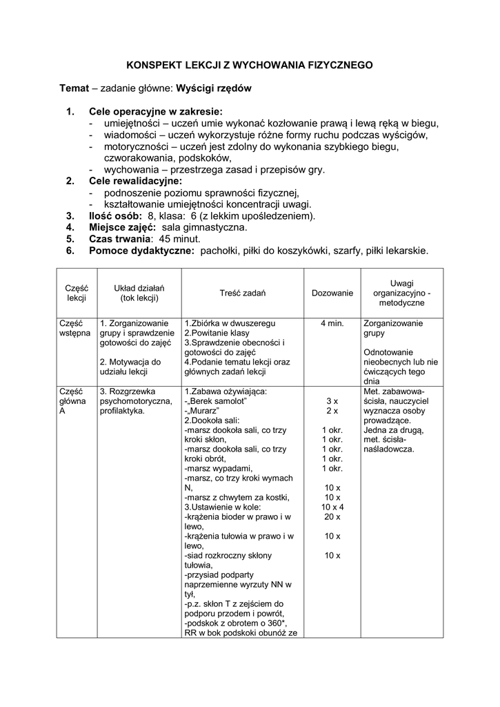 KONSPEKT LEKCJI Z WYCHOWANIA FIZYCZNEGO Temat – zadanie główne: Wyścigi rzędów 1. 2. 3. 4. 5. 6. Cele operacyjne w zakresie: - umiejętności – uczeń umie wykonać kozłowanie prawą i lewą ręką w biegu, - wiadomości – uczeń wykorzystuje różne formy ruchu podczas wyścigów, - motoryczności – uczeń jest zdolny do wykonania szybkiego biegu, czworakowania, podskoków, - wychowania – przestrzega zasad i przepisów gry. Cele rewalidacyjne: - podnoszenie poziomu sprawności fizycznej, - kształtowanie umiejętności koncentracji uwagi. Ilość osób: 8, klasa: 6 (z lekkim upośledzeniem). Miejsce zajęć: sala gimnastyczna. Czas trwania: 45 minut. Pomoce dydaktyczne: pachołki, piłki do koszykówki, szarfy, piłki lekarskie. Część lekcji Układ działań (tok lekcji) Część wstępna 1. Zorganizowanie grupy i sprawdzenie gotowości do zajęć 2. Motywacja do udziału lekcji Część główna A 3. Rozgrzewka psychomotoryczna, profilaktyka. Treść zadań 1.Zbiórka w dwuszeregu 2.Powitanie klasy 3.Sprawdzenie obecności i gotowości do zajęć 4.Podanie tematu lekcji oraz głównych zadań lekcji 1.Zabawa ożywiająca: -„Berek samolot” -„Murarz” 2.Dookoła sali: -marsz dookoła sali, co trzy kroki skłon, -marsz dookoła sali, co trzy kroki obrót, -marsz wypadami, -marsz, co trzy kroki wymach N, -marsz z chwytem za kostki, 3.Ustawienie w kole: -krążenia bioder w prawo i w lewo, -krążenia tułowia w prawo i w lewo, -siad rozkroczny skłony tułowia, -przysiad podparty naprzemienne wyrzuty NN w tył, -p.z. skłon T z zejściem do podporu przodem i powrót, -podskok z obrotem o 360*, RR w bok podskoki obunóż ze Dozowanie 4 min. 3x 2x 1 okr. 1 okr. 1 okr. 1 okr. 1 okr. 10 x 10 x 10 x 4 20 x 10 x 10 x Uwagi organizacyjno metodyczne Zorganizowanie grupy Odnotowanie nieobecnych lub nie ćwiczących tego dnia Met. zabawowaścisła, nauczyciel wyznacza osoby prowadzące. Jedna za drugą, met. ścisłanaśladowcza. Część główna B 4. Kształtowanie umiejętności i doskonalenie sprawności w różnych zakresach. Część 5.Uspokojenie końcowa organizmu 6. Podsumowanie lekcji skrętem tułowia. 1. Podział na 2 drużyny, każda drużyna ustawiona w rzędzie na czerwonej linii, siad skrzyżny. Ustawienie pachołków. Wygrywa drużyna która pierwsza dokładnie wykona ćwiczenie i ustawi się w pozycji wyjściowej. 2.Zadania: -bieg dookoła pachołka, -skoki na pN do pachołka, z powrotem bieg, -czworaki do pachołka, z powrotem bieg, -skoki na lN do pachołka, z powrotem bieg, -raki do pachołka z piłką lekarską, z powrotem bieg, -prowadzenie kija z ringo po slalomie -wyścigi lawiną, -kozłowanie piłki tam i z powrotem pR, -toczenie piłki tam i z powrotem, -kozłowanie piłki tam i z powrotem lR, -1 os. bieg z piłką zostawia ją przy pachołku, 2 os. zabiera piłkę, -bieg do szarfy przełożenie od góry, biegnąc z powrotem od dołu. 1.Ćwiczenia uspakajające: -siad skrzyżny w kole RR na kolanach, próba wstania z siadu bez pomocy RR. 2 min. 1x 1x 1x 1x 1x 1x 1x 1x 1x 1x 1x 1x 6x 3 min. 2.Podsómowanie dydaktyczno – wychowawcze. 7.Nastawienie do samodzielnych zajęć 3.Zalecenia i instrukcje do samodzielnego usprawniania się. 4. Pożegnanie. Prowadzący: Ryszard Jarzyna Opracowała: Anna Żbikowska Met. zadaniowaścisła. N. jest sędzią, zwrócenie uwagi na dokładne wykonywanie zadań. Podsumowanie wyłonienie zwycięskiej drużyny.